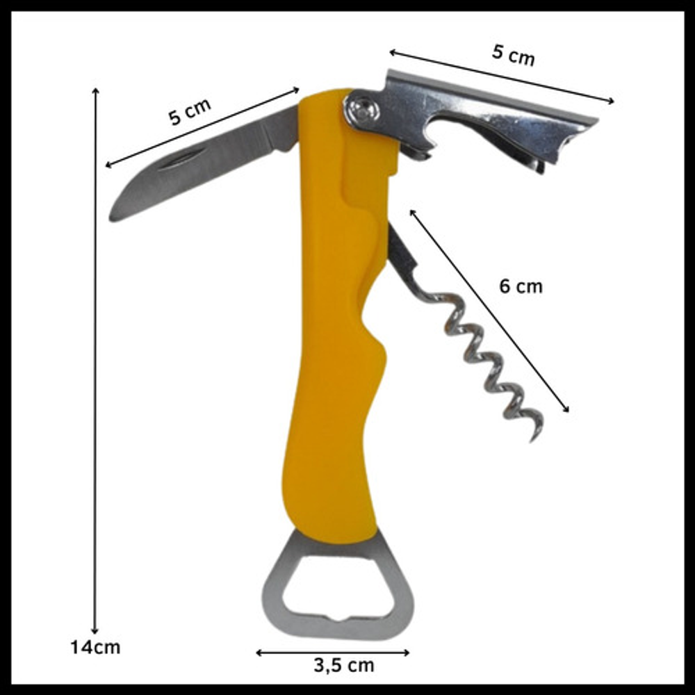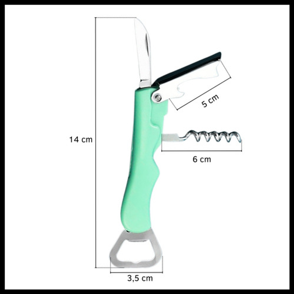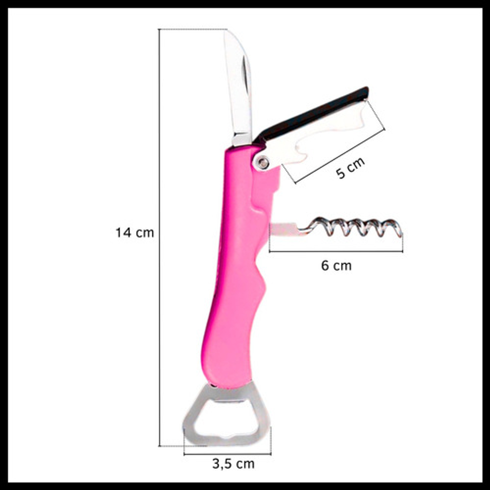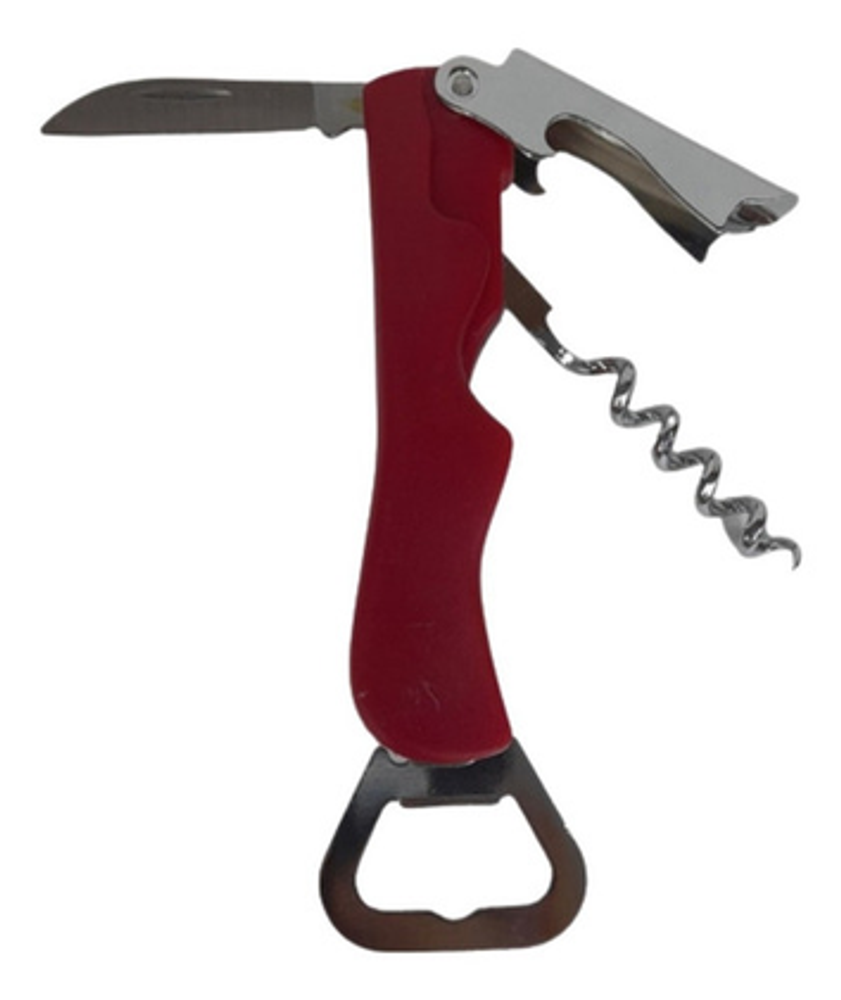 Características: • Cuerpo de plástico. • Hojas de acero inoxidable. • Práctico y liviano con una apertura sin esfuerzo. • Kit todo en uno: Posee 3 funcionalidades. Destapador, sacacorchos y cortador.