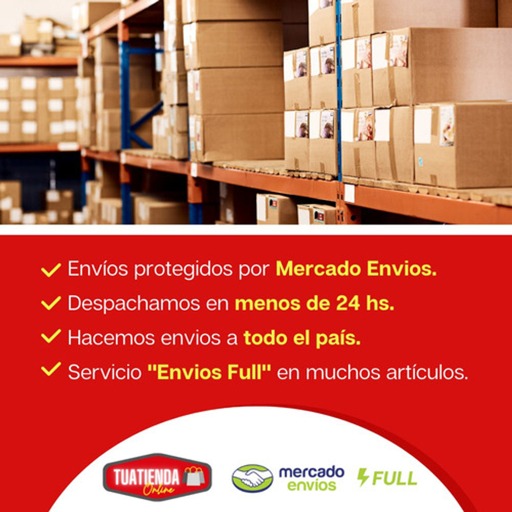 • Despachamos tu compra en menos de 24 horas. • Envíos a Todo el País a través de MercadoEnvios • No cobramos embalaje ni extras. • Medios de pagos aceptado: MercadoPago ( Seguridad y tranquilidad )