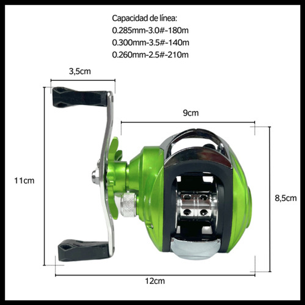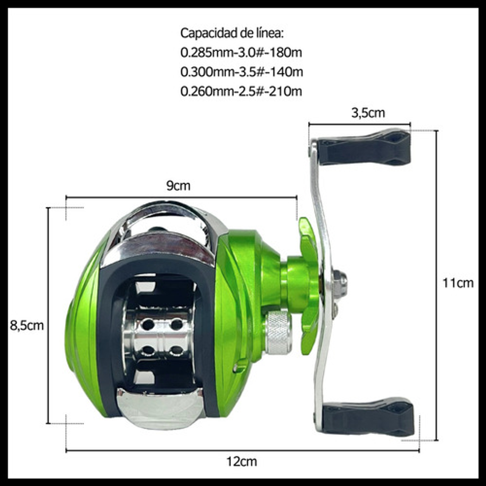Capacidad de la línea: 0.260mm - 2.5# - 210 m. 0.285mm - 3.0# - 180 m. 0.300mm - 3.5# - 140 m.