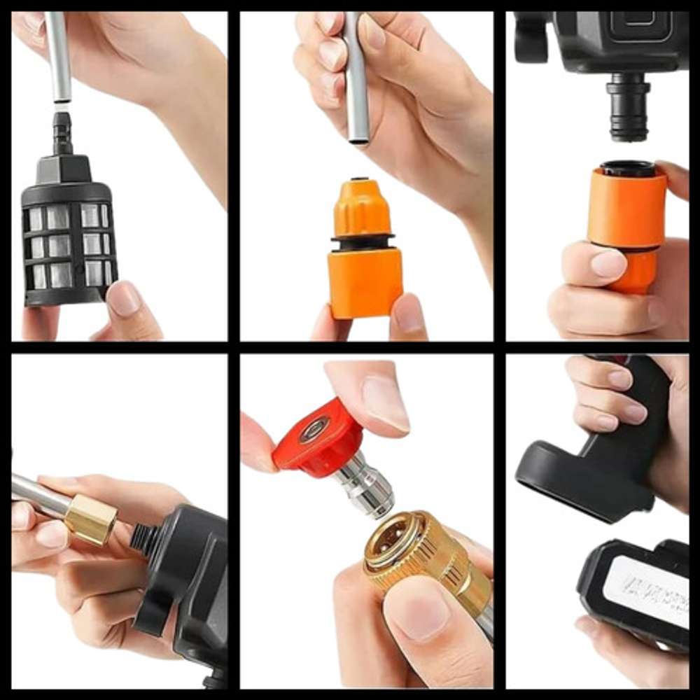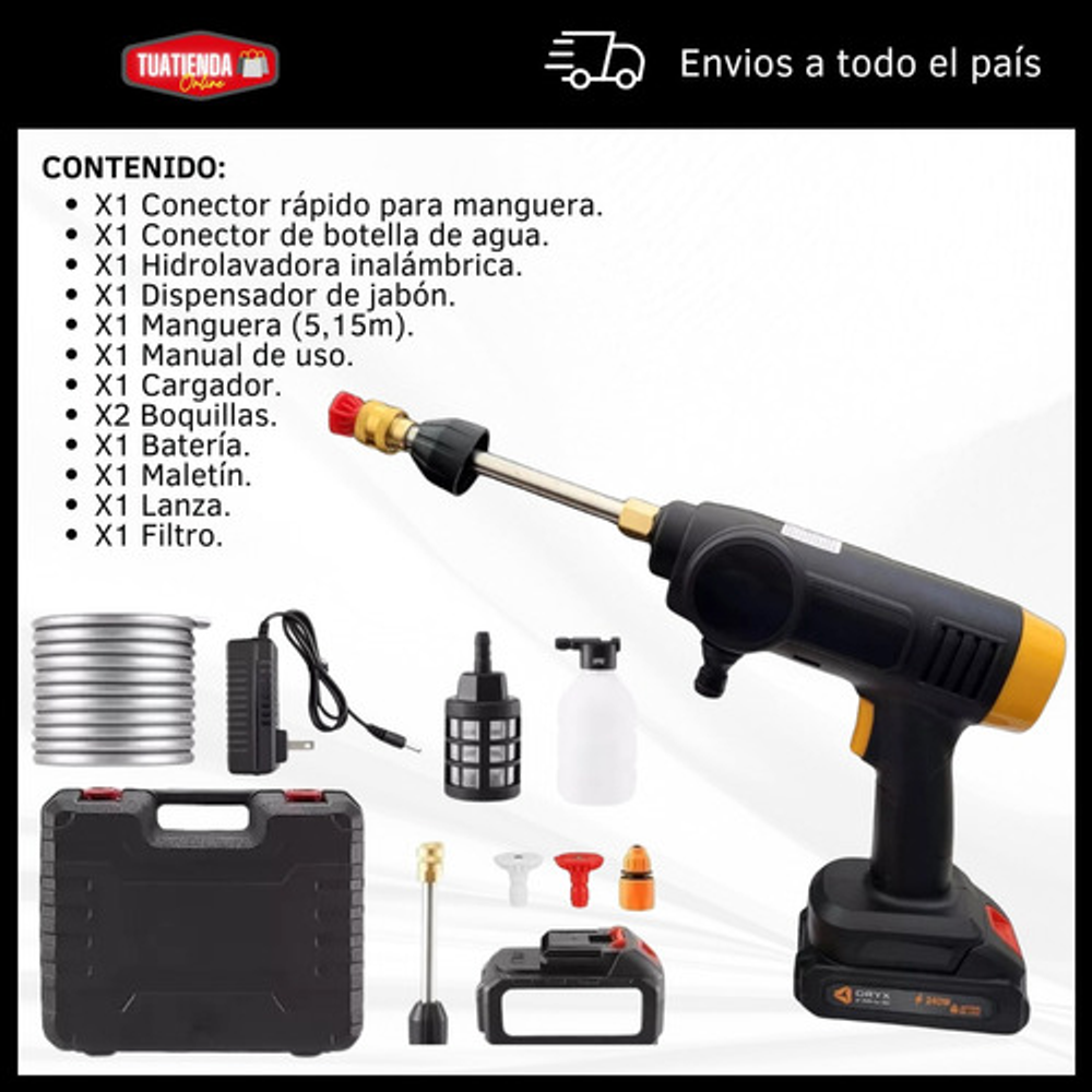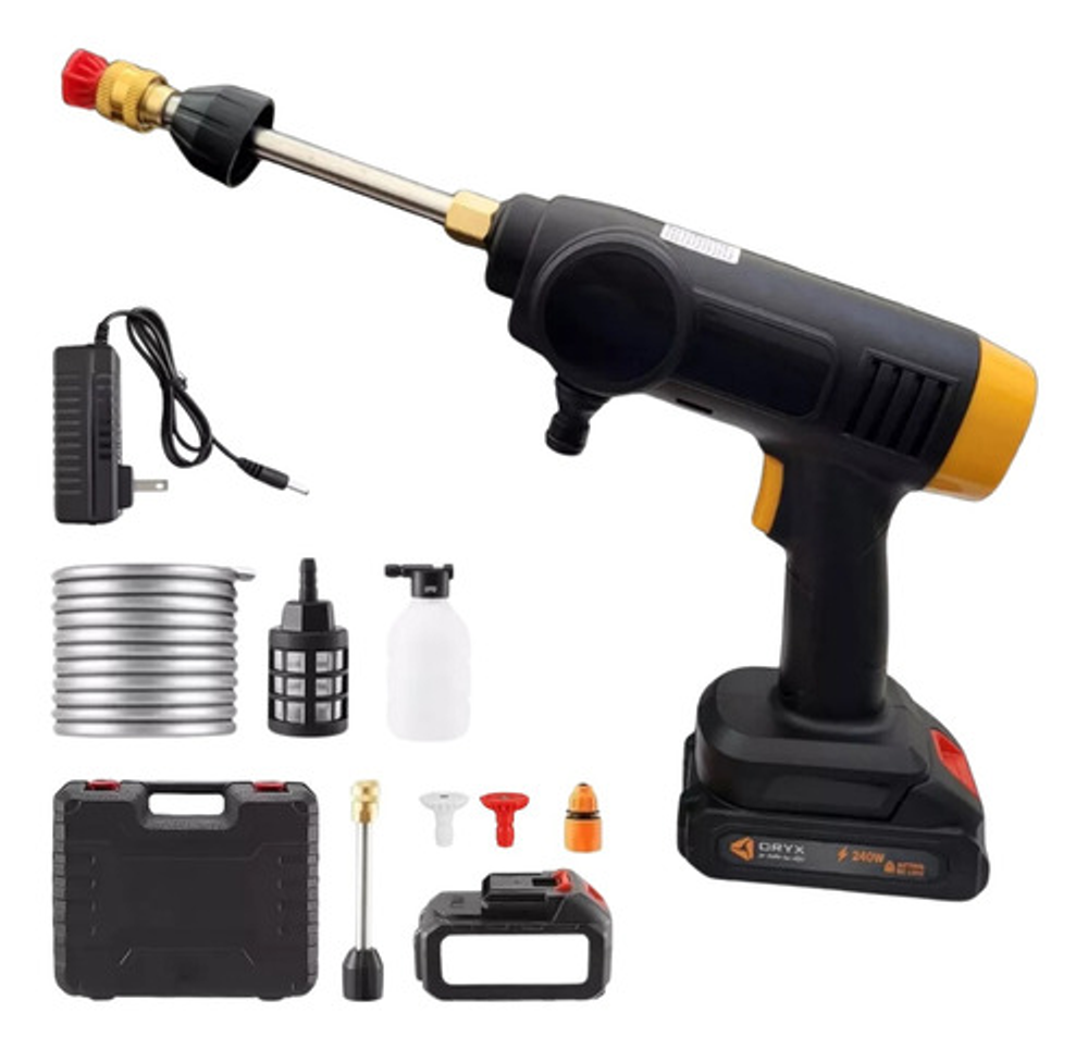 Accesorios incluidos: Batería,Boquillas,Cargador,Conector de botella de agua,Conector rápido,Dispensador de jabon,Filtro,Lanza,Maletín,Manguera