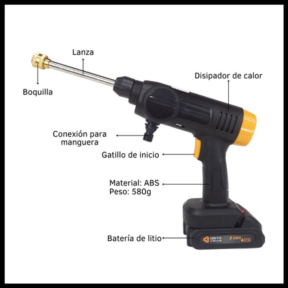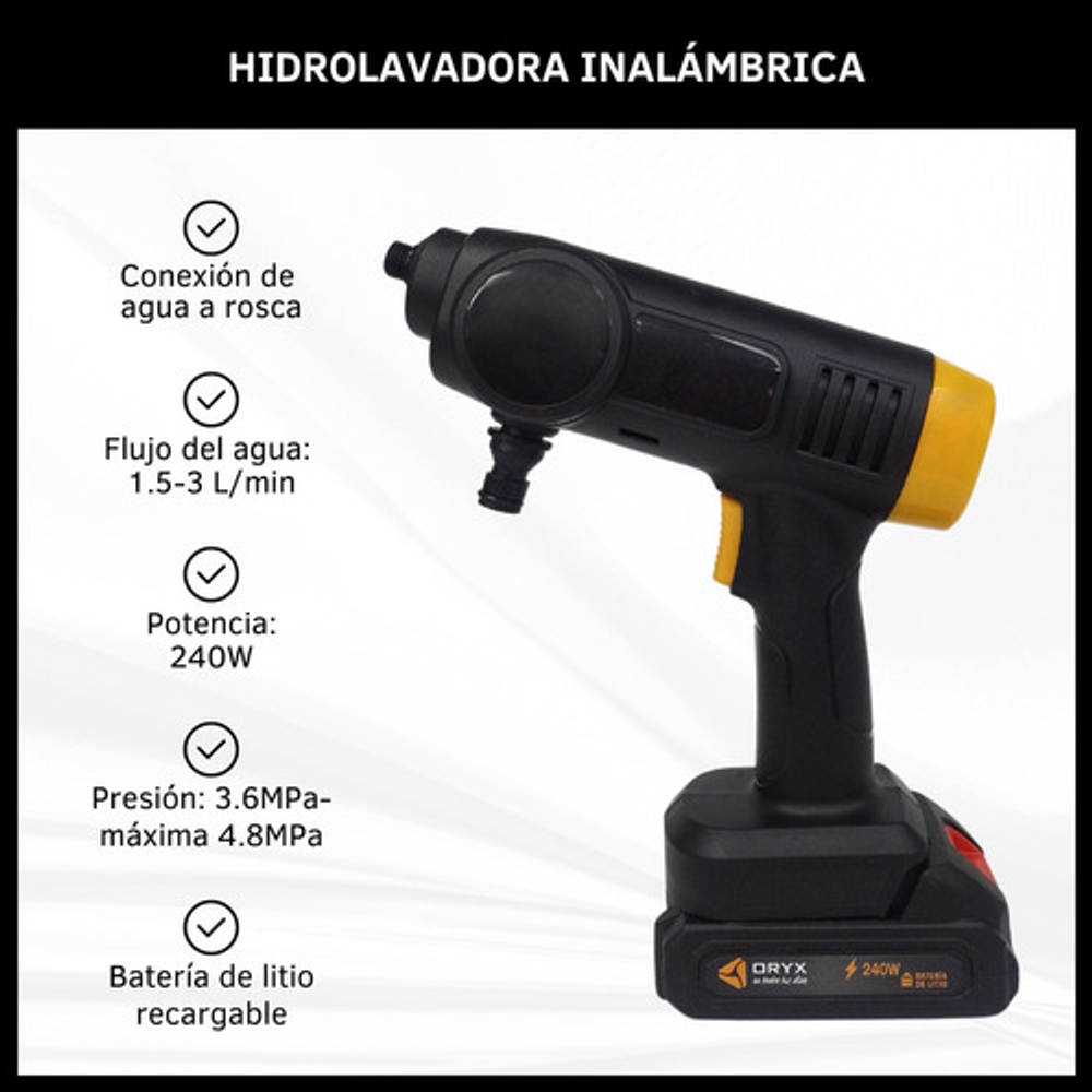 Características: • Peso hidrolavadora: 580g / Peso total: 1,835kg. • Presión: 3.6MPa / Presión máxima: 4.8MPa. • Conexión de agua a rosca. • Batería recargable de litio. • Flujo de agua: 1.5-3L/min. • Potencia: 240W. • Material: ABS.