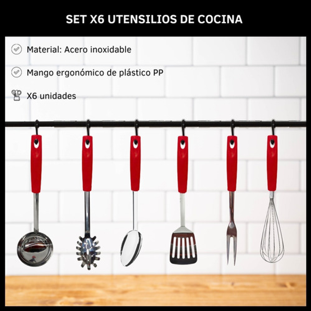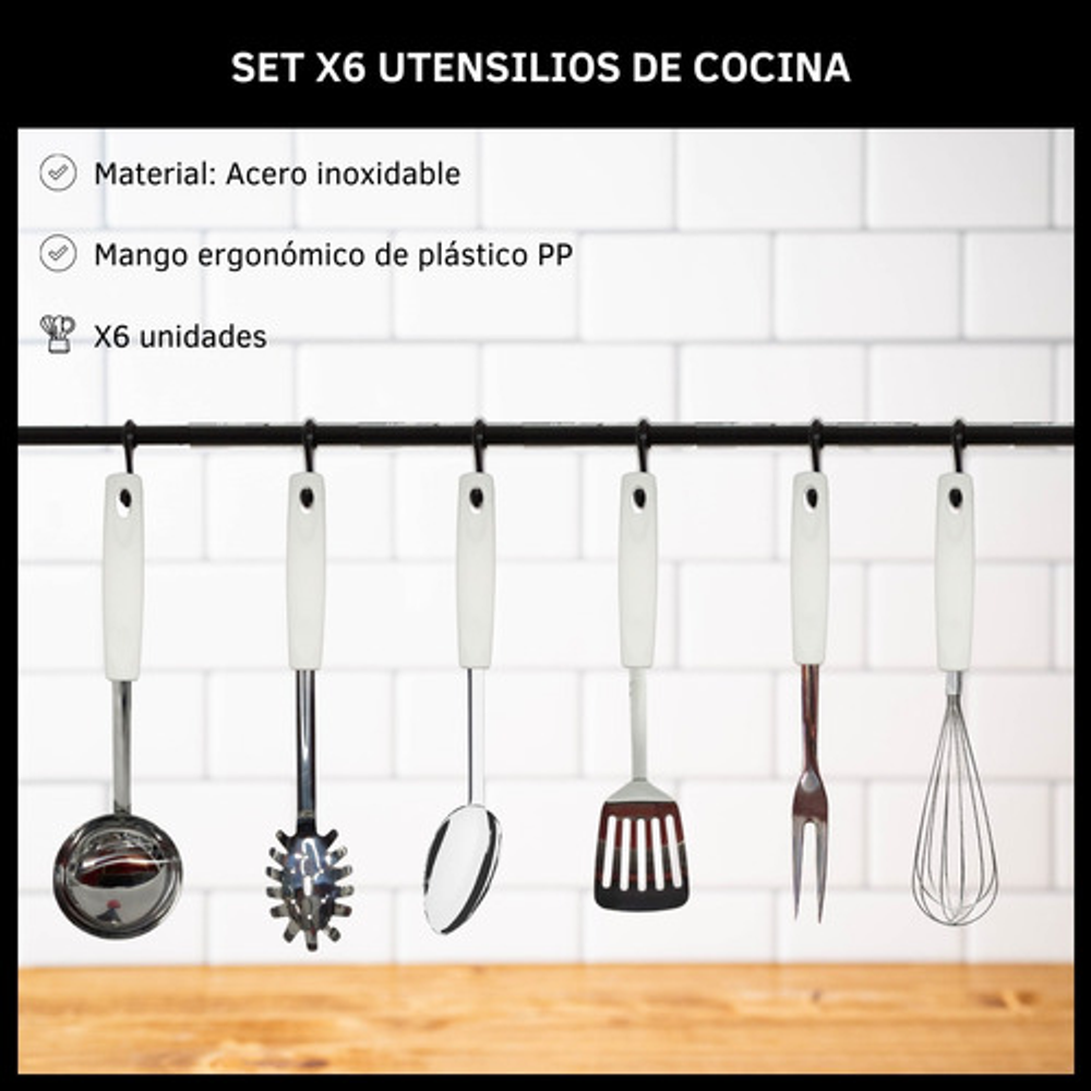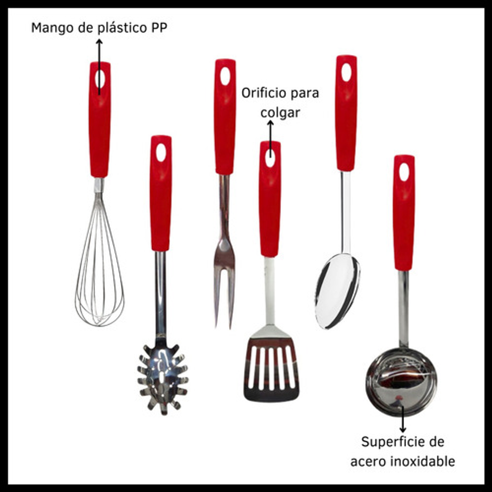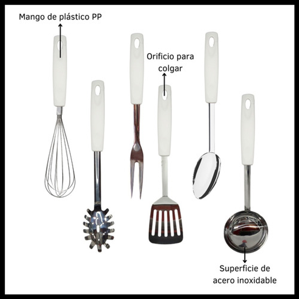 Características: • Incluye: 1 batidor manual, 1 cucharon, 1 cuchara para arroz, 1 tenedor trinchante, 1 espátula y 1 cuchara espaguetera. • Hechas de acero inoxidable. • Mango de plástico PP. • Orificio para colgar. • Prácticas y fáciles de limpiar. • Aptas para lavavajillas. • Agarre cómodo y práctico.