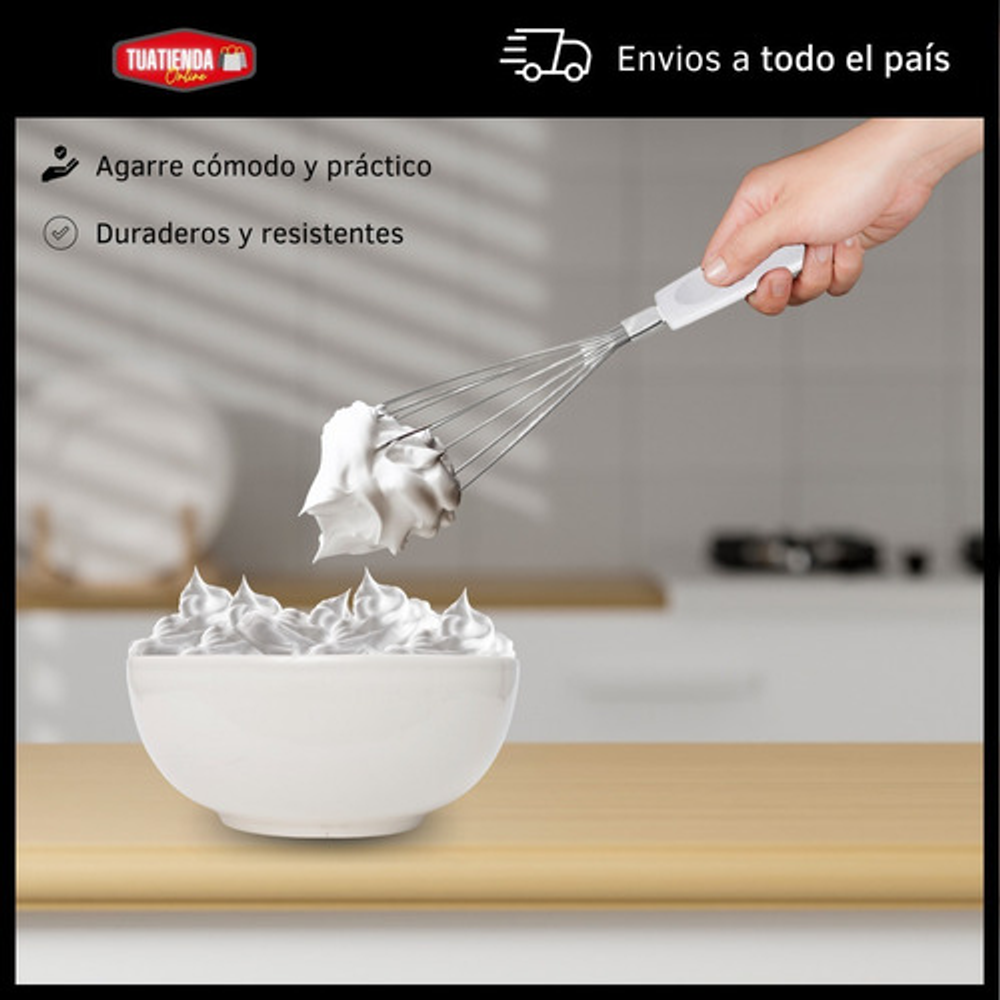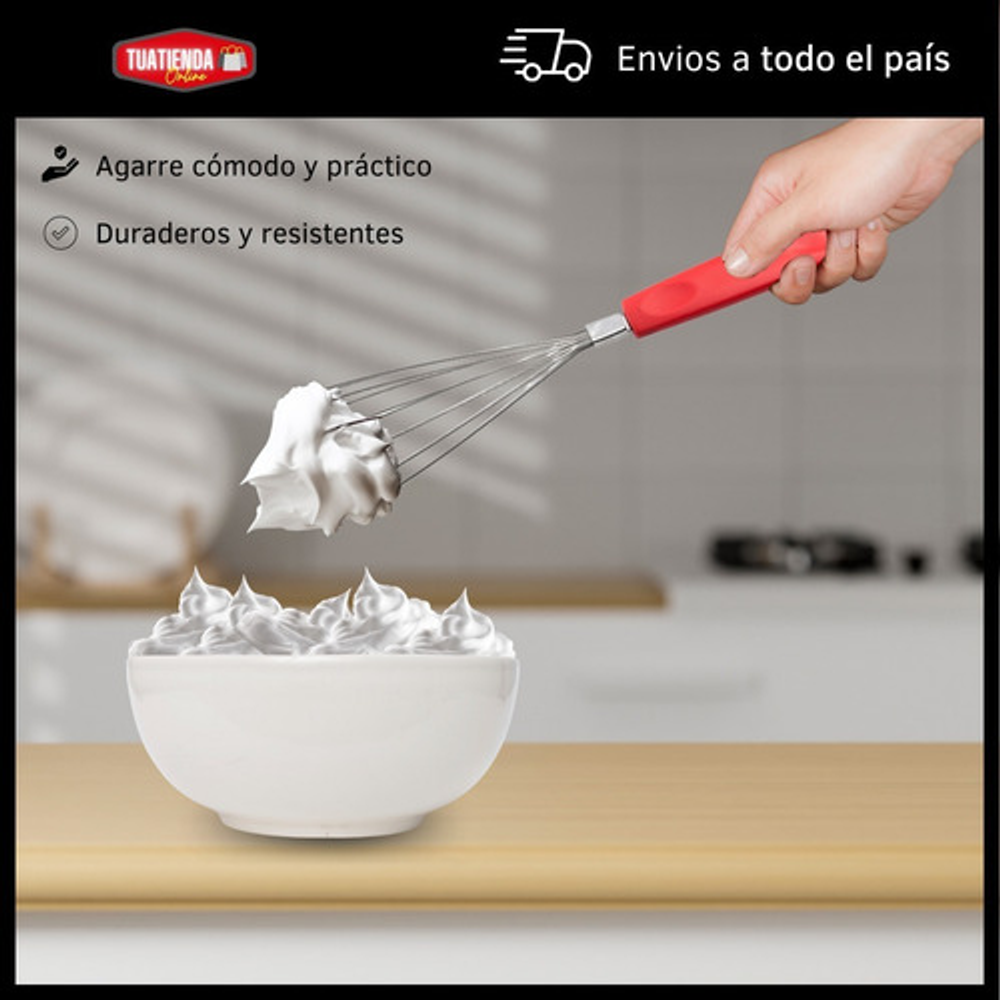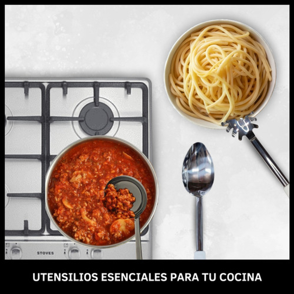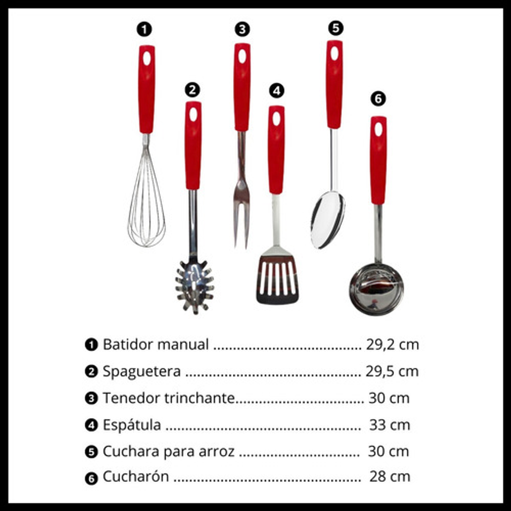 Características: • Incluye: 1 batidor manual, 1 cucharon, 1 cuchara para arroz, 1 tenedor trinchante, 1 espátula y 1 cuchara espaguetera. • Hechas de acero inoxidable. • Mango de plástico PP. • Orificio para colgar. • Prácticas y fáciles de limpiar. • Aptas para lavavajillas. • Agarre cómodo y práctico.