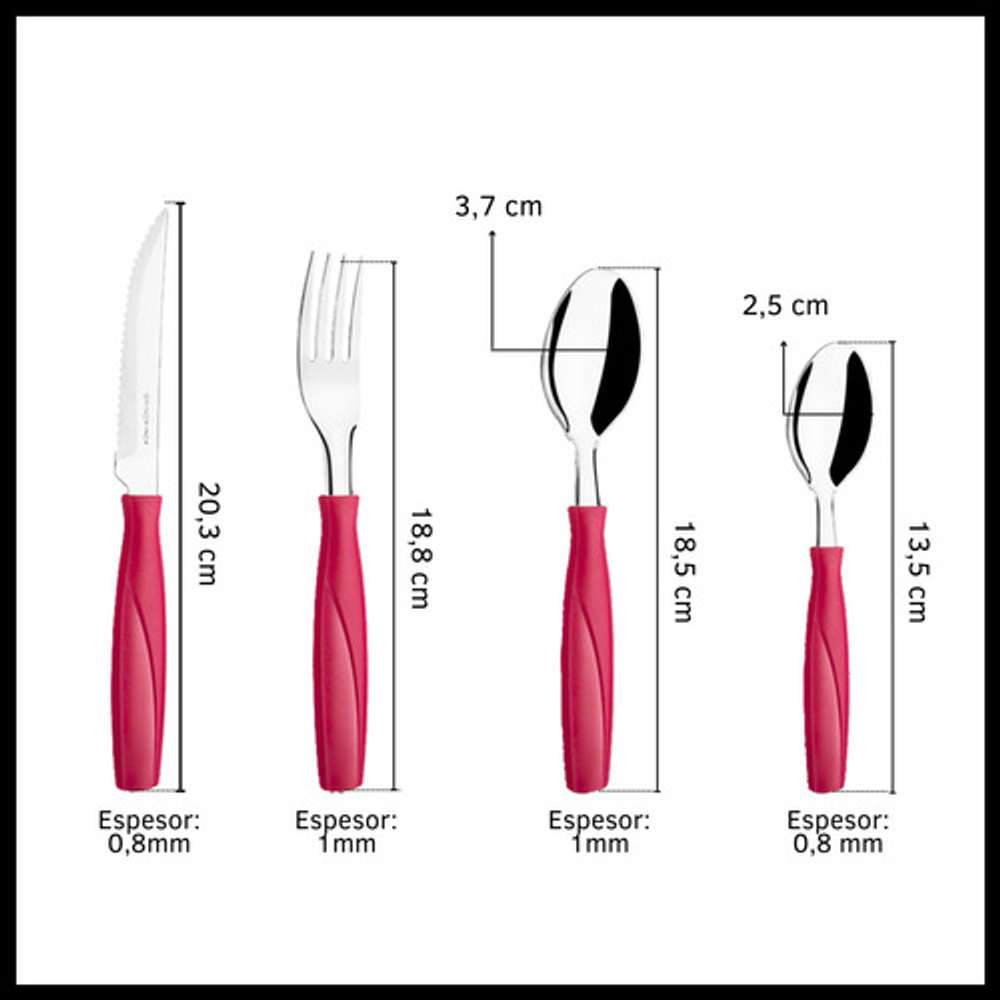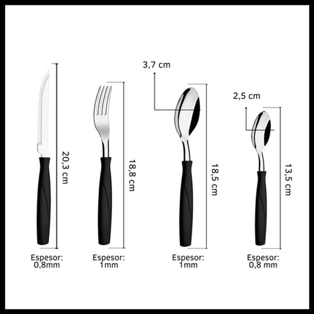 Cubiertos incluidos: 6 Cucharas de mesa,6 Cucharas pequeñas,6 Cuchillos,6 Tenedores