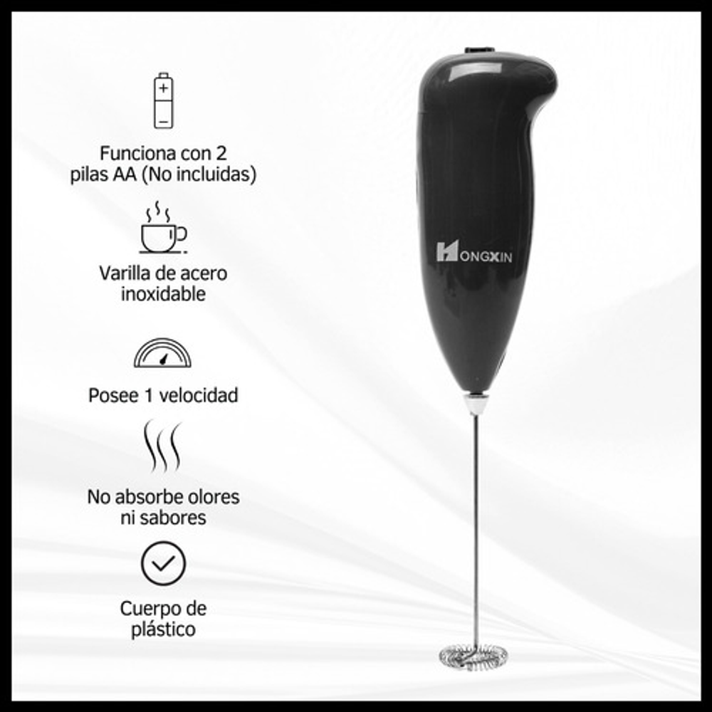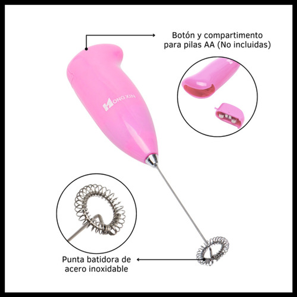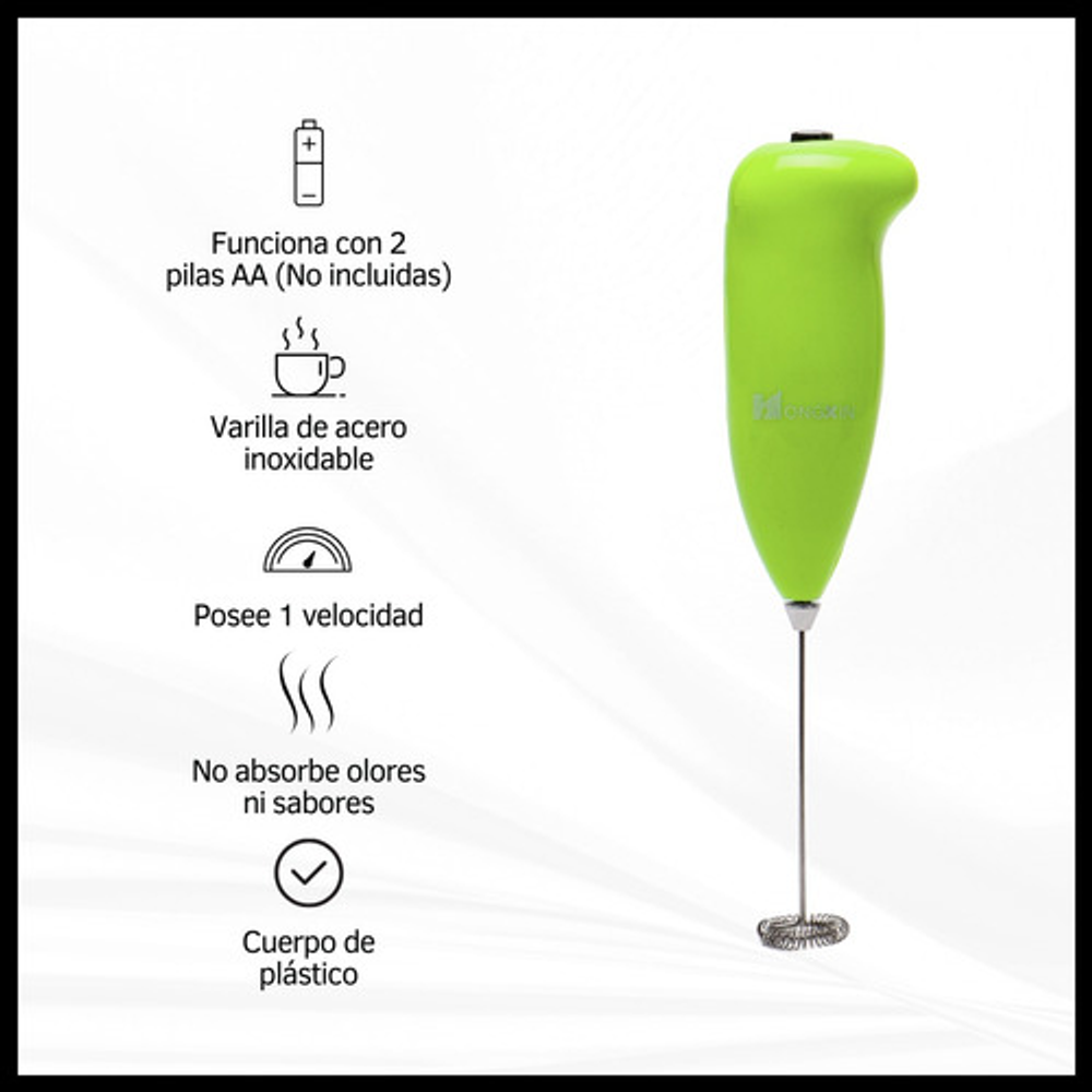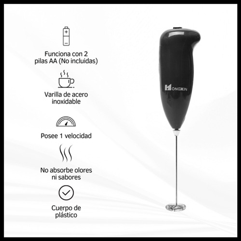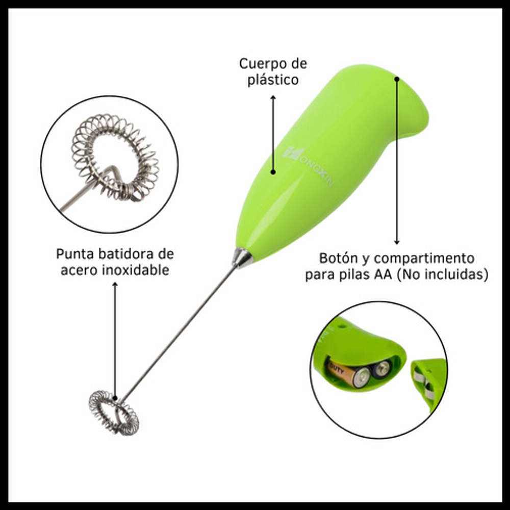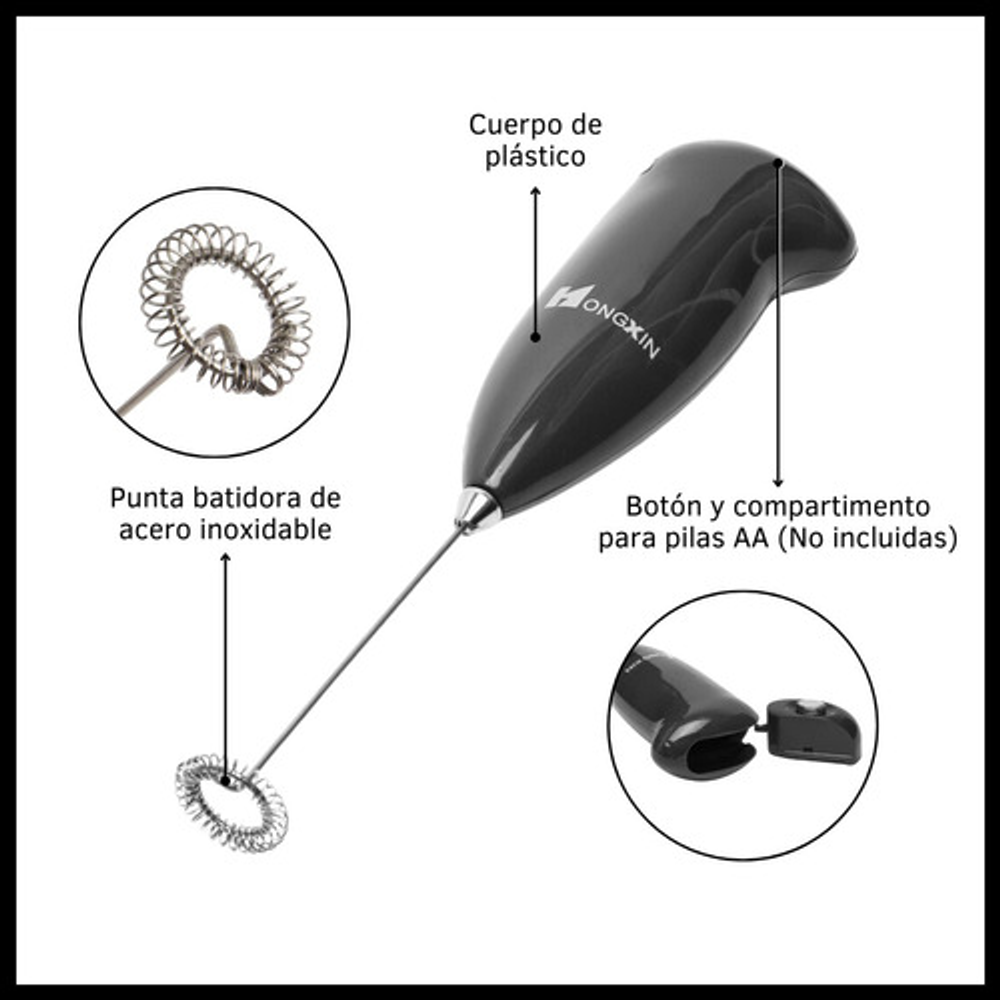 BATIDOR MANUAL: • Mango ergonómico • Varilla de acero inoxidable • Funciona con 2 pilas AA (no incluidas)