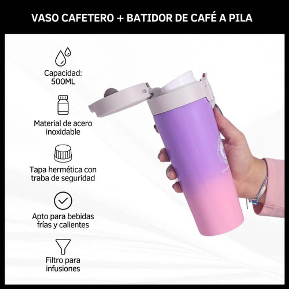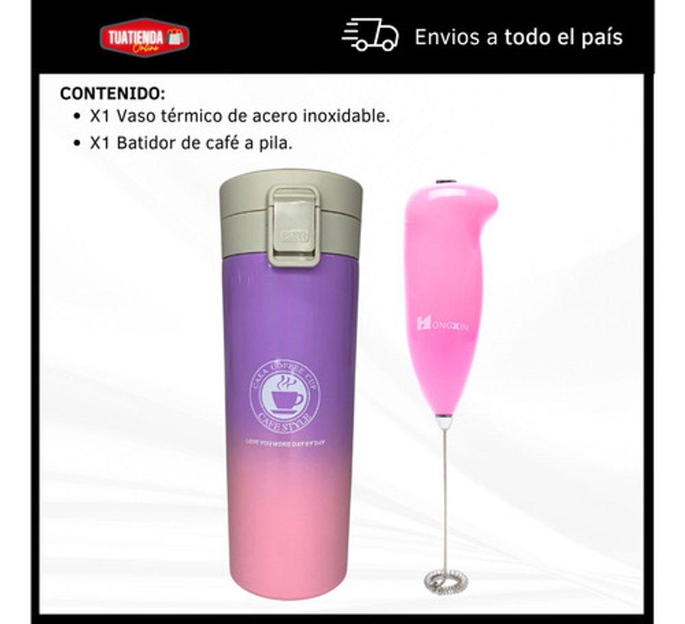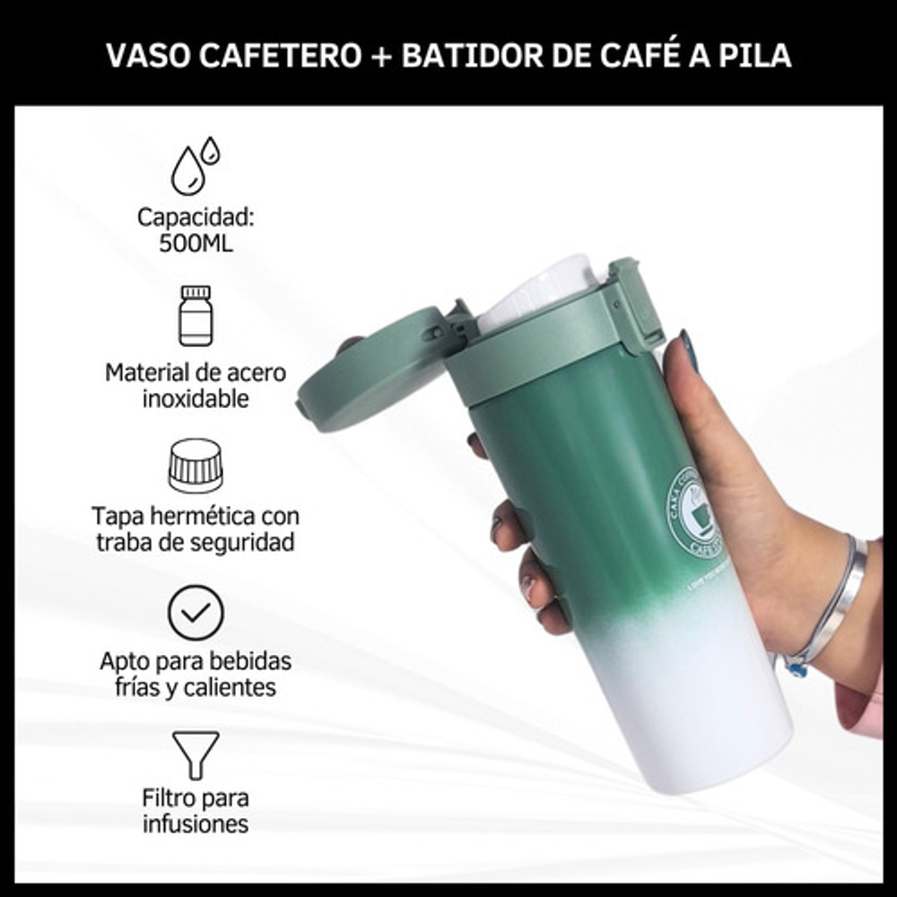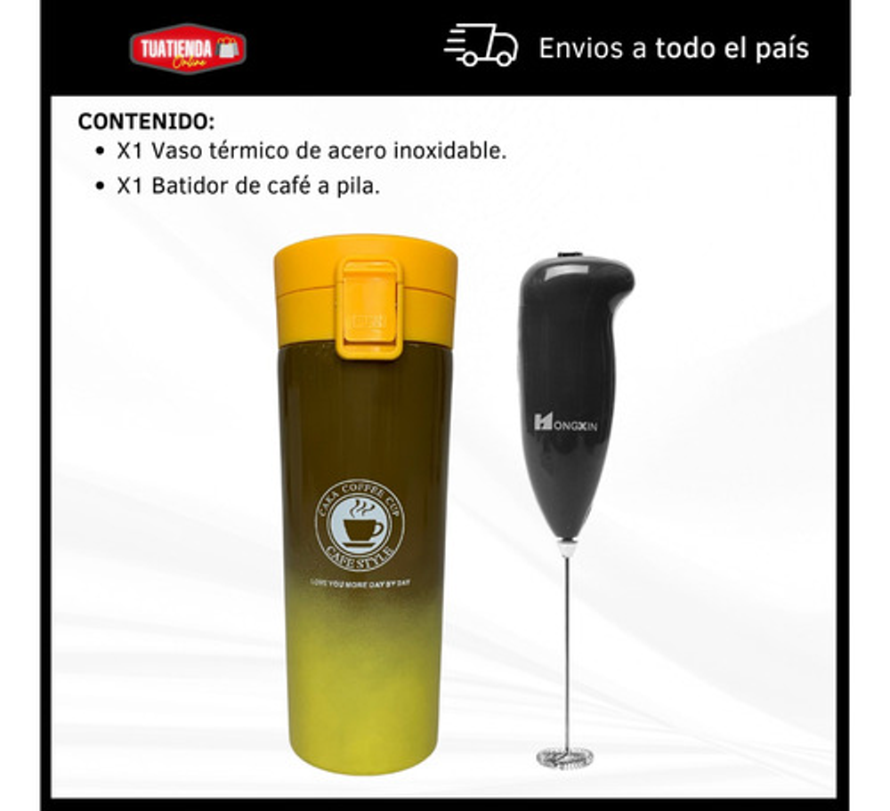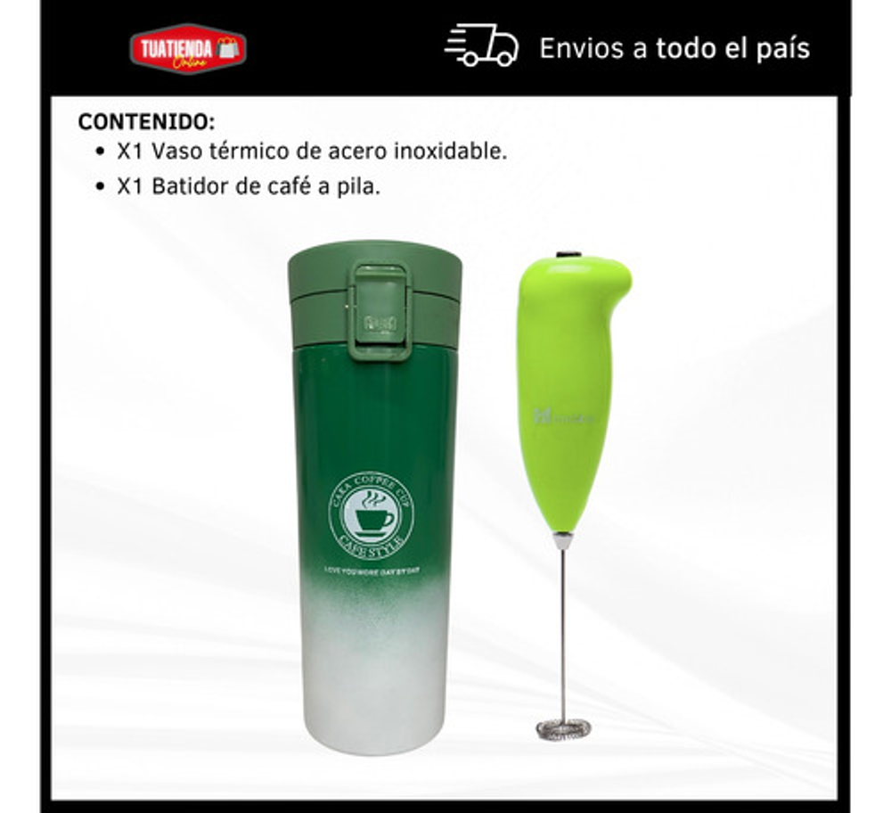 El combo incluye: • x1 Vaso cafetero térmico hermético • x1 Batidor espumador