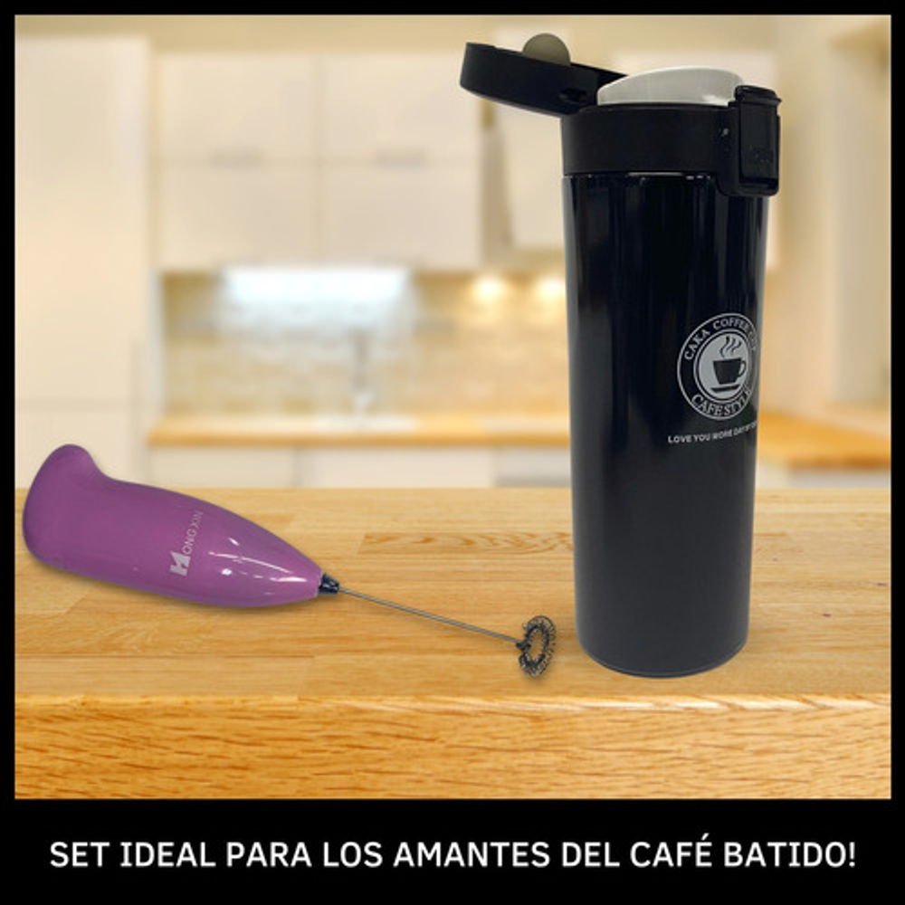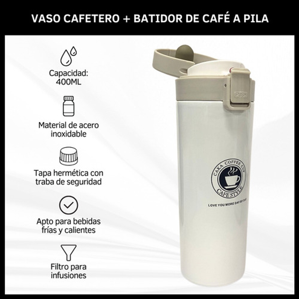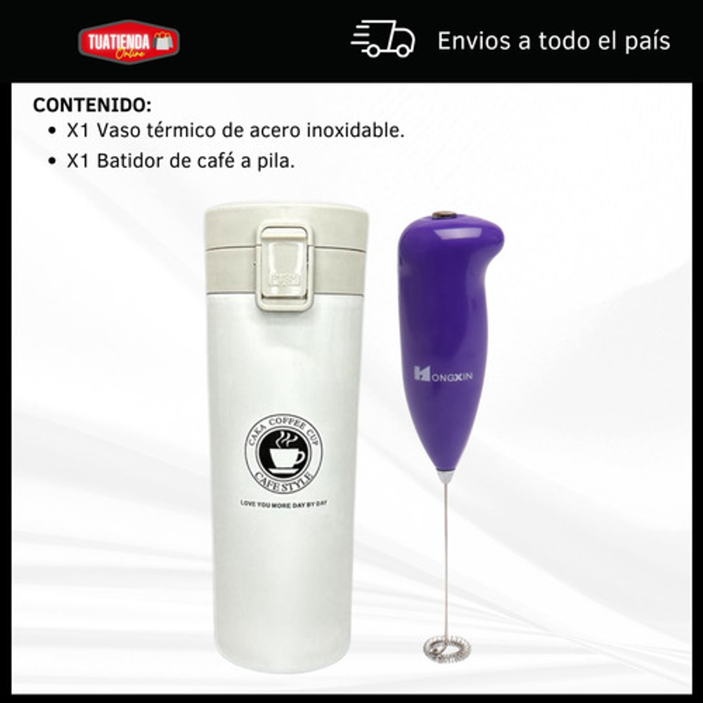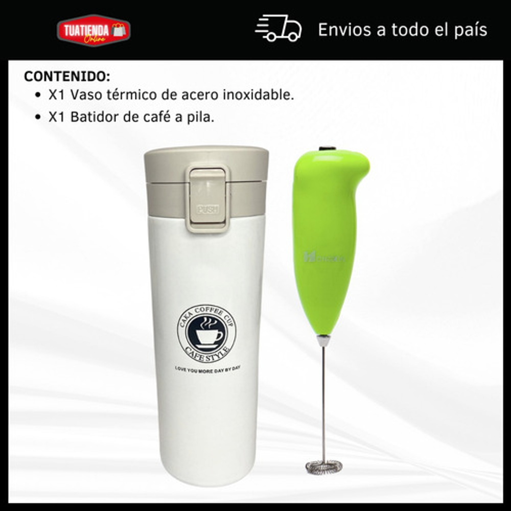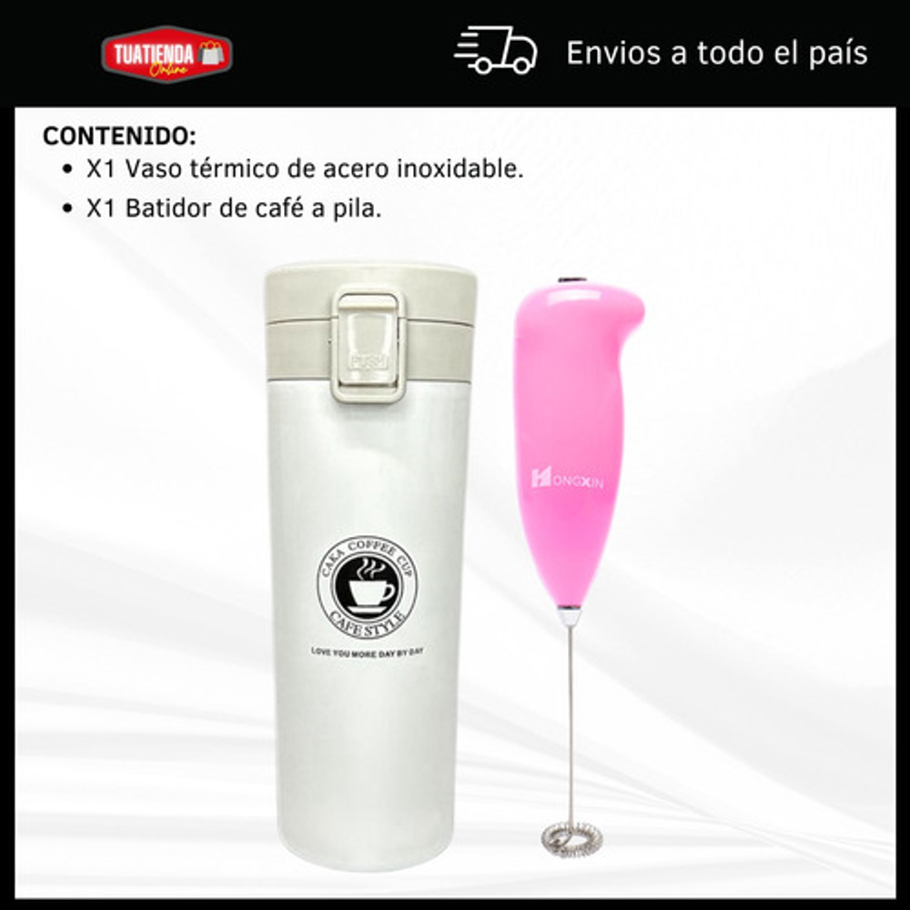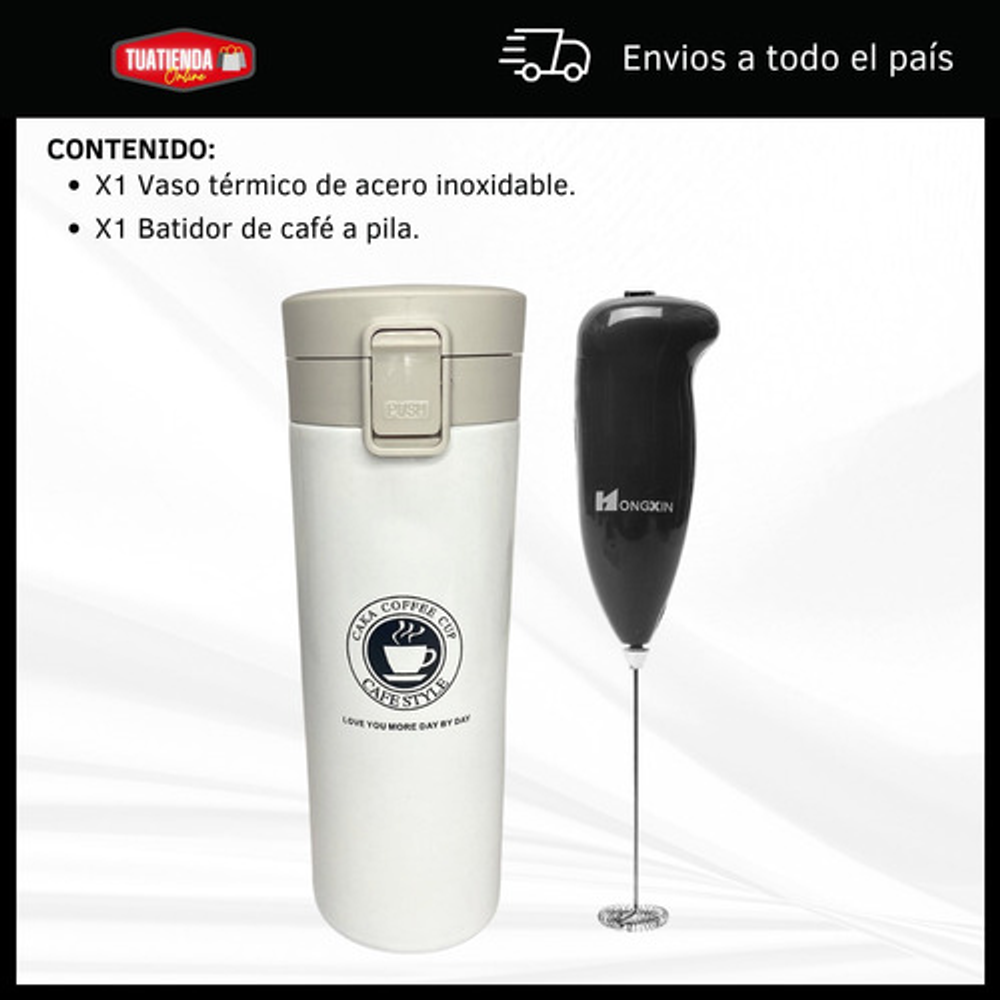 KIT VASO TÉRMICO CAFETERO 400ML Y BATIDOR ESPUMADOR A PILAS AA.