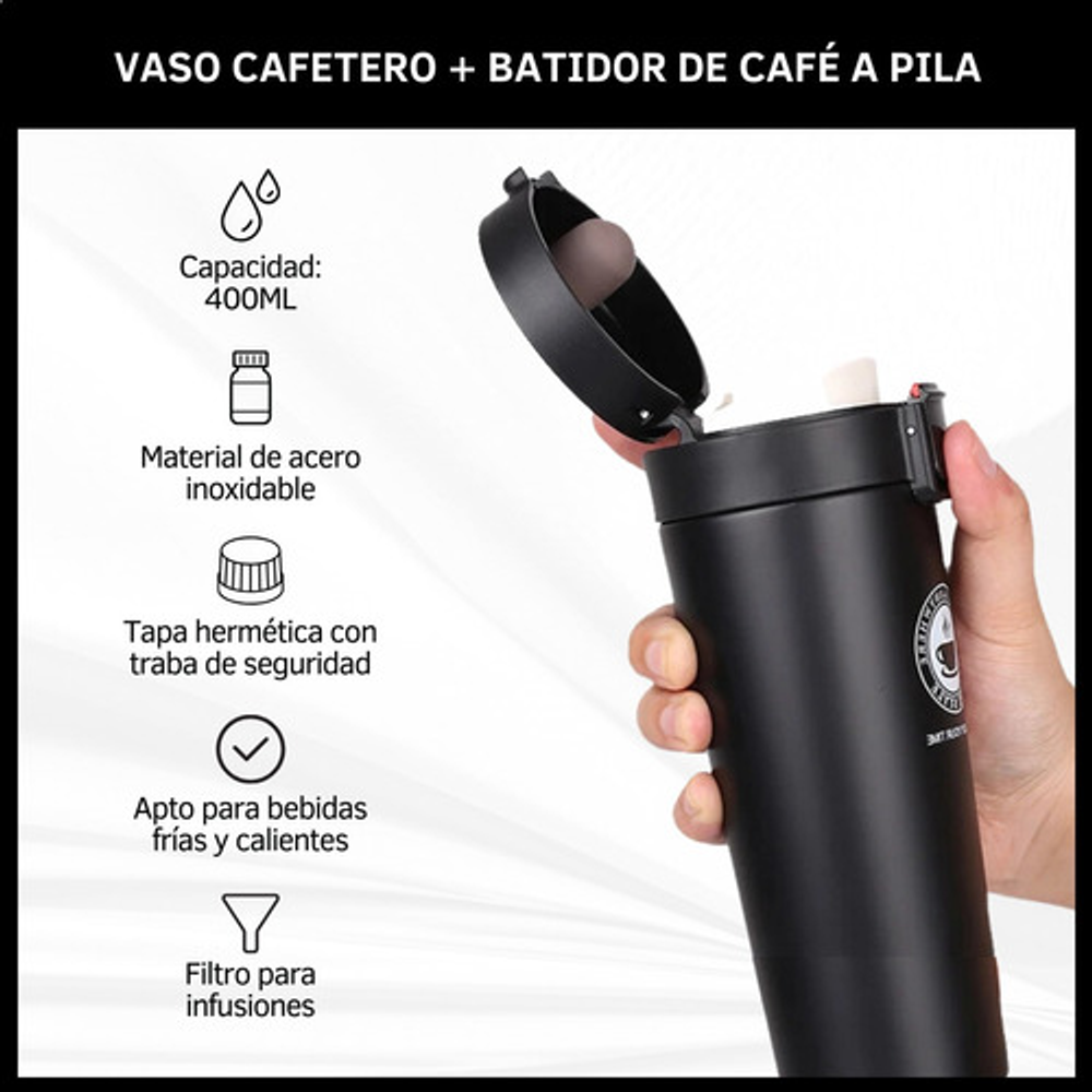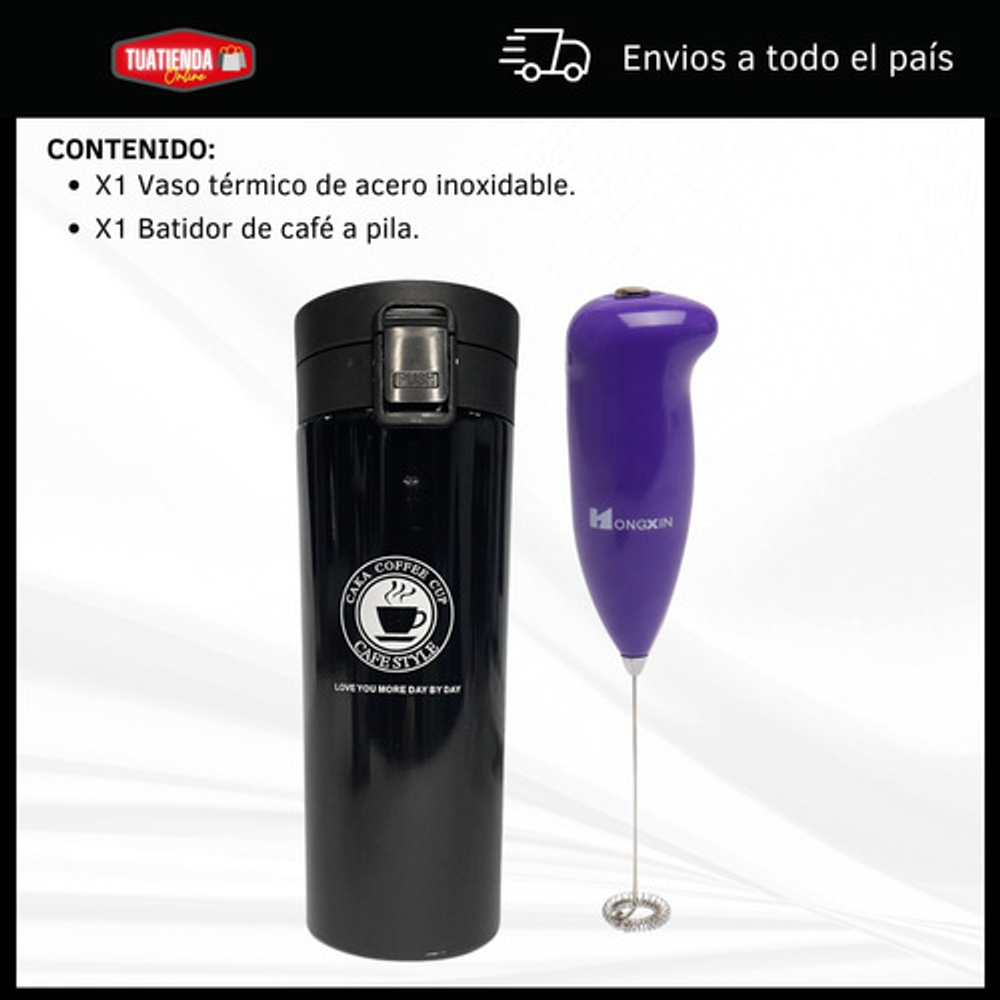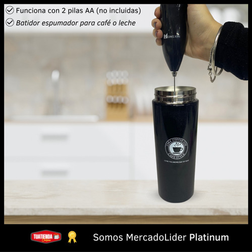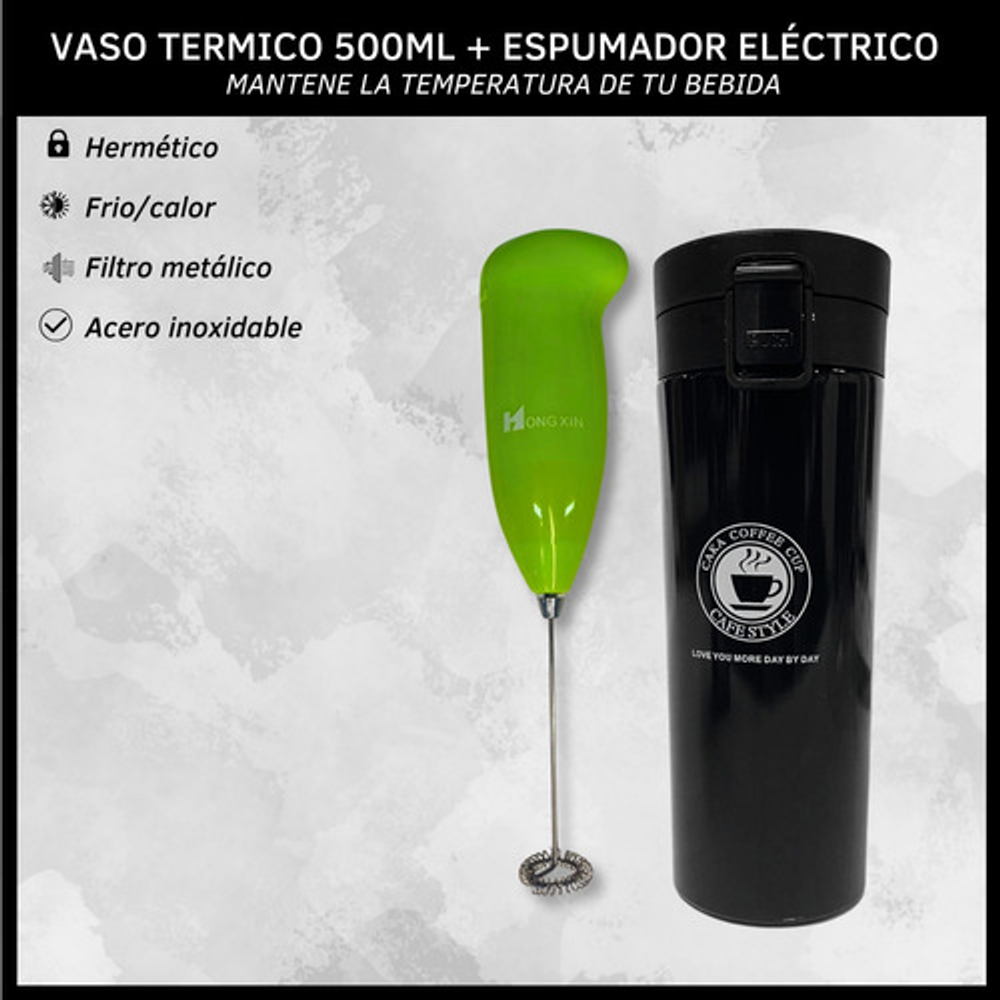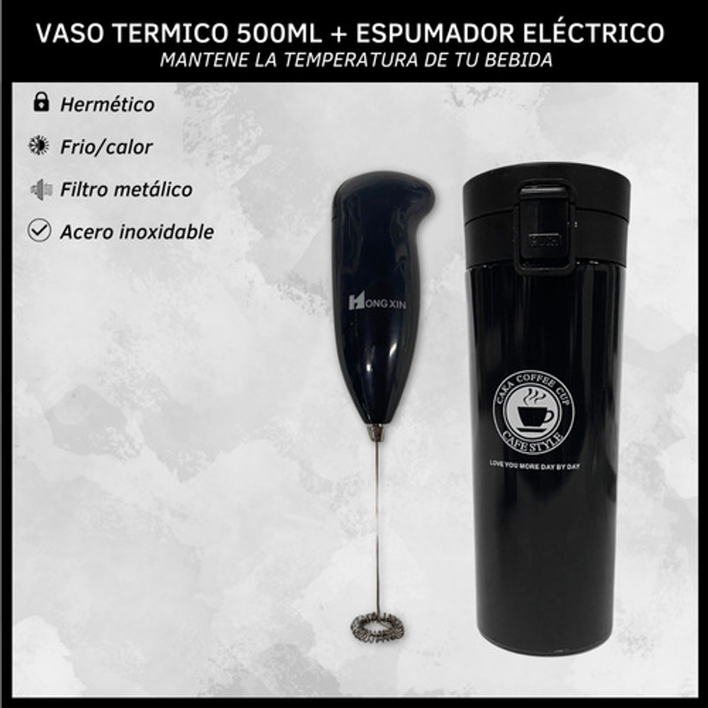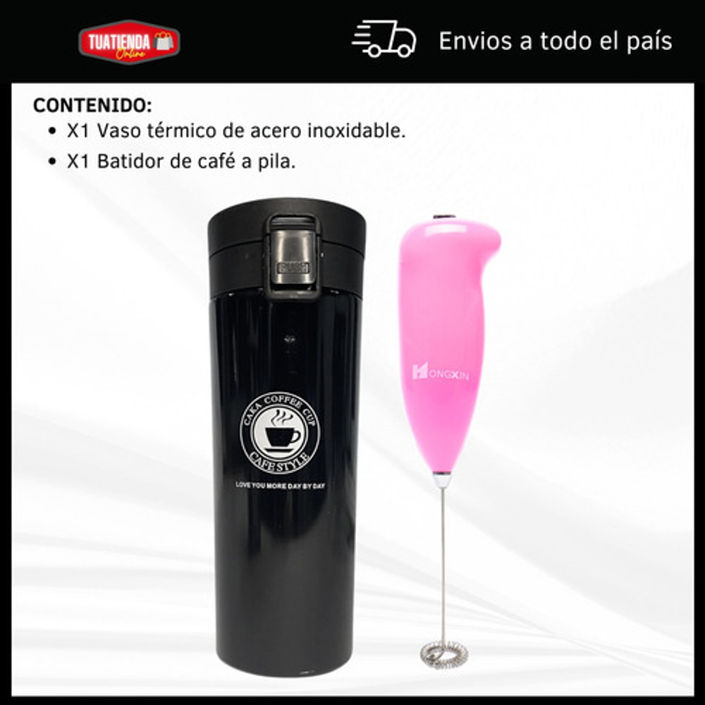 KIT VASO TÉRMICO CAFETERO 400ML Y BATIDOR ESPUMADOR A PILAS AA.