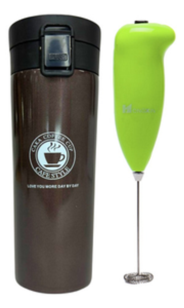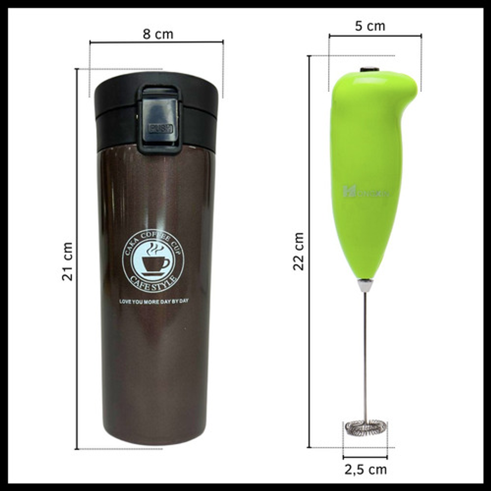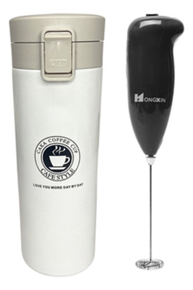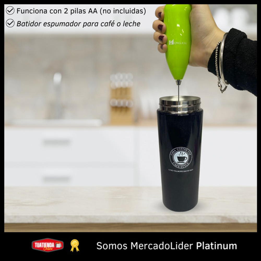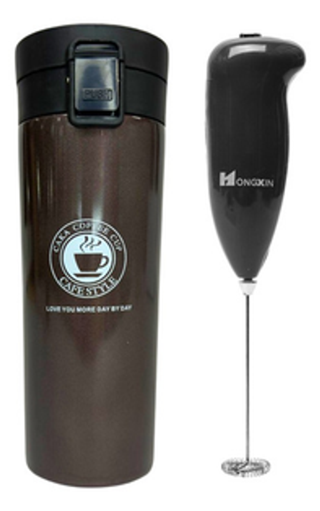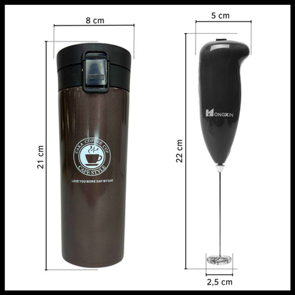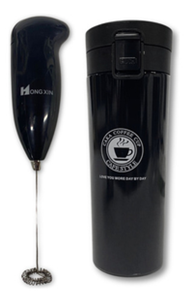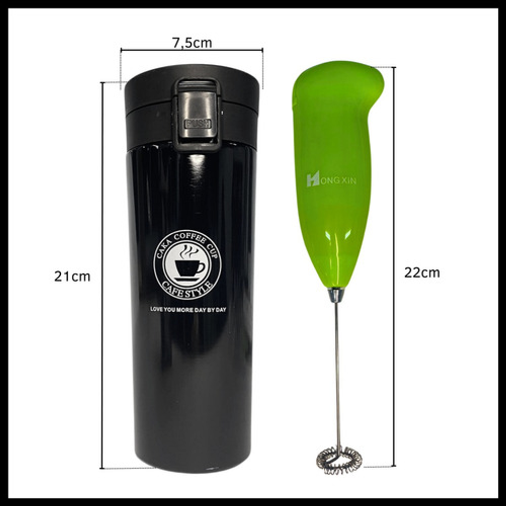 KIT VASO TÉRMICO CAFETERO 400ML Y BATIDOR ESPUMADOR A PILAS AA.