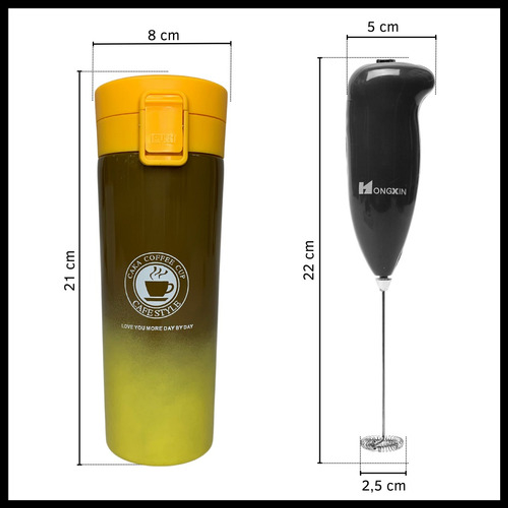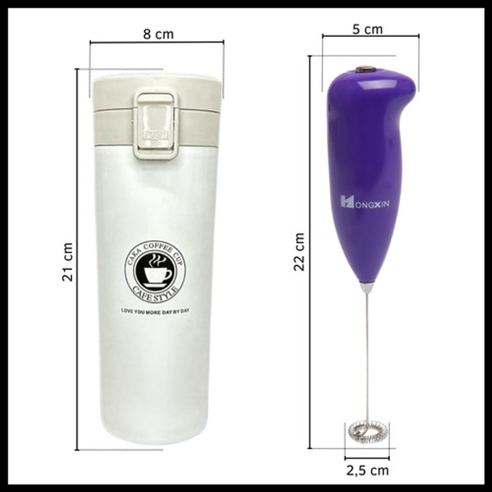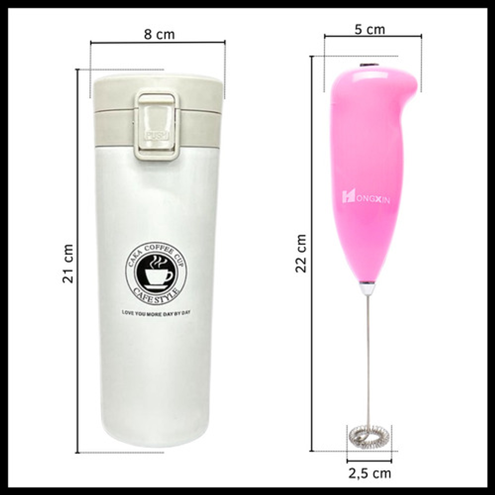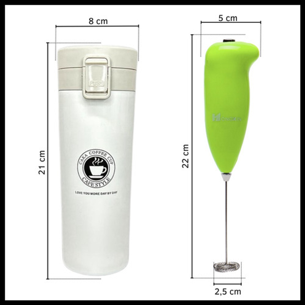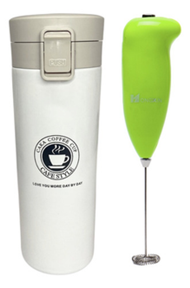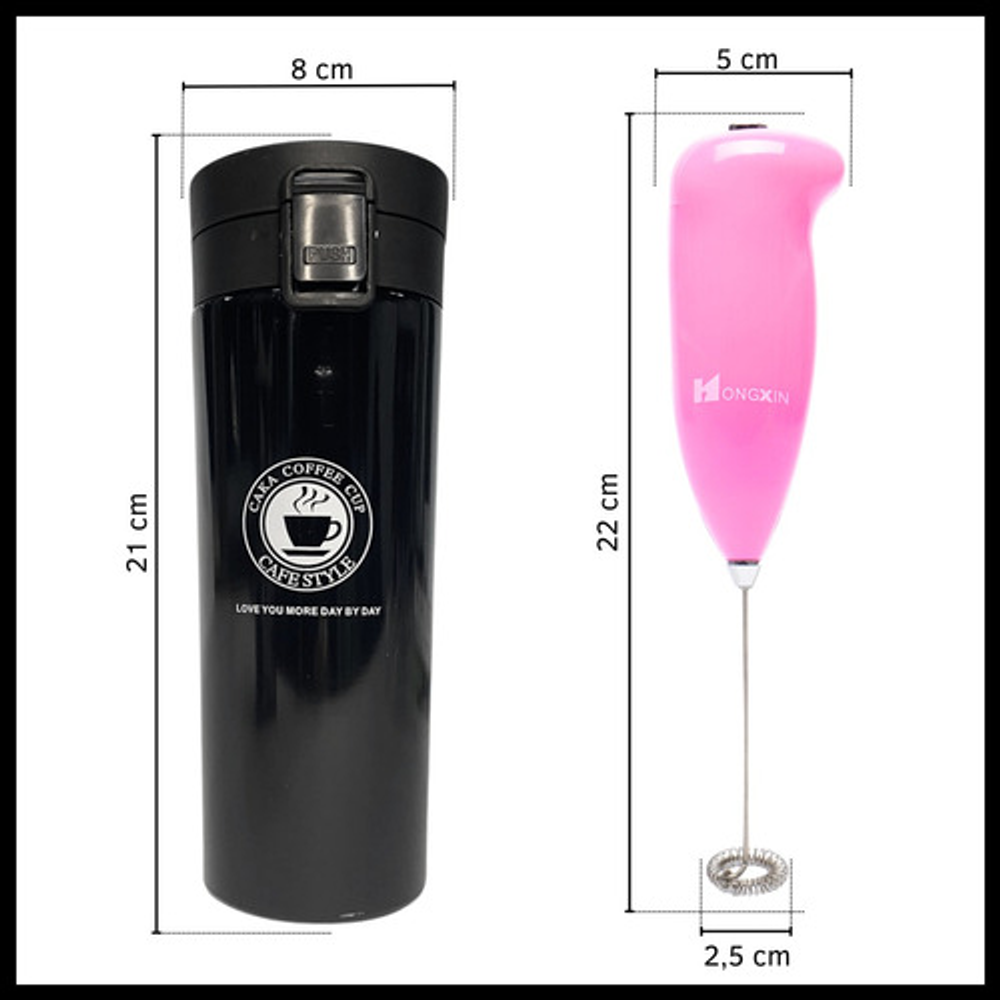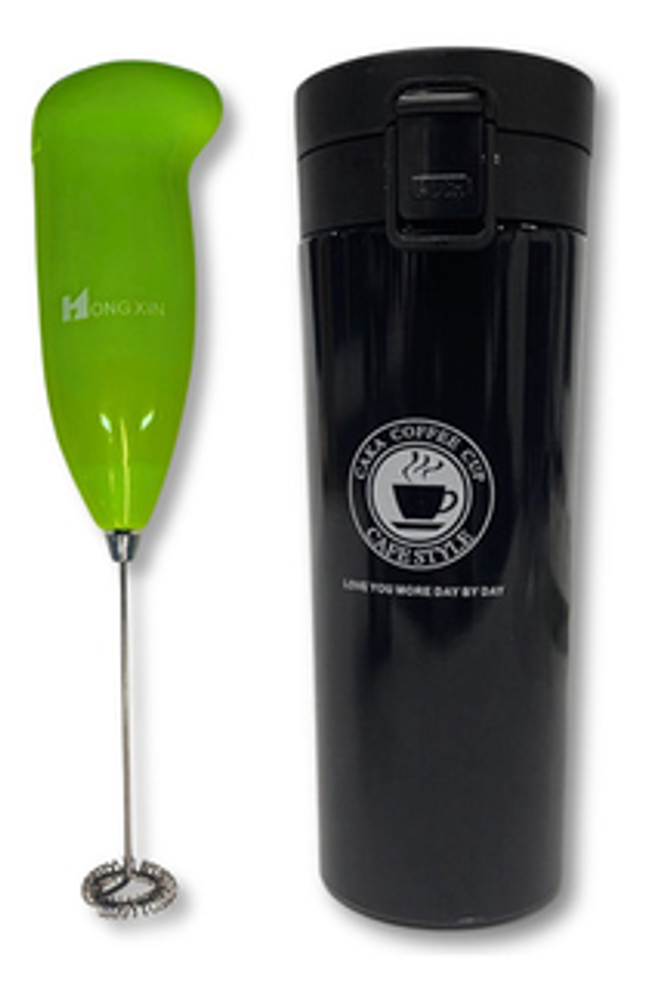 KIT VASO TÉRMICO CAFETERO 400ML Y BATIDOR ESPUMADOR A PILAS AA.