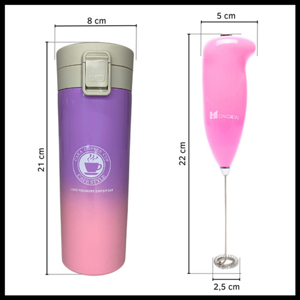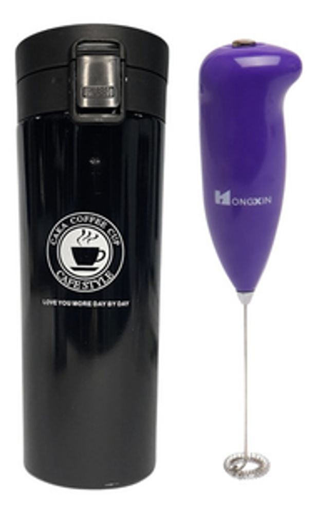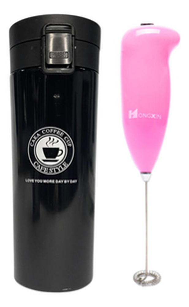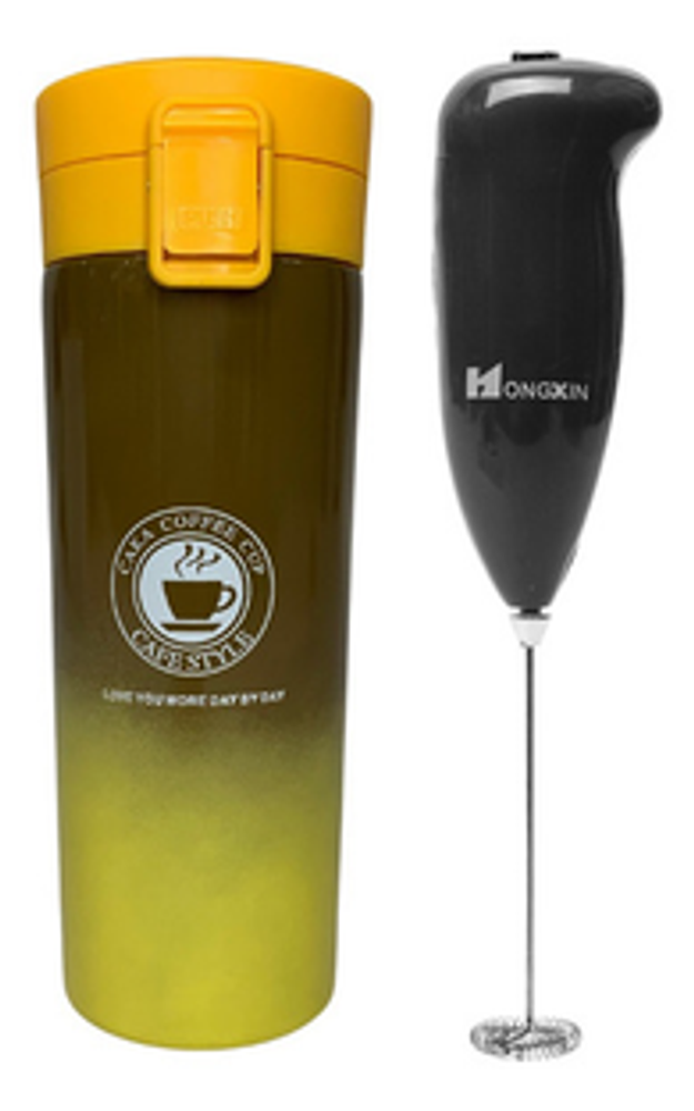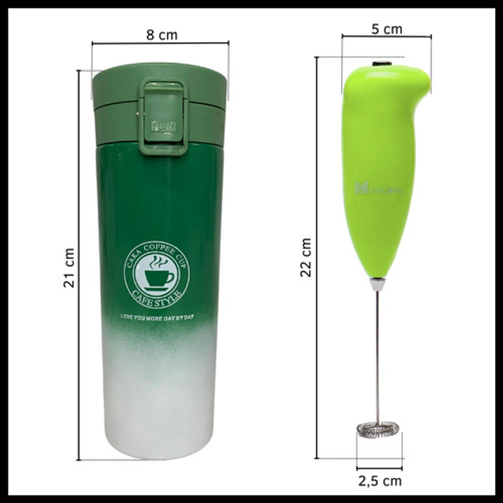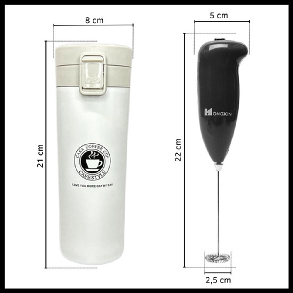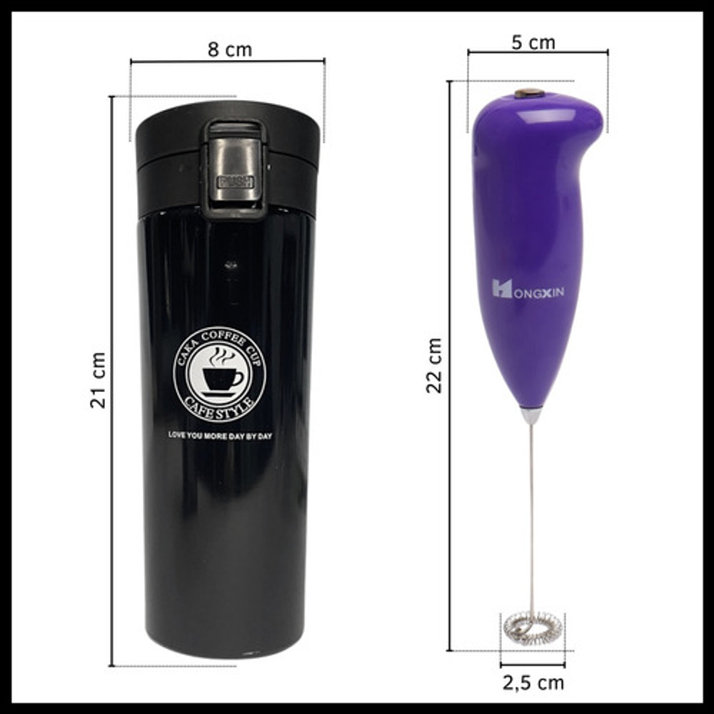 KIT VASO TÉRMICO CAFETERO 400ML Y BATIDOR ESPUMADOR A PILAS AA.