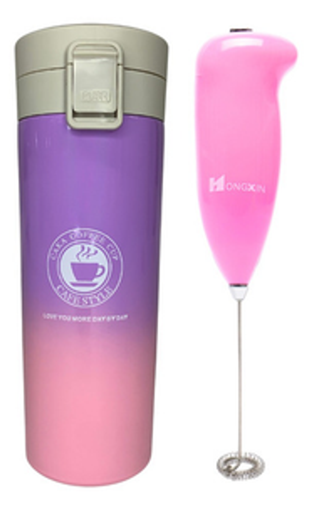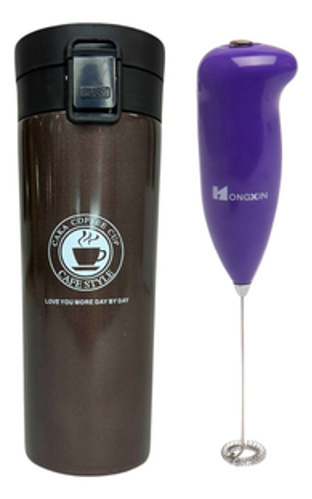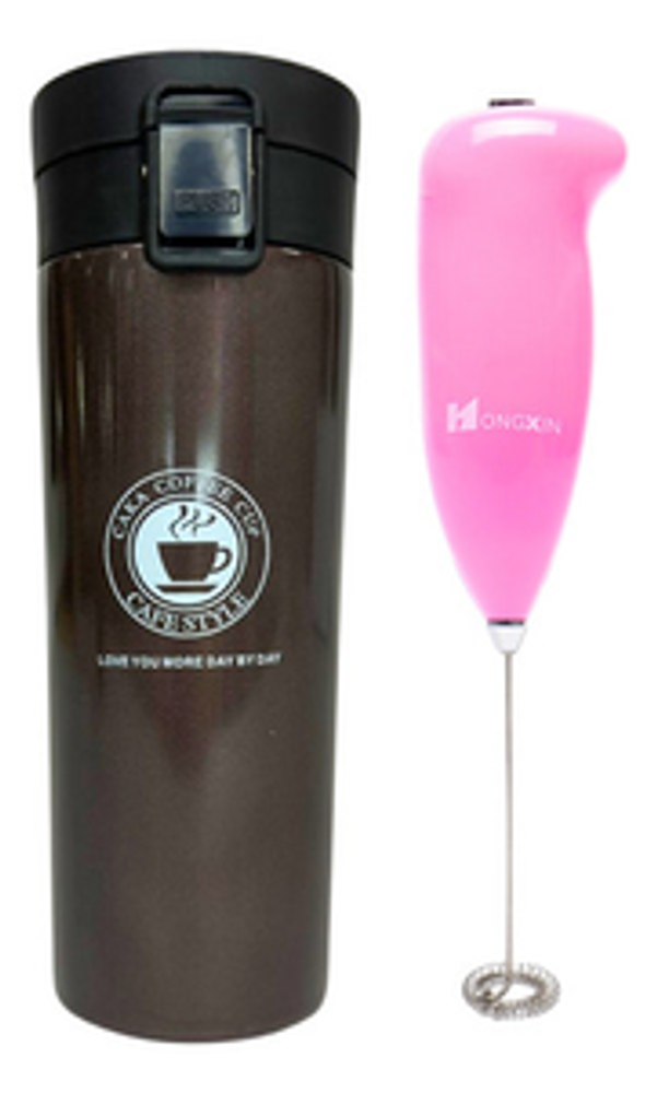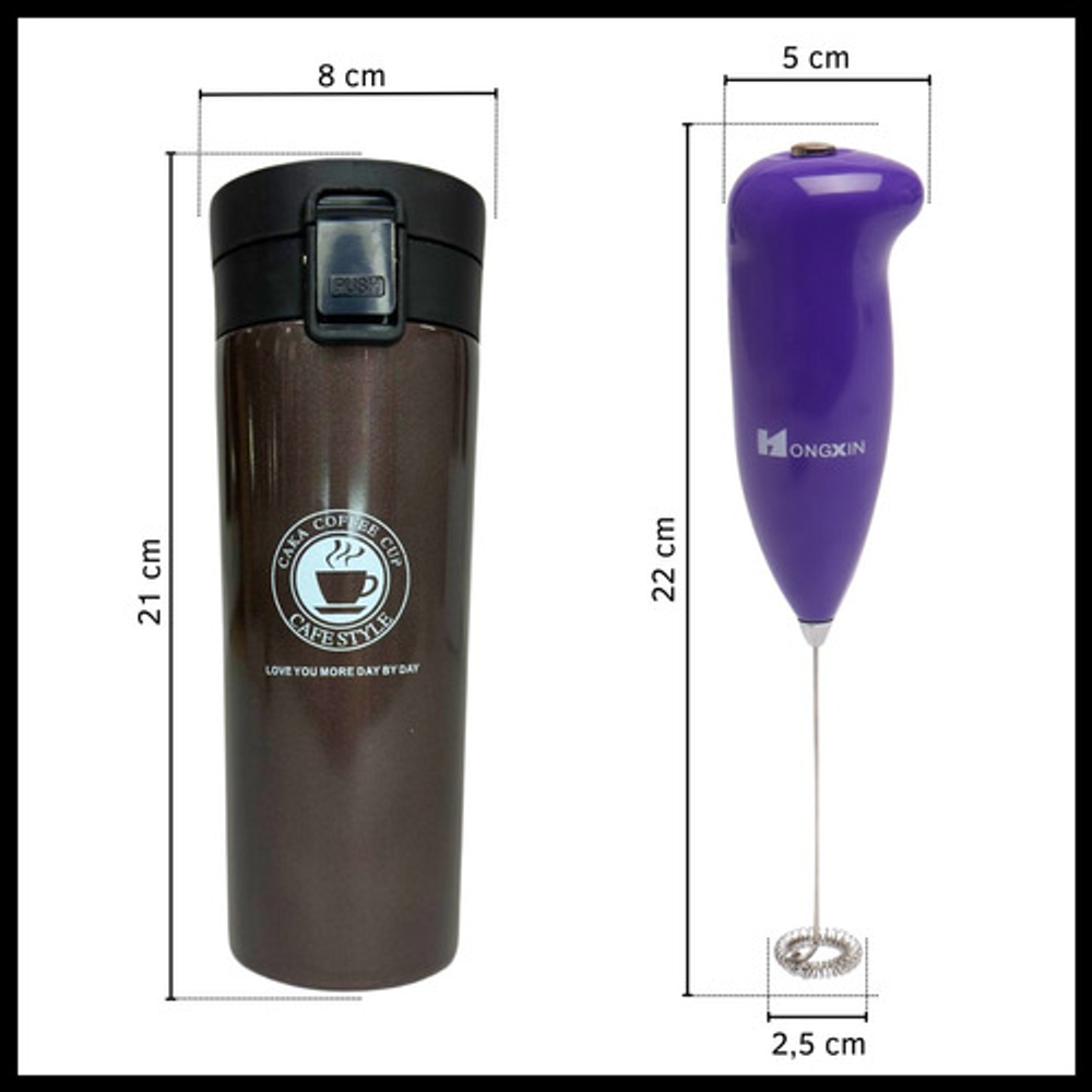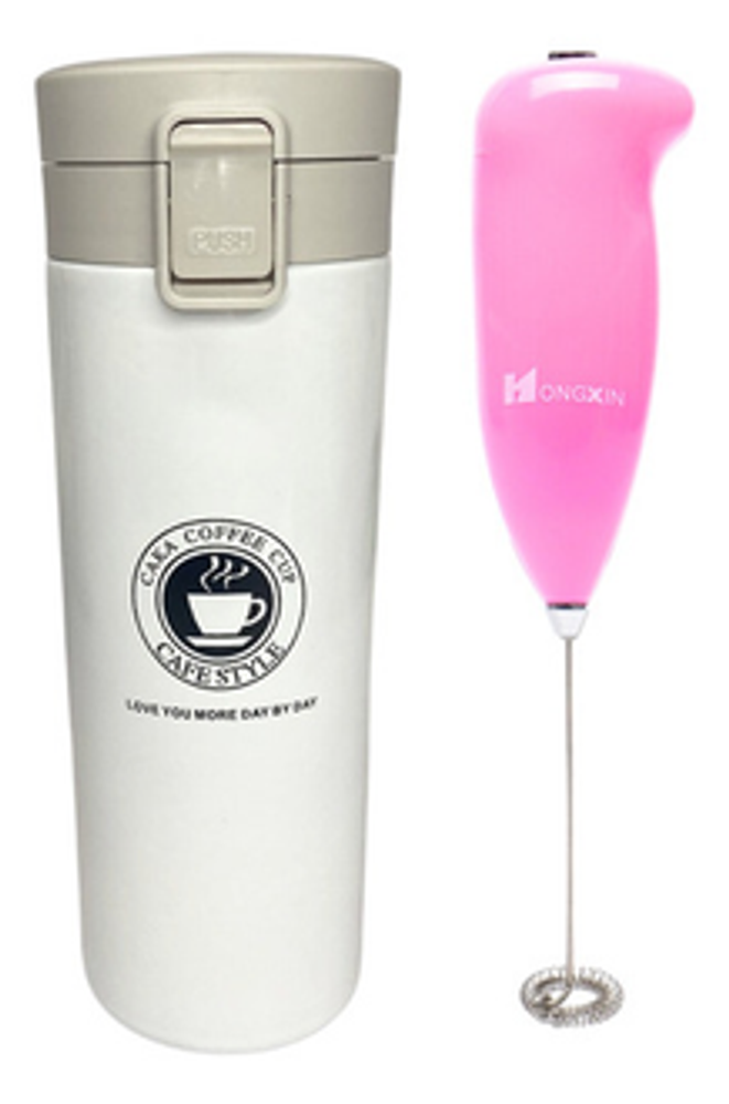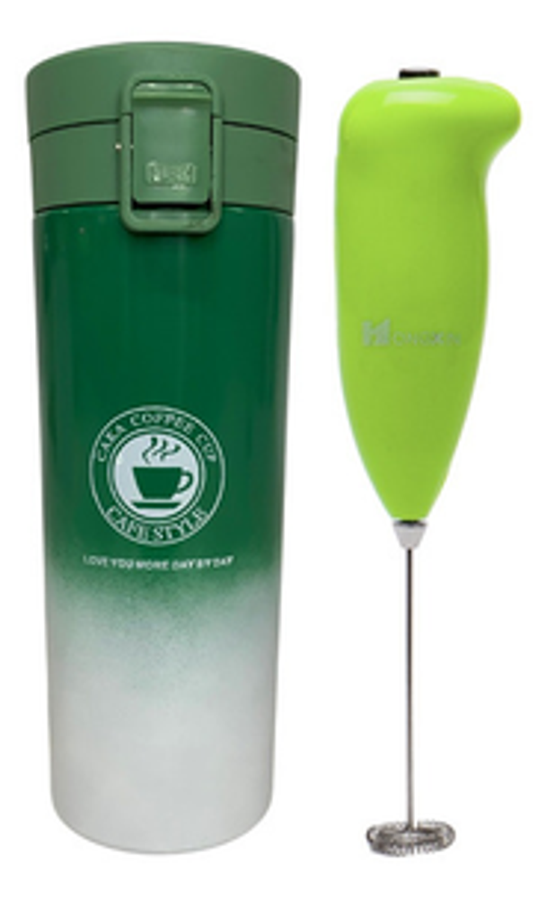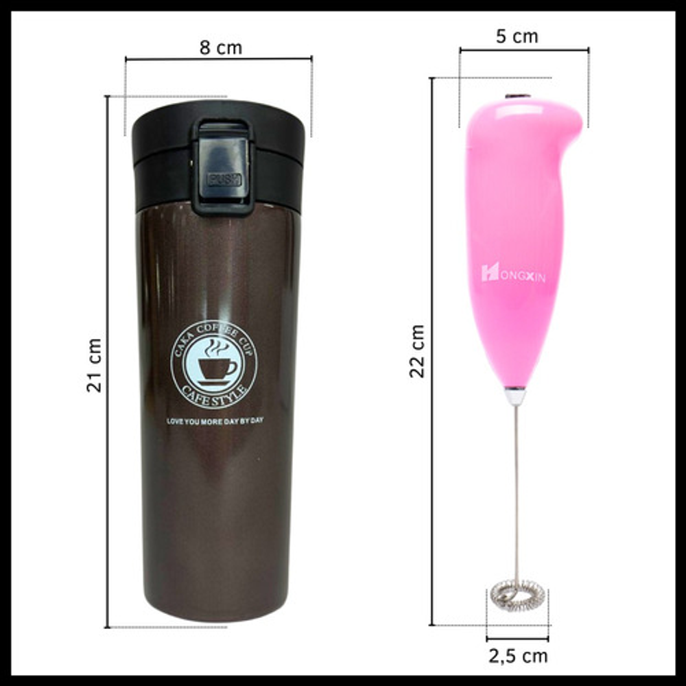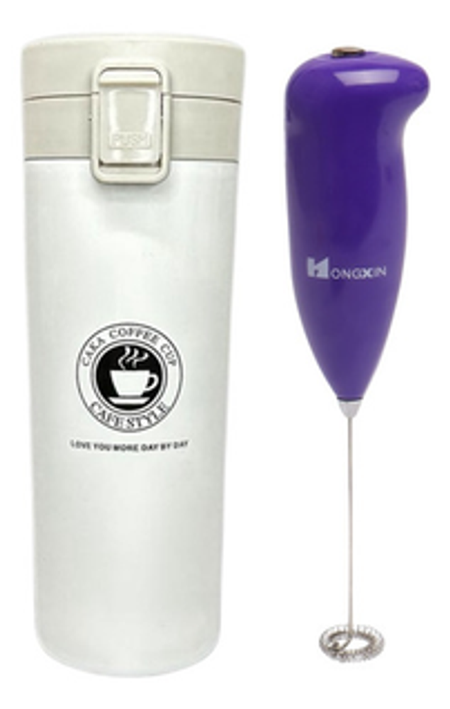 KIT VASO TÉRMICO CAFETERO 400ML Y BATIDOR ESPUMADOR A PILAS AA.