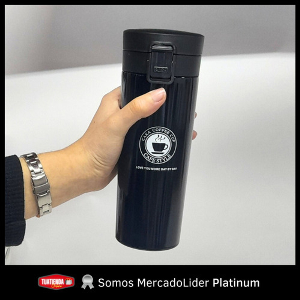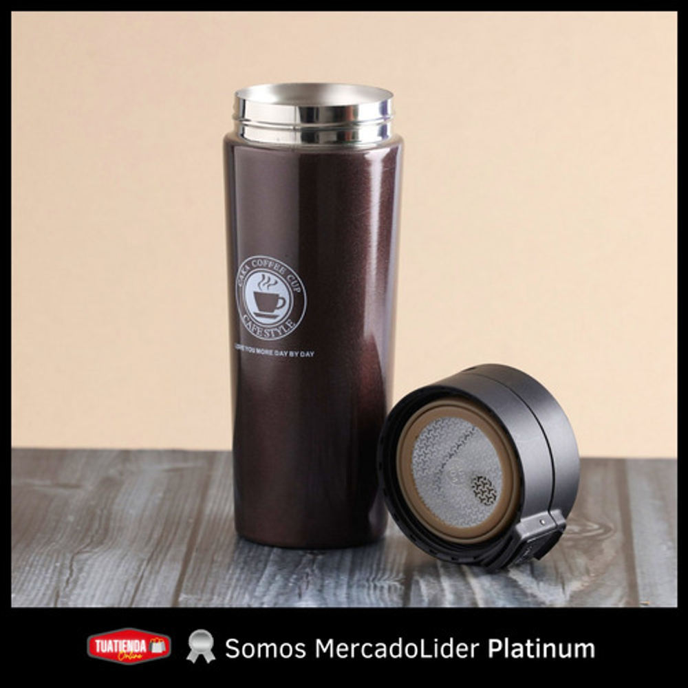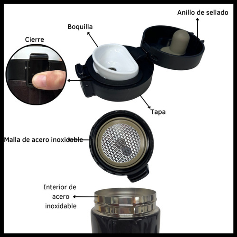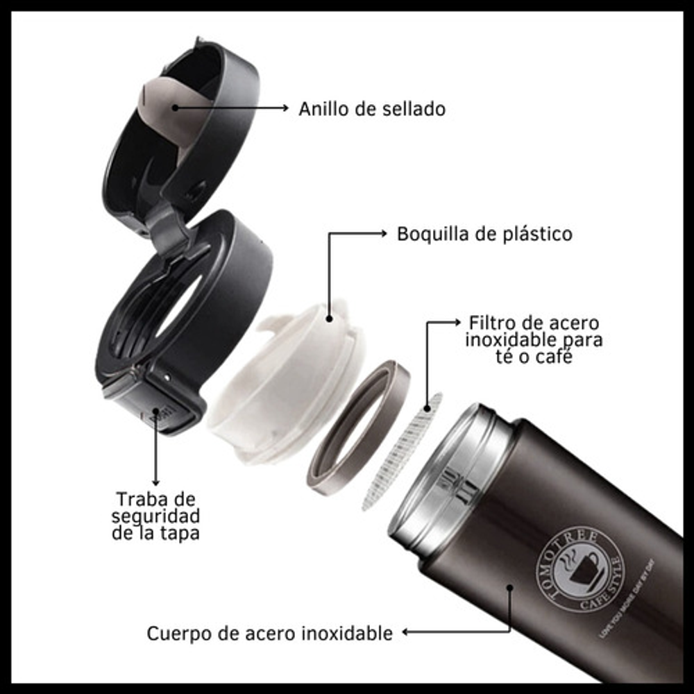 VASO CAFETERO: • Tapa de cierre hermético • Acero inoxidable de doble capa • Apto para bebidas calientes y frías • Traba de seguridad • Base antideslizante • Tapa a rosca 100% antiderrame • Tapa rebatible con botón • Incluye filtro interno • Capacidad 400ml