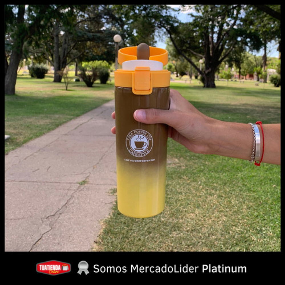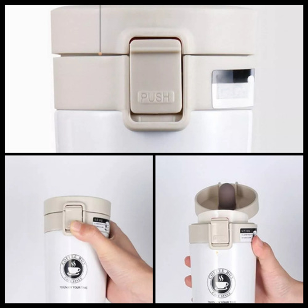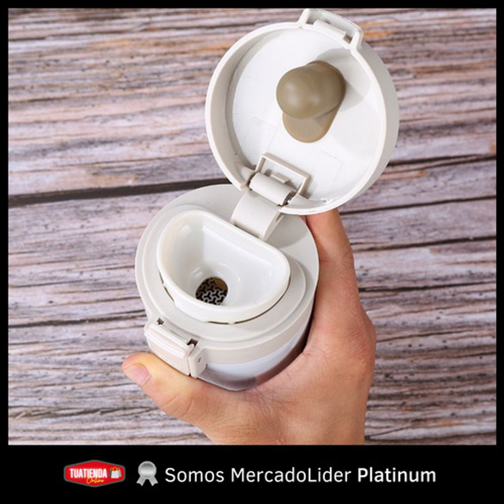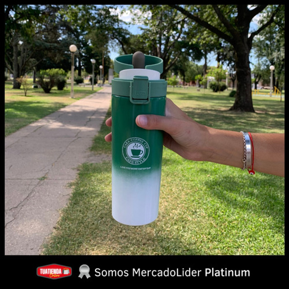 VASO CAFETERO: • Tapa de cierre hermético • Acero inoxidable de doble capa • Apto para bebidas calientes y frías • Traba de seguridad • Base antideslizante • Tapa a rosca 100% antiderrame • Tapa rebatible con botón • Incluye filtro interno • Capacidad 400ml