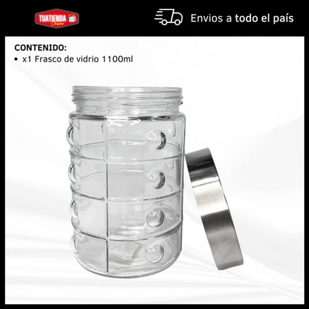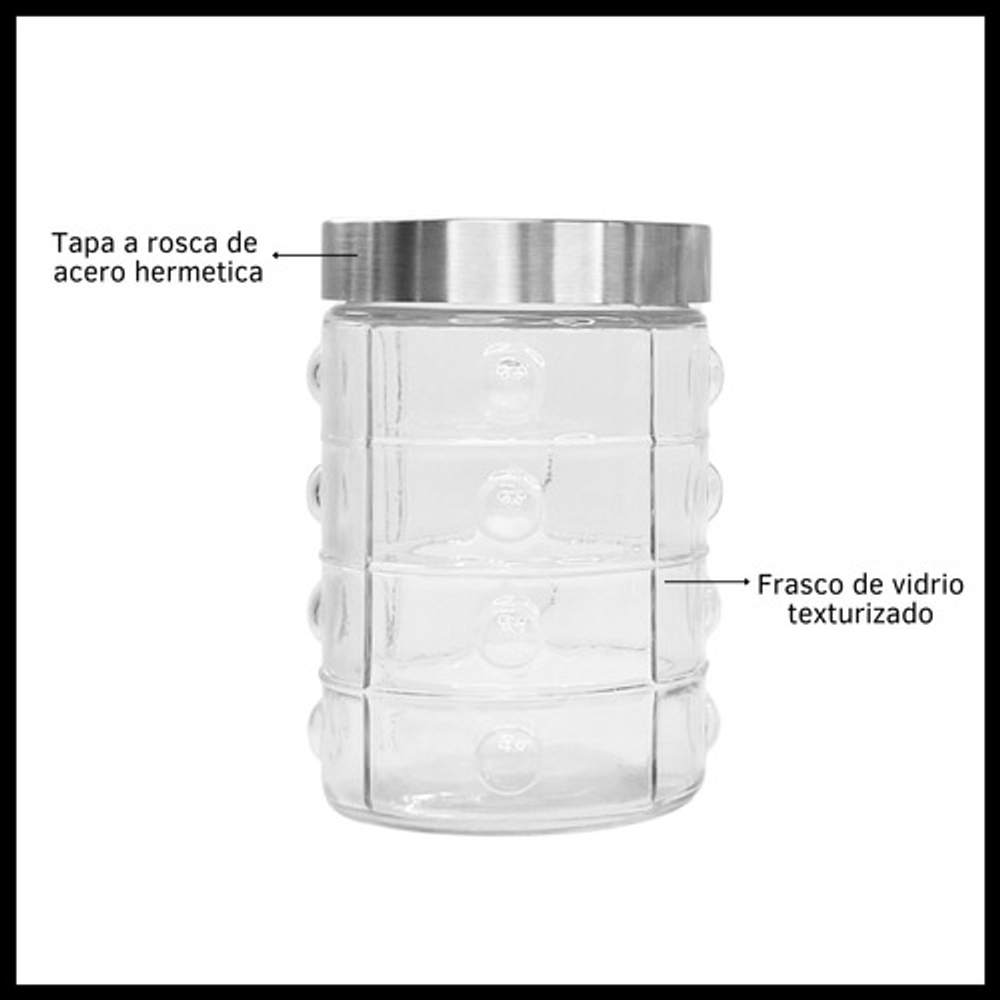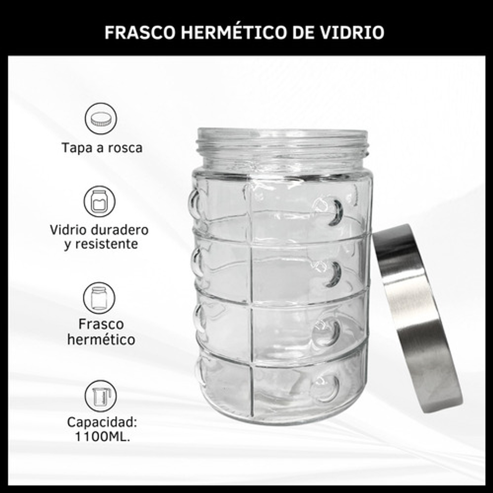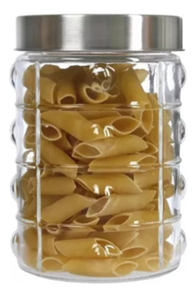 Características: • Capacidad: 1100ml. • Diseño transparente. • Tapa hermética a rosca. • Fabricado con vidrio de alta calidad. • Dimensiones: 17 cm de altura y 11 cm de ancho. • Para guardar alimentos secos como arroz, pasta, granos, cereales, y mucho más.