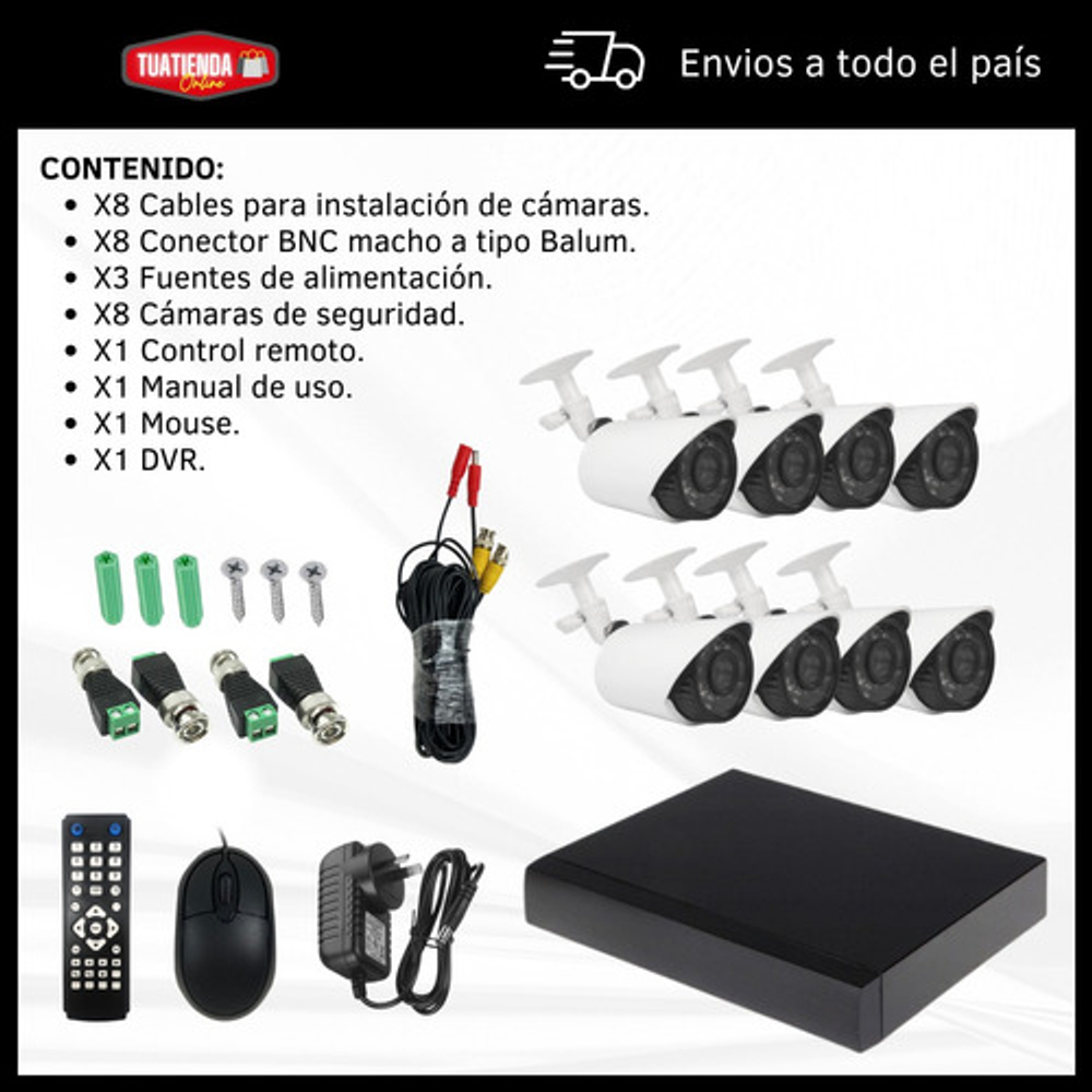 Incluye: • X8 Cables para instalación de cámaras. • X8 Conector BNC macho a tipo Balum. • X3 Fuentes de alimentación. • X8 Cámaras de seguridad. • X1 Control remoto. • X1 Manual de uso. • X1 Mouse. • X1 DVR.