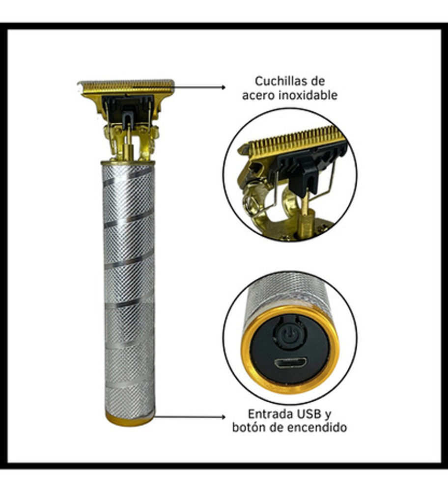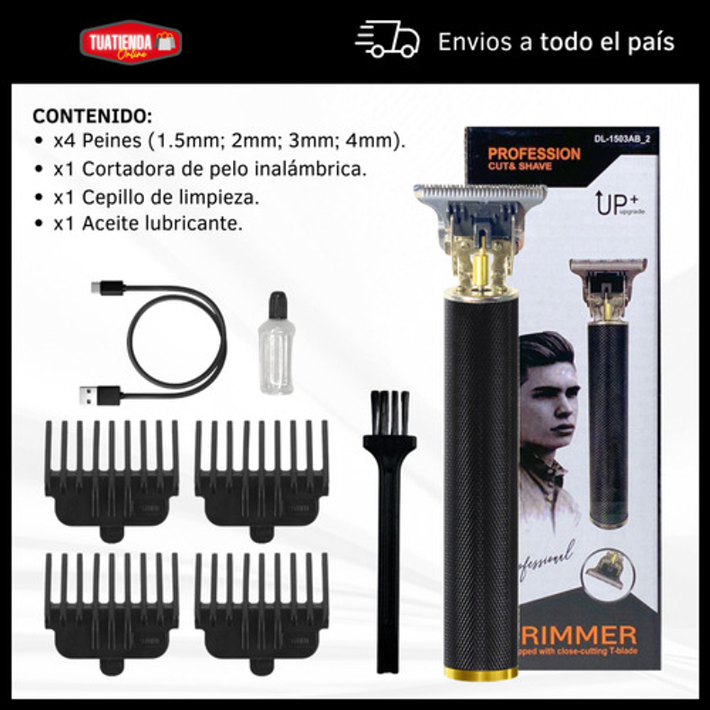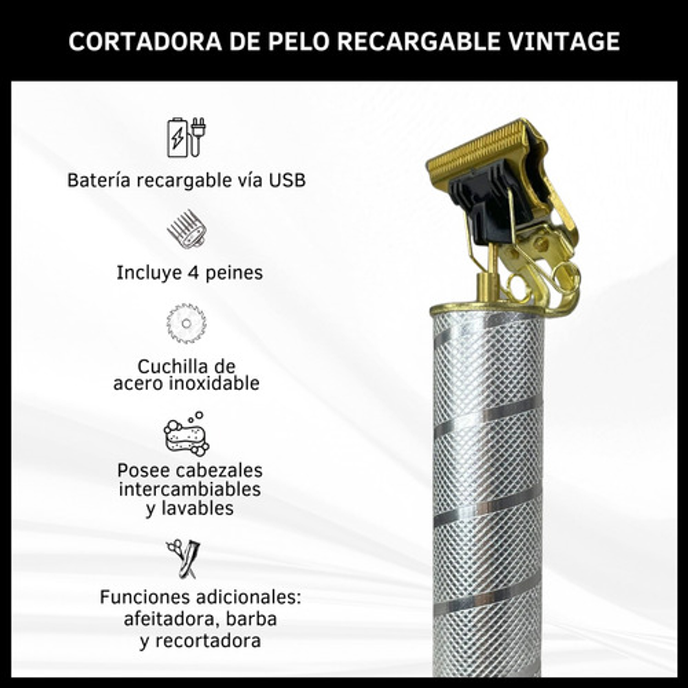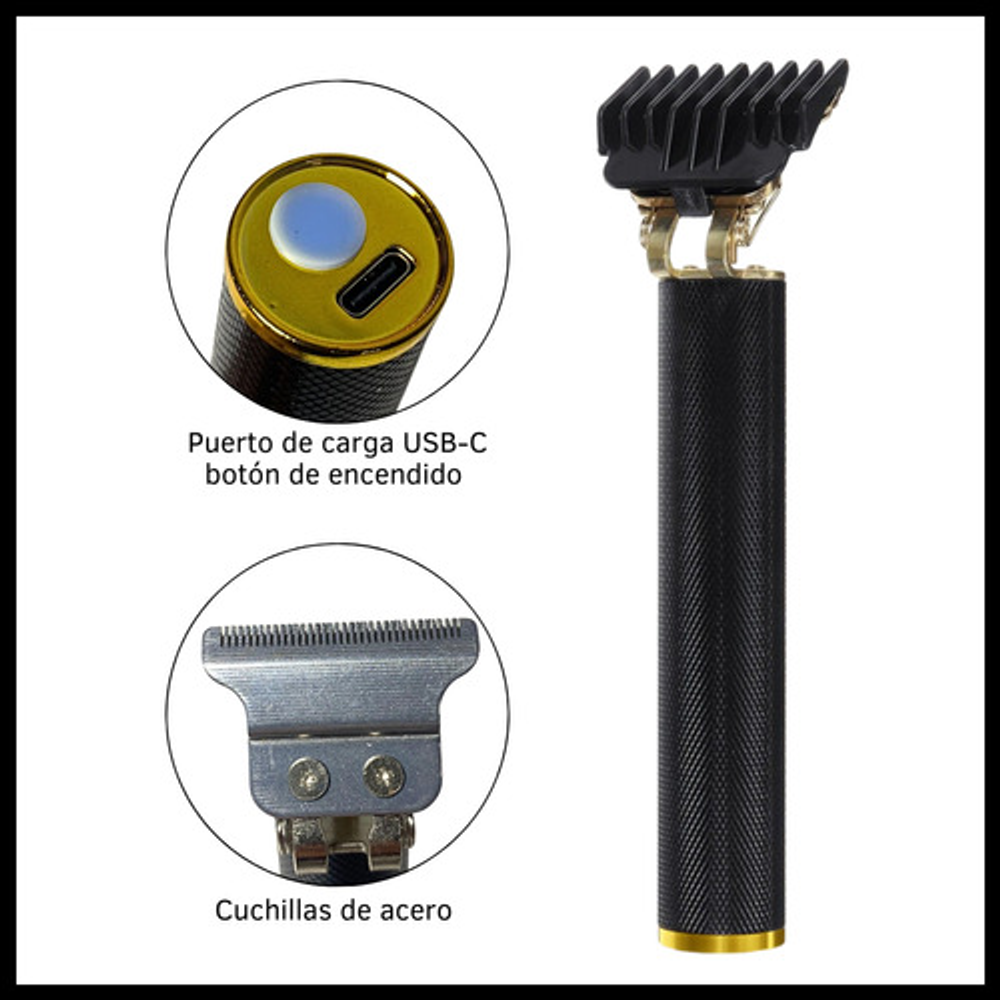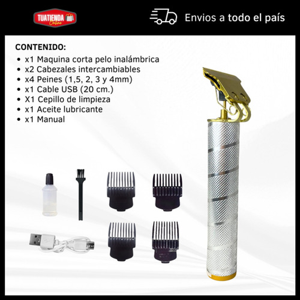 Incluye cable USB tipo C, aceite lubricante, peine de limpieza y 4 peines intercambiables.