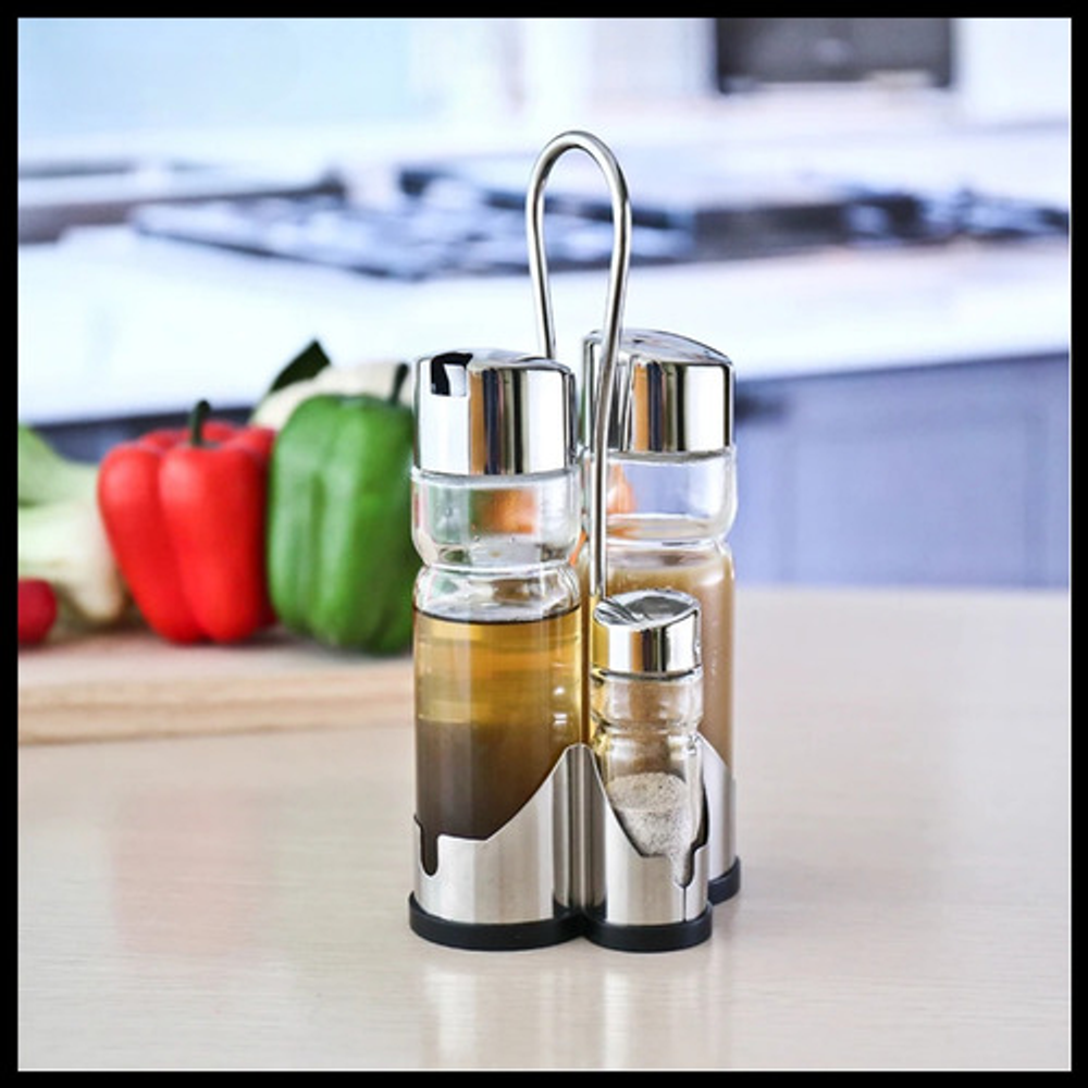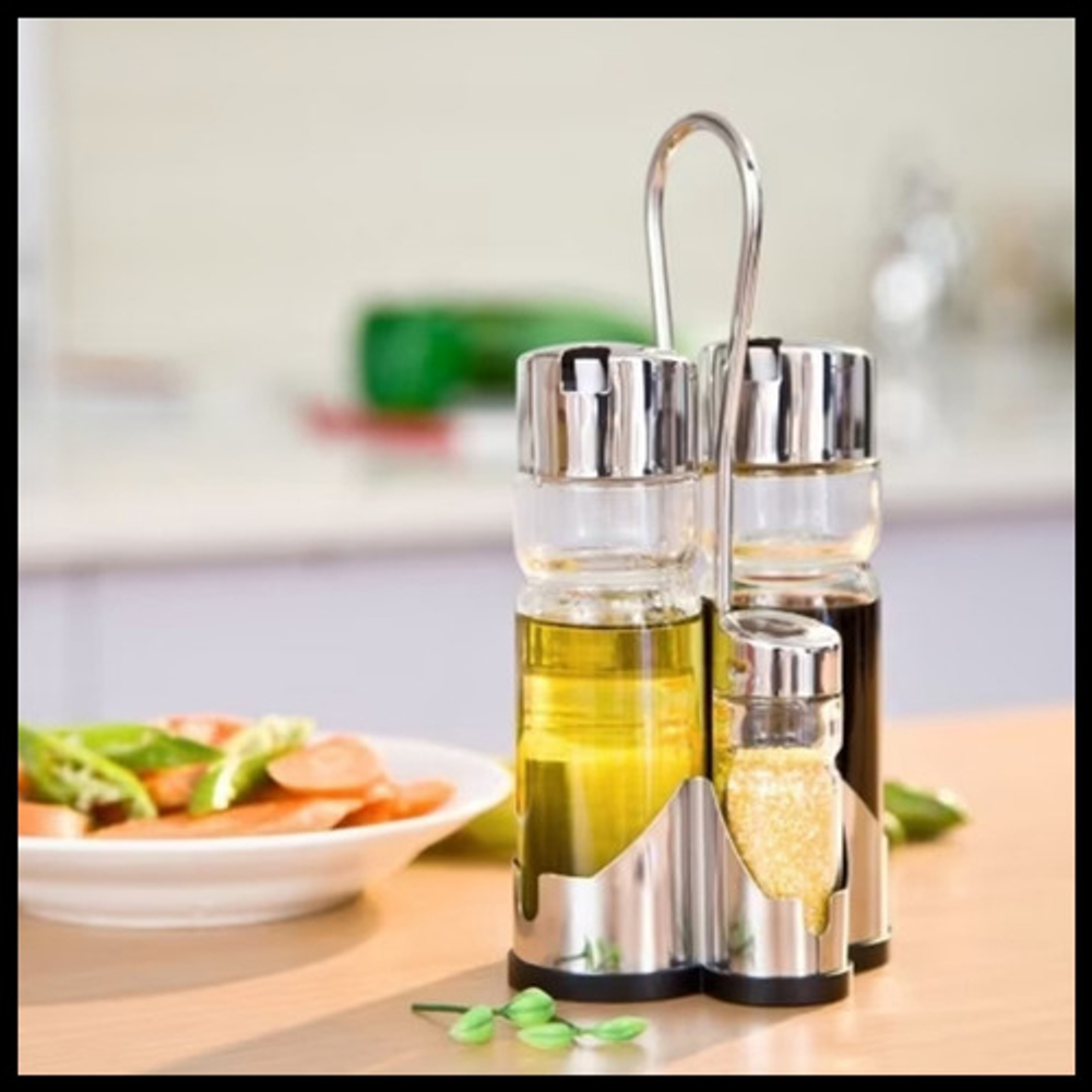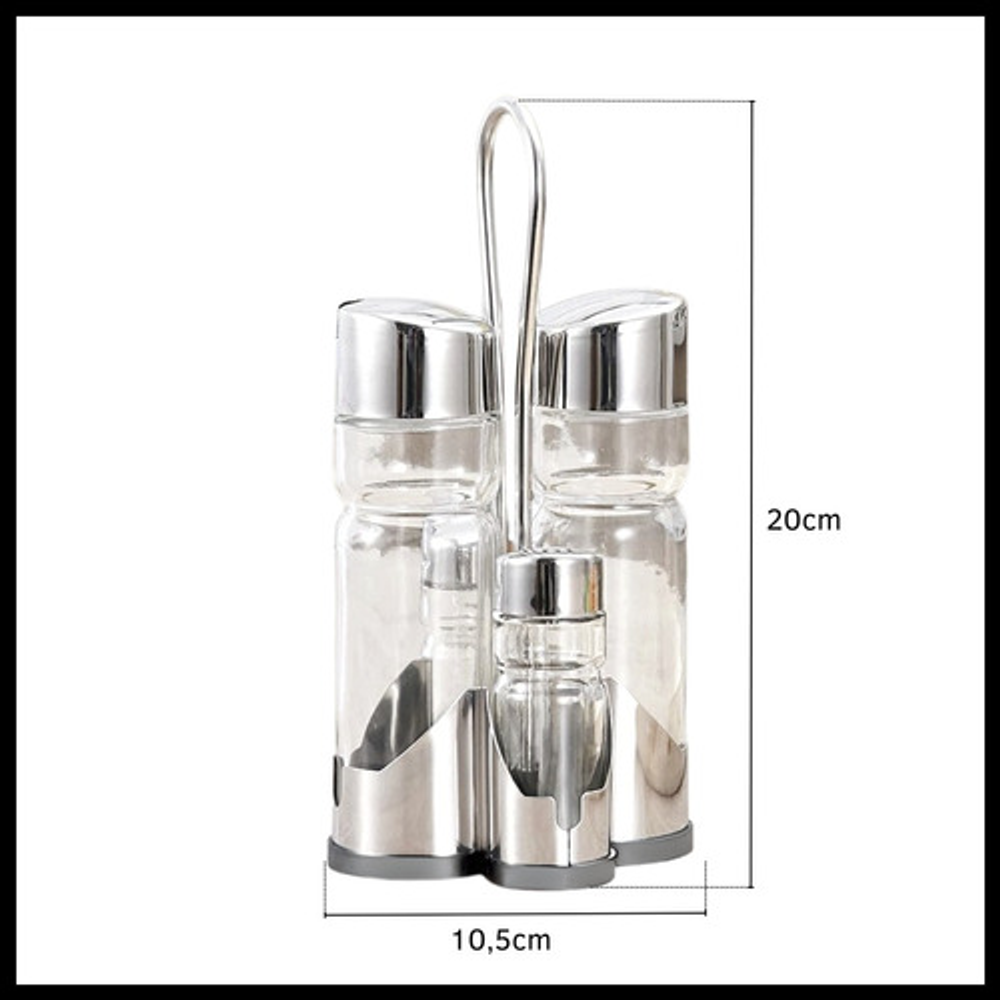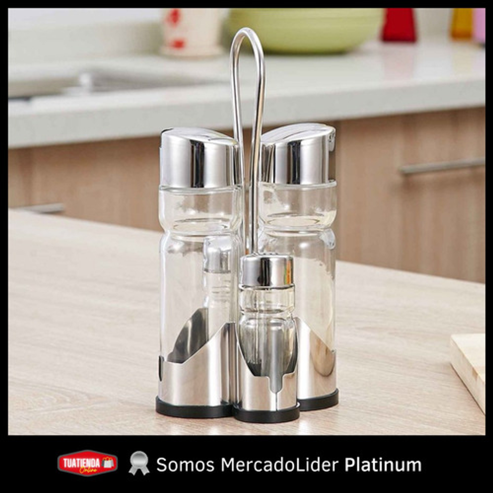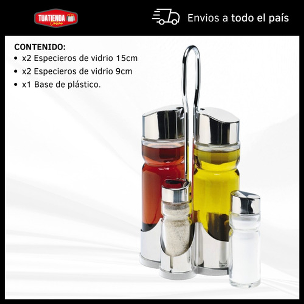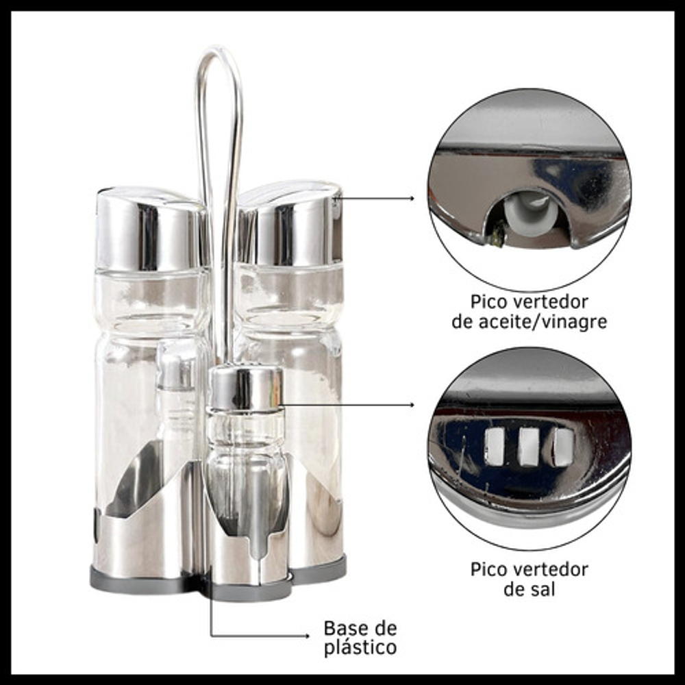 Características: • x4 Frascos de vidrio • Tapa de plástico con pico vertedor • Incluye salero, pimentero, aceitera y vinagrera • Incluye exhibidor de plástico