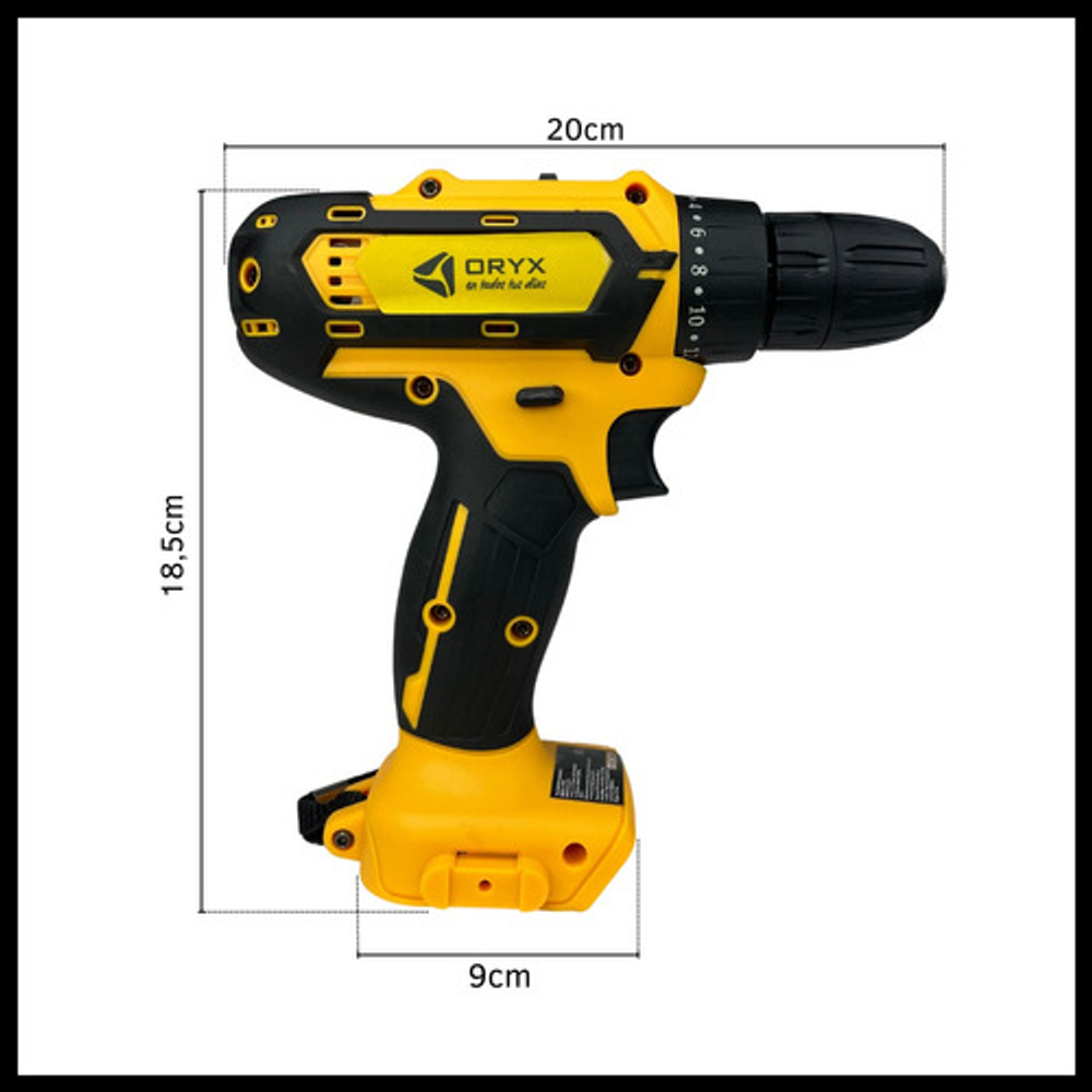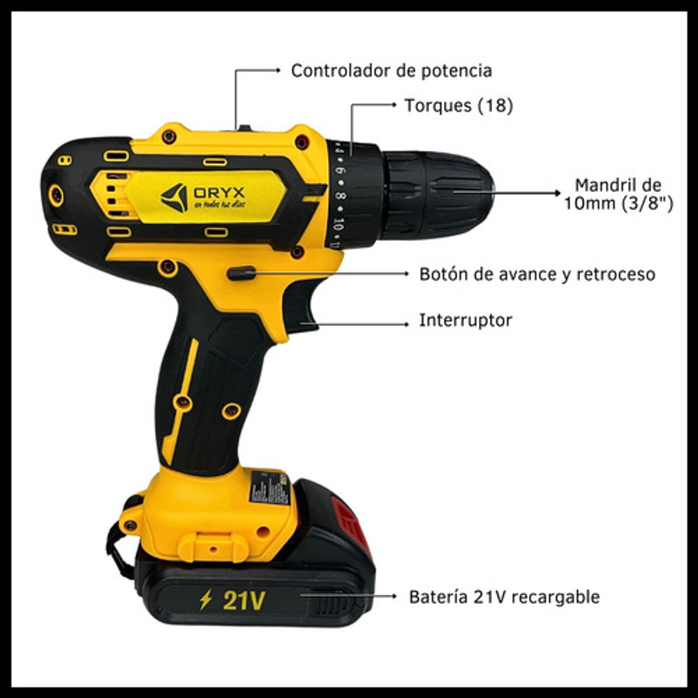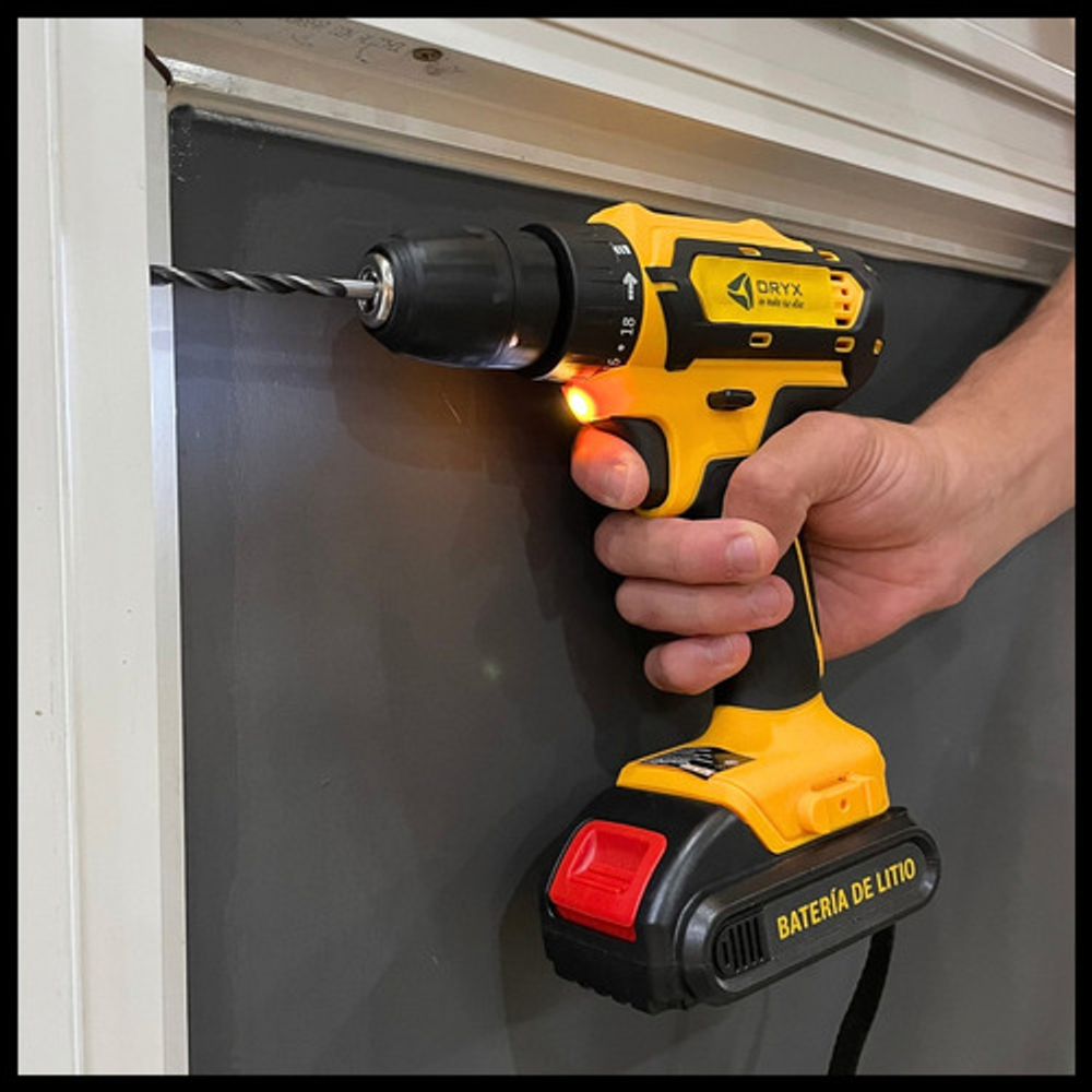 Características: • Botones de avance/retroceso para controlar la dirección de perforación y fijar o quitar tornillos rápidamente. • Maletín de transporte portátil para guardar y transportar. • Linterna LED de trabajo que se enciende durante su uso. • 2 Baterías recargables de 21V. • Kit de mechas y puntas. • Mandril de 10mm (3/8"). • Peso: 790grs. • 18 torques.