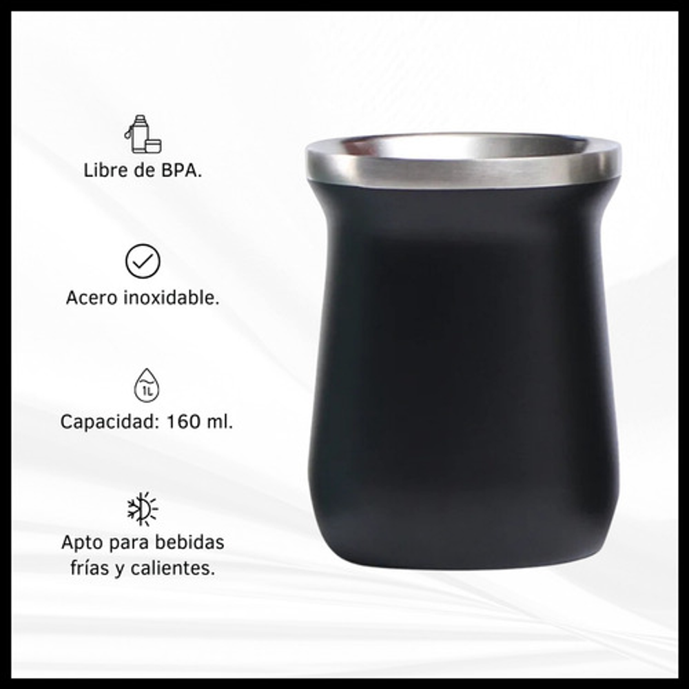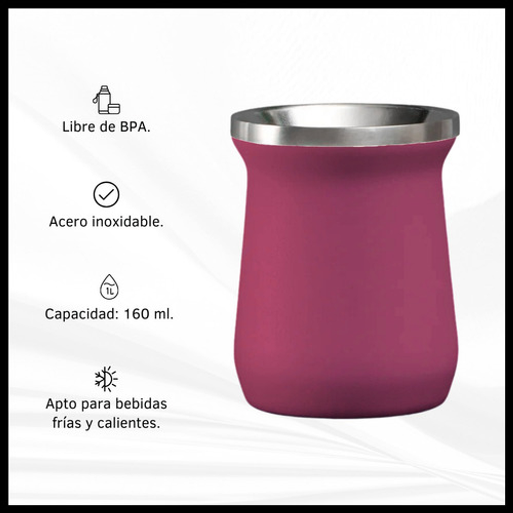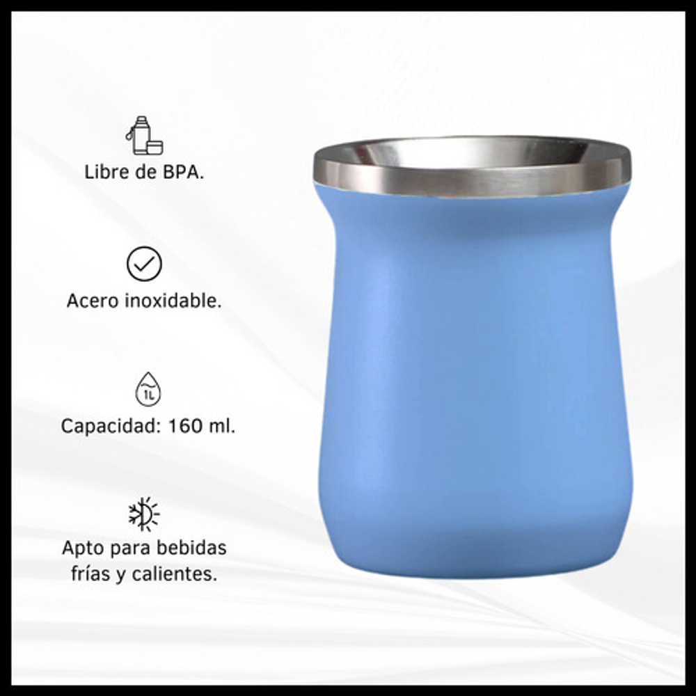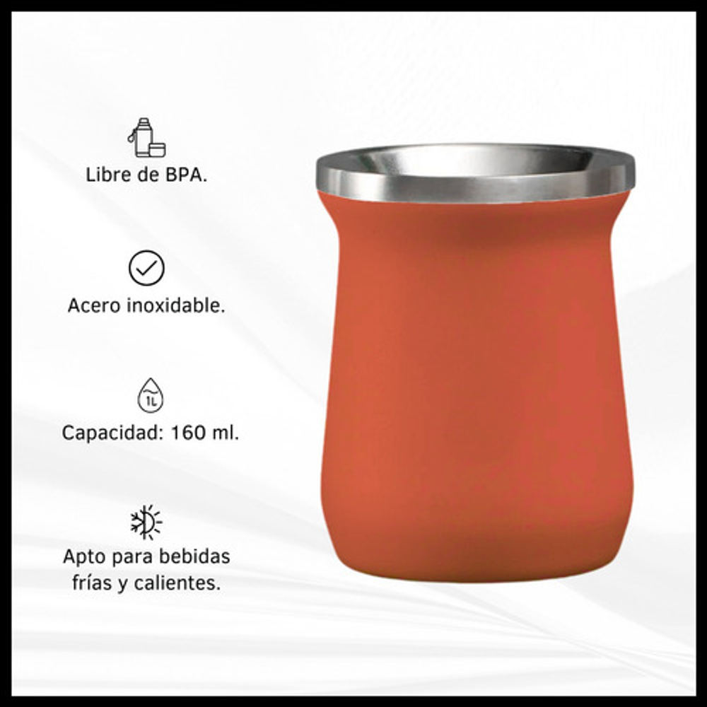 Características mate: -Boquilla con diseño para introducir hielo. -Material: Acero inoxidable. -Capacidad: 160 ml. -Apto frio/calor.