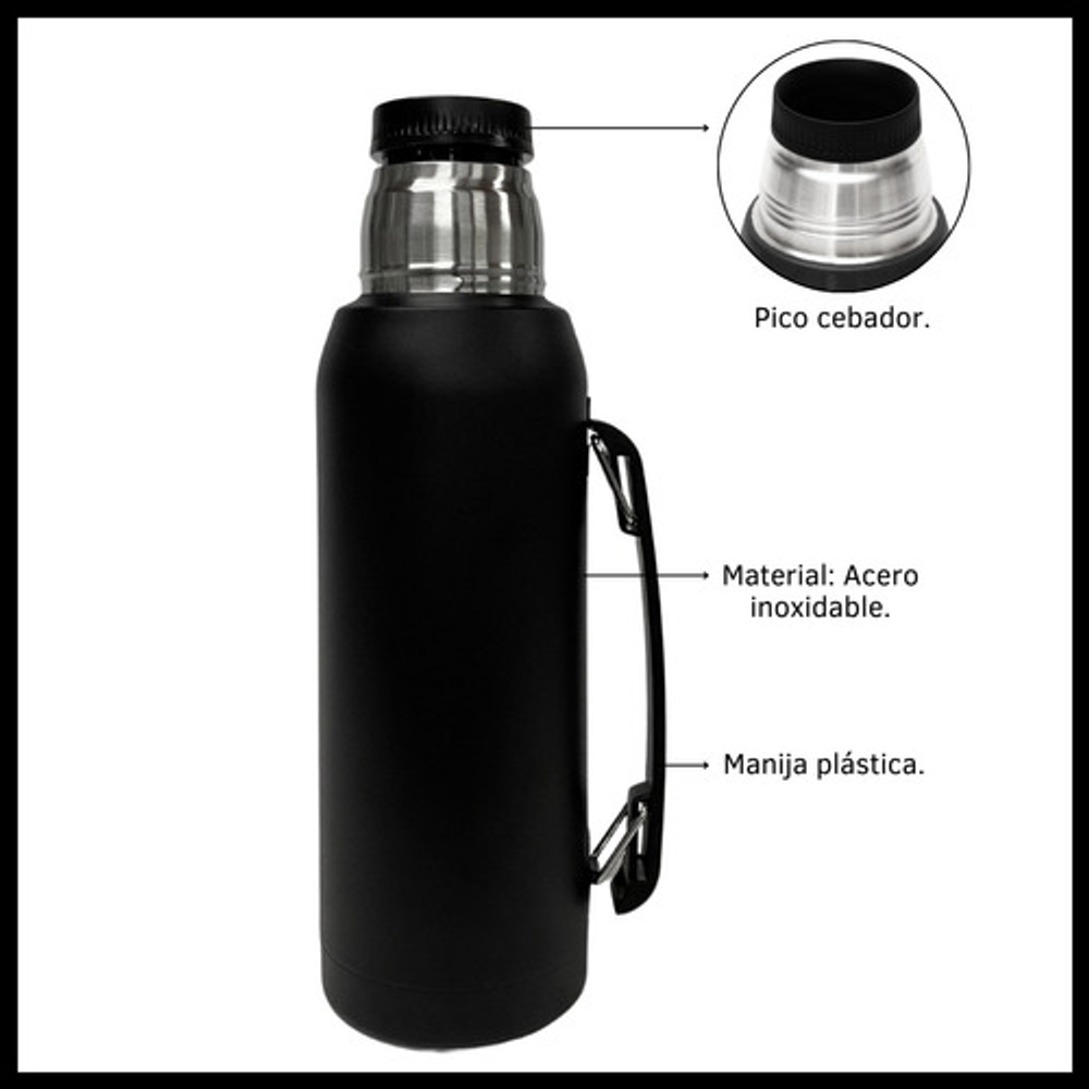 Características termo 1lts: -Apto para bebidas frías y calientes. -Material: Acero inoxidable -Capacidad: 1 litro. -Tapón cebador. -Libre de BPA.