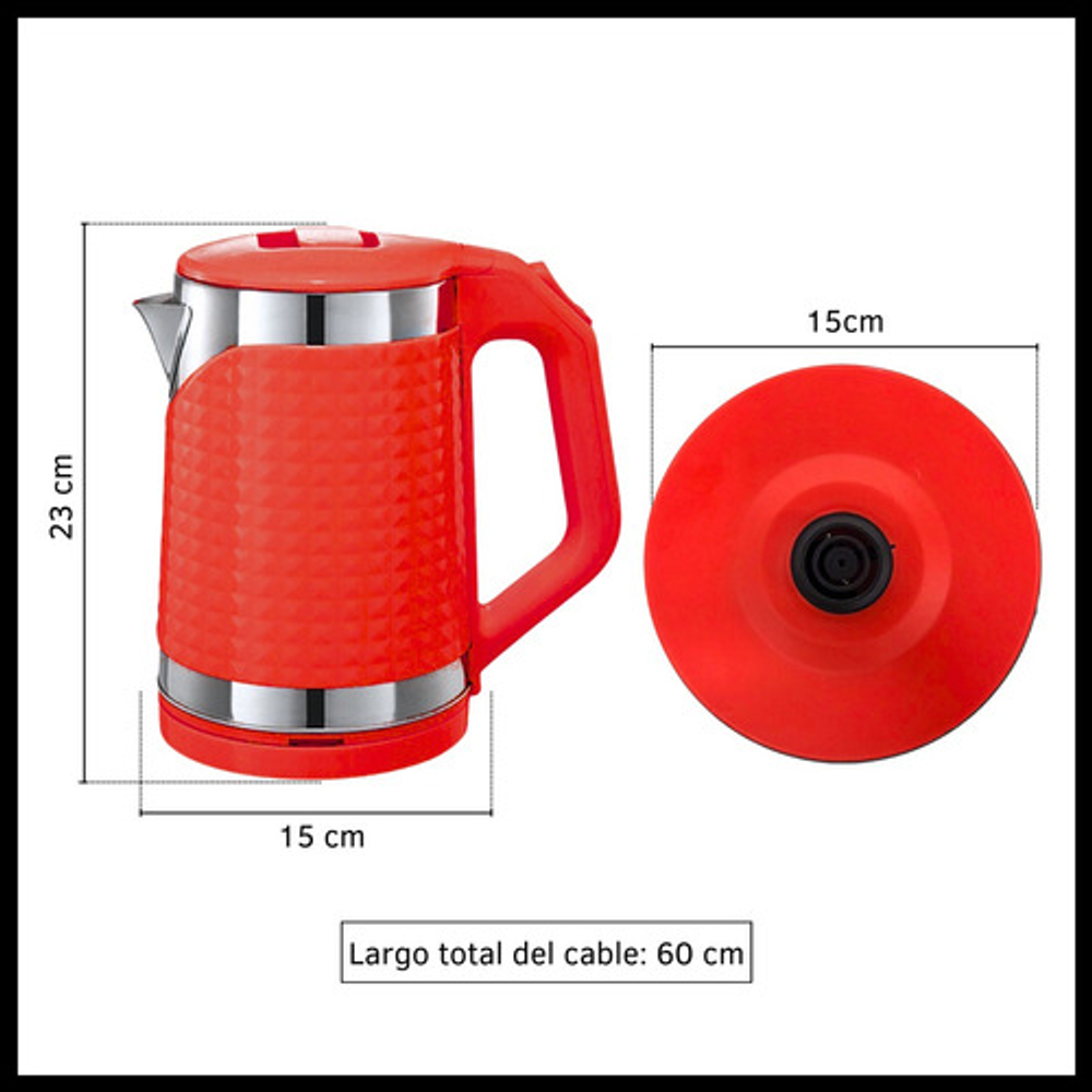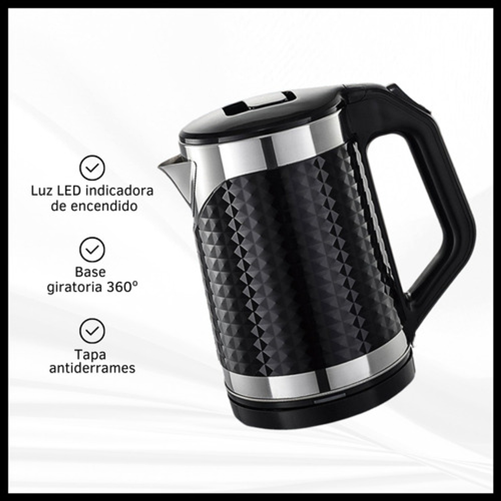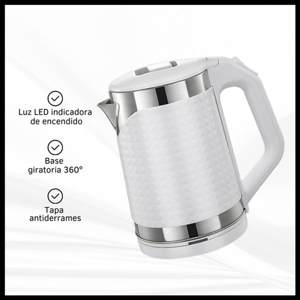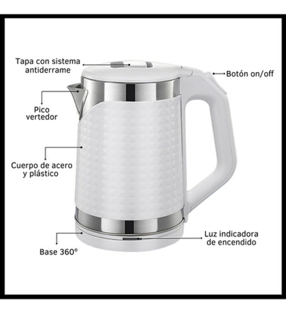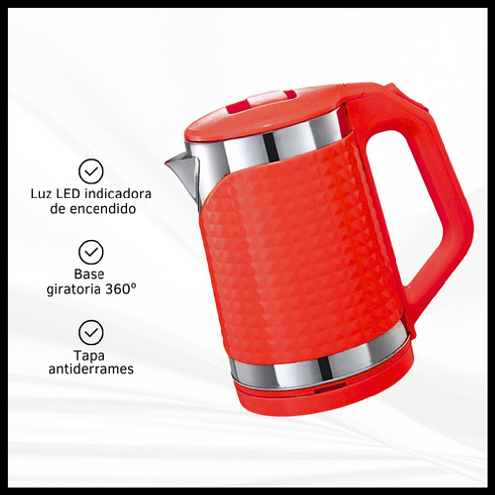 Características: • Potencia: 1500W. • Capacidad: 1.8lts. • Tapa antiderrame. • Base giratoria 360°. • Corte automático al hervir. • Luz indicadora de encendido. • Material: acero inoxidable y plástico.