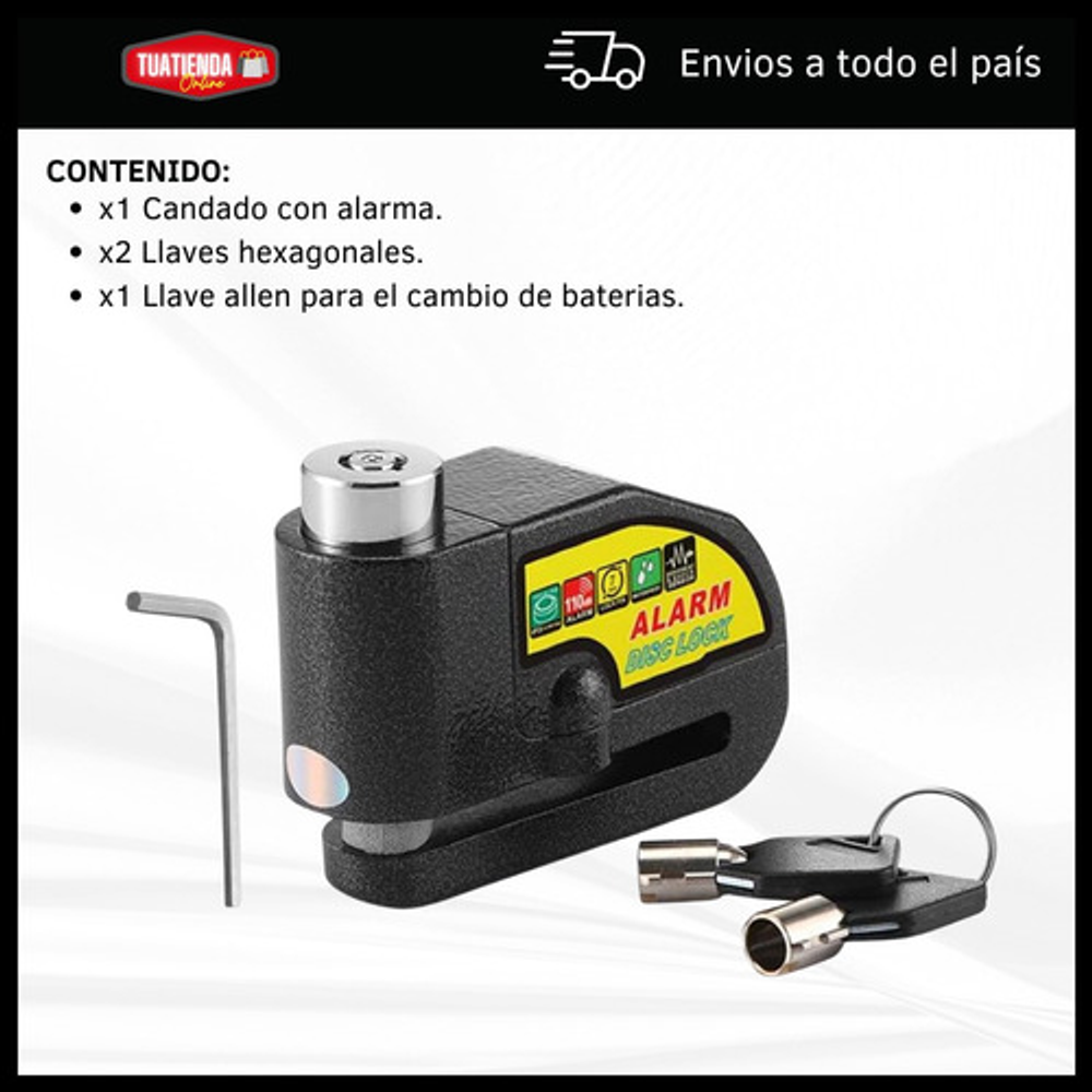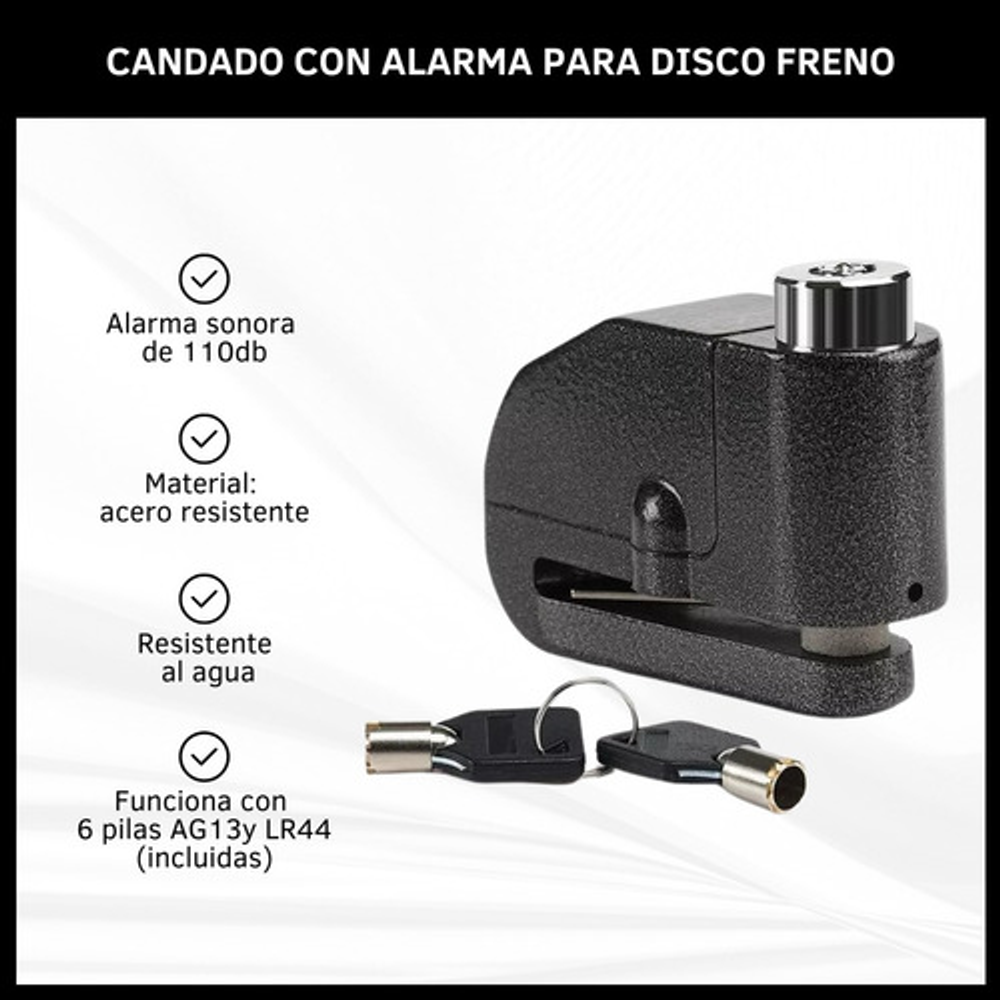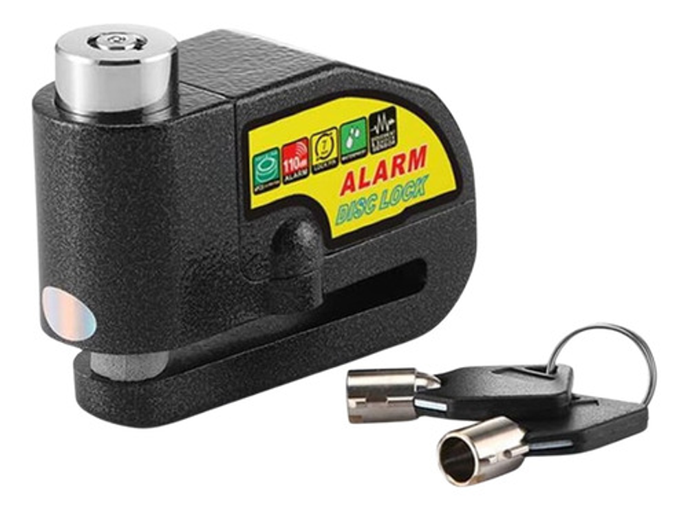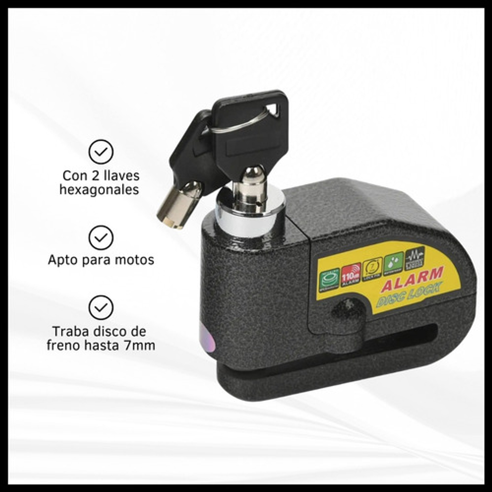 Características: • Alarma: 110dB. • Llaves hexagonales. • Aprueba de agua y polvo. • Material: acero de alta resistencia. • Alimentación: 6 pilas AG13 y LR44 (incluidas). • La alarma suena tan fuerte que será insoportable para el ladrón y fácil de oír para el dueño del vehículo. • Adecuado para la mayoría de motocicletas y bicicletas con frenos de disco de 7mm. • Ultra resistente y duradero.