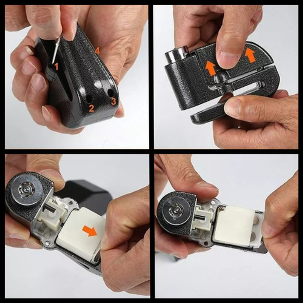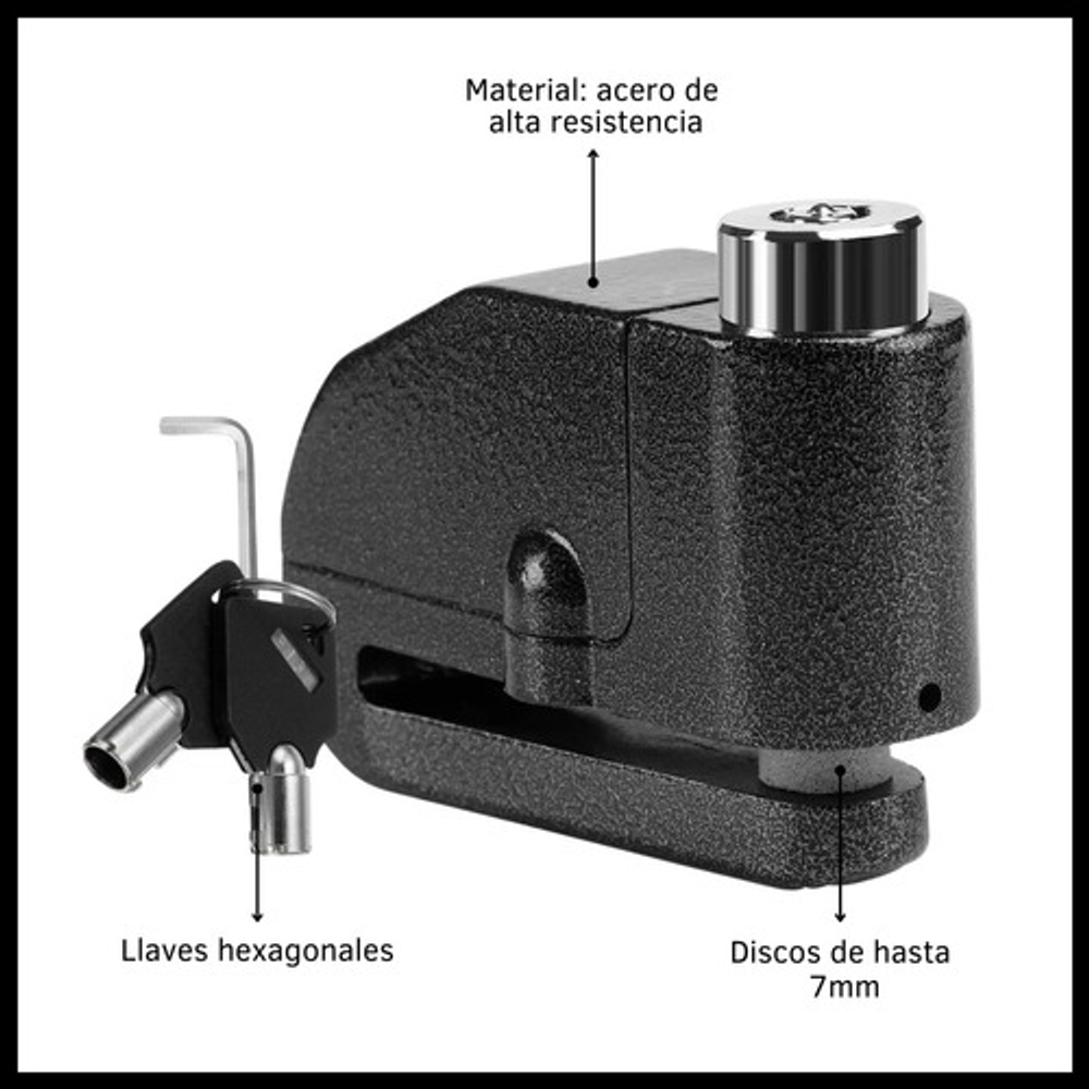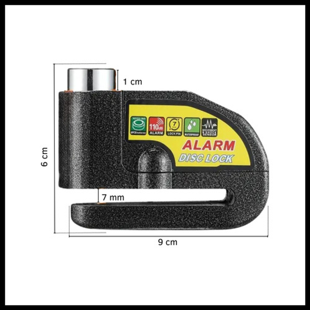 Características: • Alarma: 110dB. • Llaves hexagonales. • Aprueba de agua y polvo. • Material: acero de alta resistencia. • Alimentación: 6 pilas AG13 y LR44 (incluidas). • La alarma suena tan fuerte que será insoportable para el ladrón y fácil de oír para el dueño del vehículo. • Adecuado para la mayoría de motocicletas y bicicletas con frenos de disco de 7mm. • Ultra resistente y duradero.
