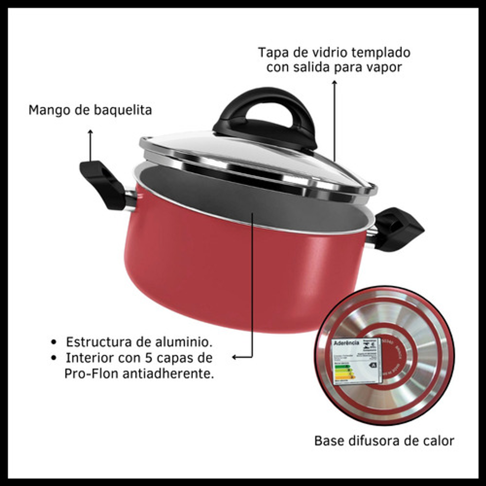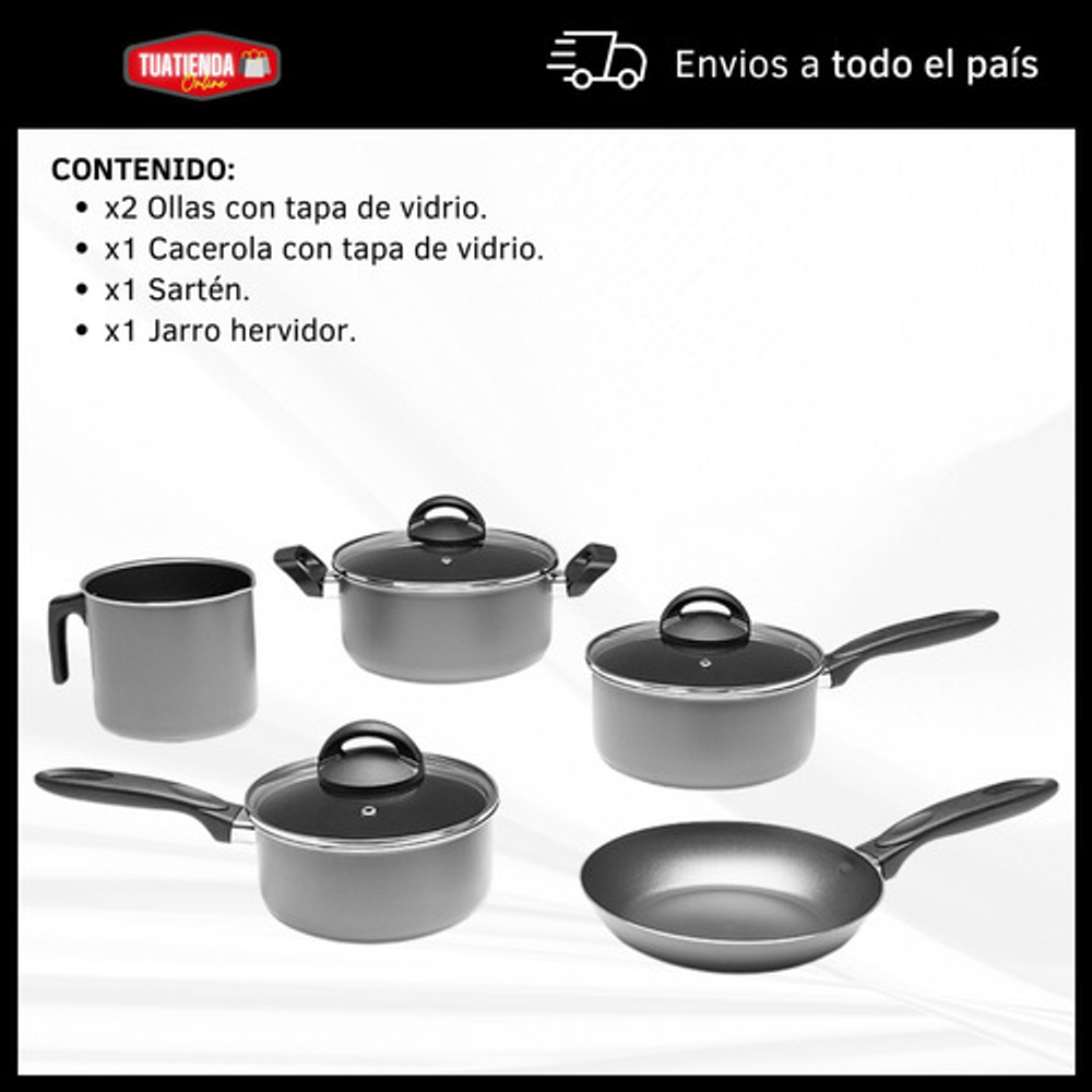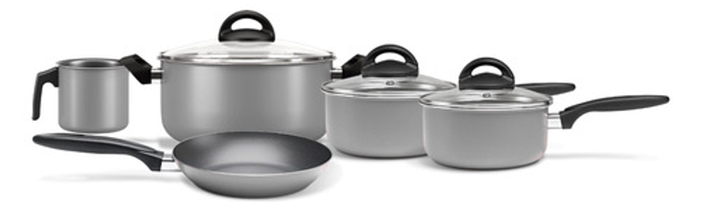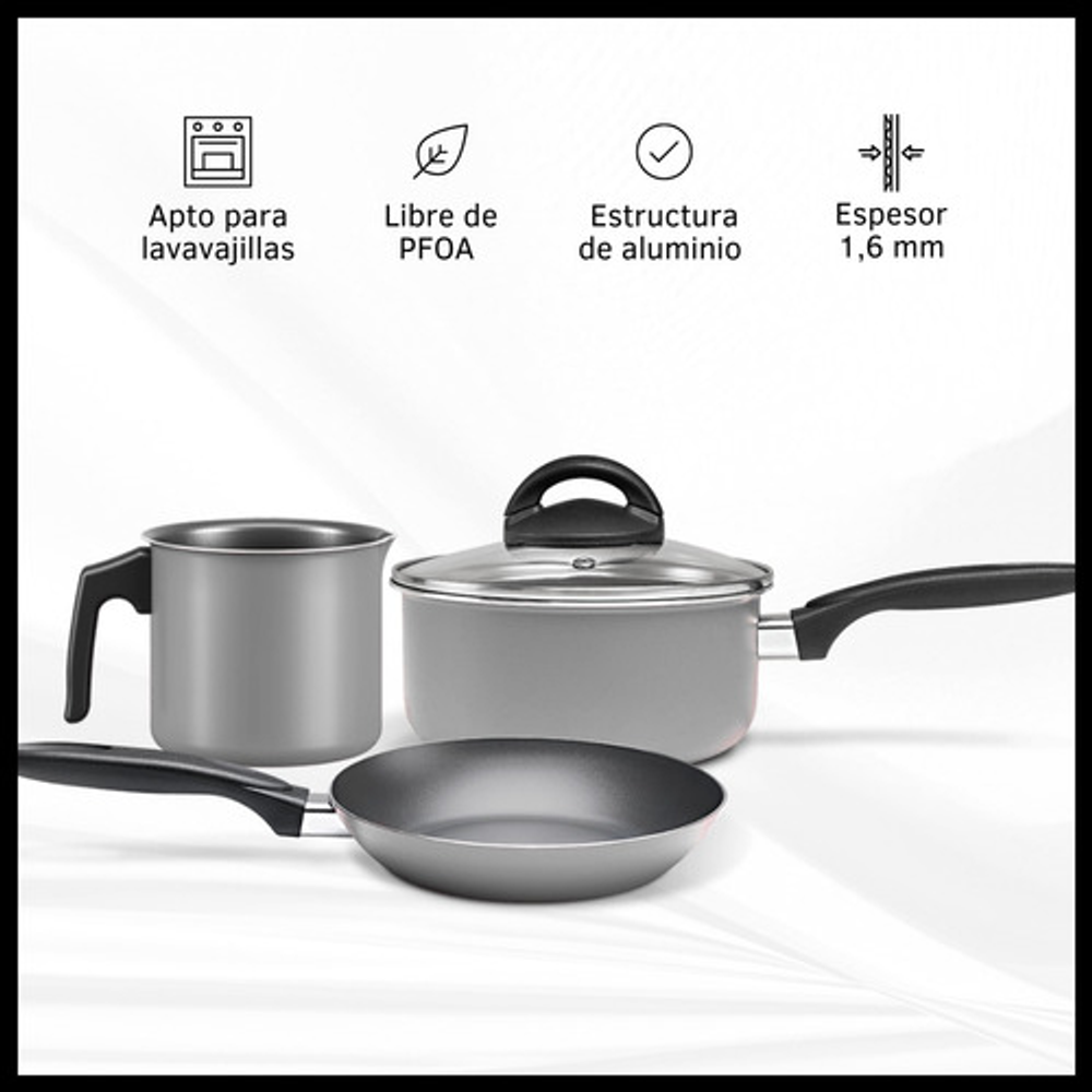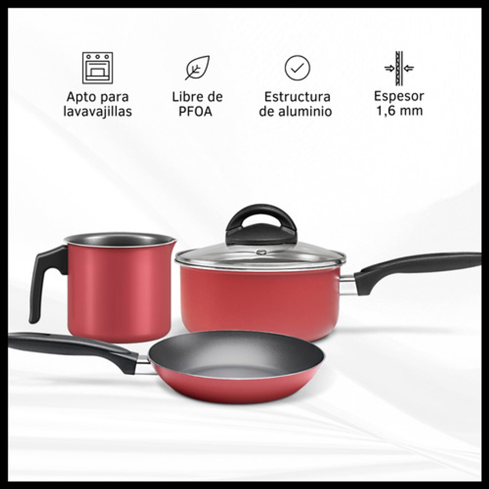 Características: • Incluye: 1 cacerola con tapa de vidrio, 2 ollas con tapa de vidrio, 1 jarro hervidor y 1 sartén. • Piezas fabricadas en aluminio. • No se pega y es fácil de limpiar. • Aptas para lavavajillas. • Cuentan con base difusora de calor. • NO aptas para cocinas de inducción. • Las piezas son libres de PFOA. • Interior con 5 capas de Pro-Flon antiadherente. • Espesor de 1,6mm. • El origen de estos productos es Brasil.