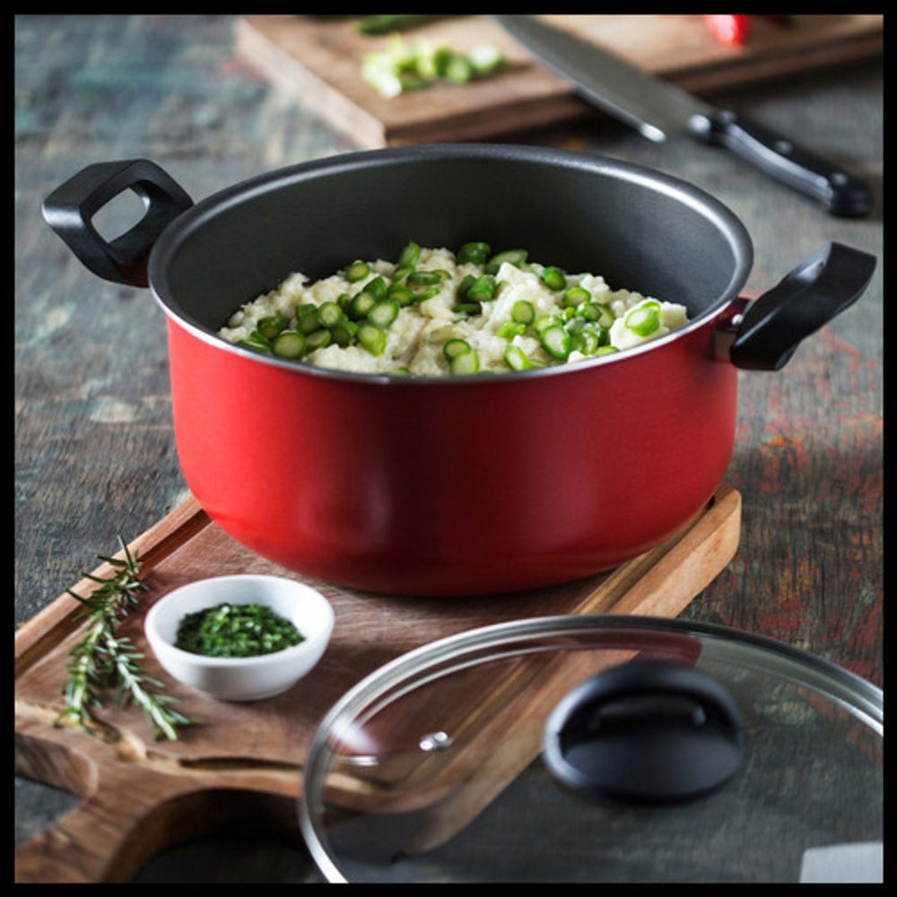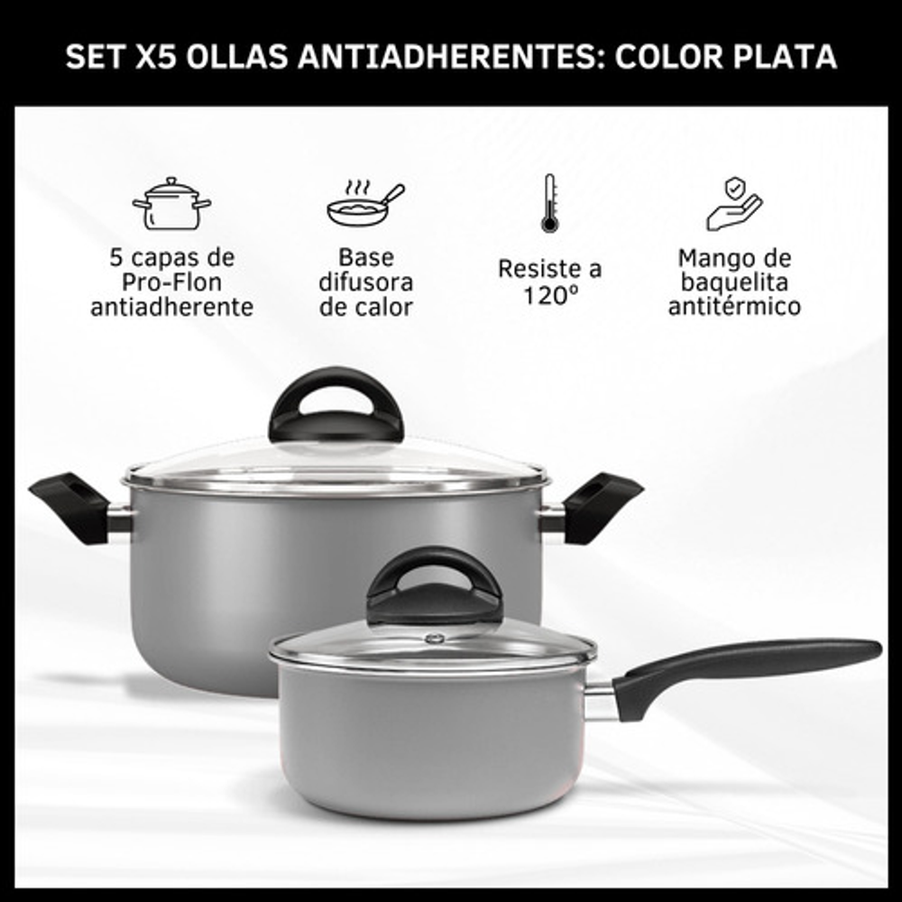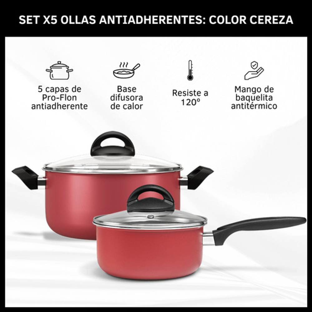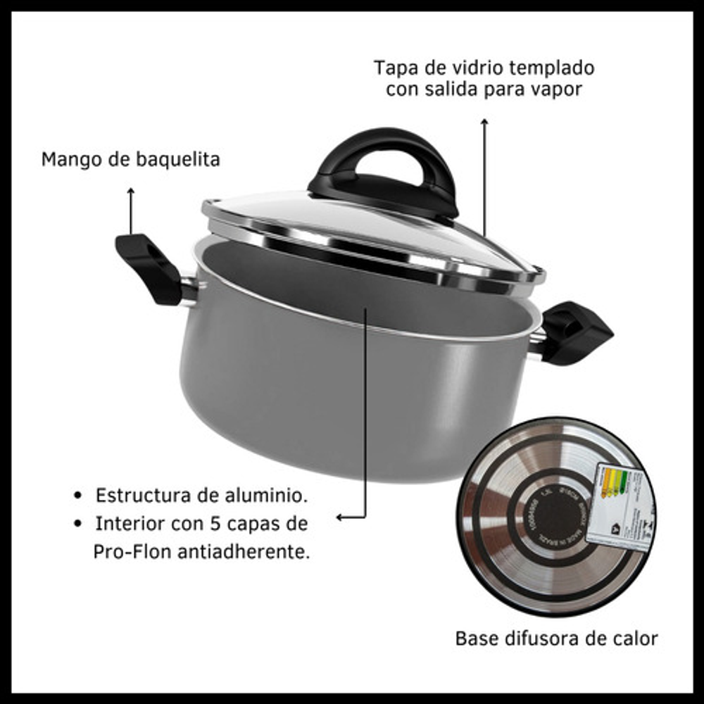 Características: • Incluye: 1 cacerola con tapa de vidrio, 2 ollas con tapa de vidrio, 1 jarro hervidor y 1 sartén. • Piezas fabricadas en aluminio. • No se pega y es fácil de limpiar. • Aptas para lavavajillas. • Cuentan con base difusora de calor. • NO aptas para cocinas de inducción. • Las piezas son libres de PFOA. • Interior con 5 capas de Pro-Flon antiadherente. • Espesor de 1,6mm. • El origen de estos productos es Brasil.