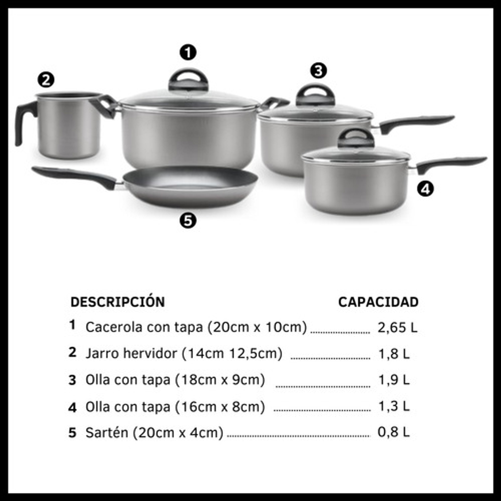 Piezas incluidas: Cacerola Con Tapa,Olla Con Tapa 1.9 L,Olla Con Tapa 1.3 L,Sarten,Hervidor