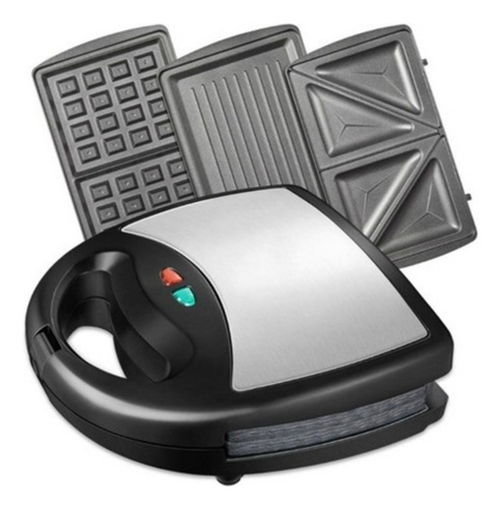 Características: • 3 funciones en 1: Waflera, sandwichera y grill. • Potencia de 750W. • Placas antiadherentes intercambiables. • Luces indicadoras de uso.