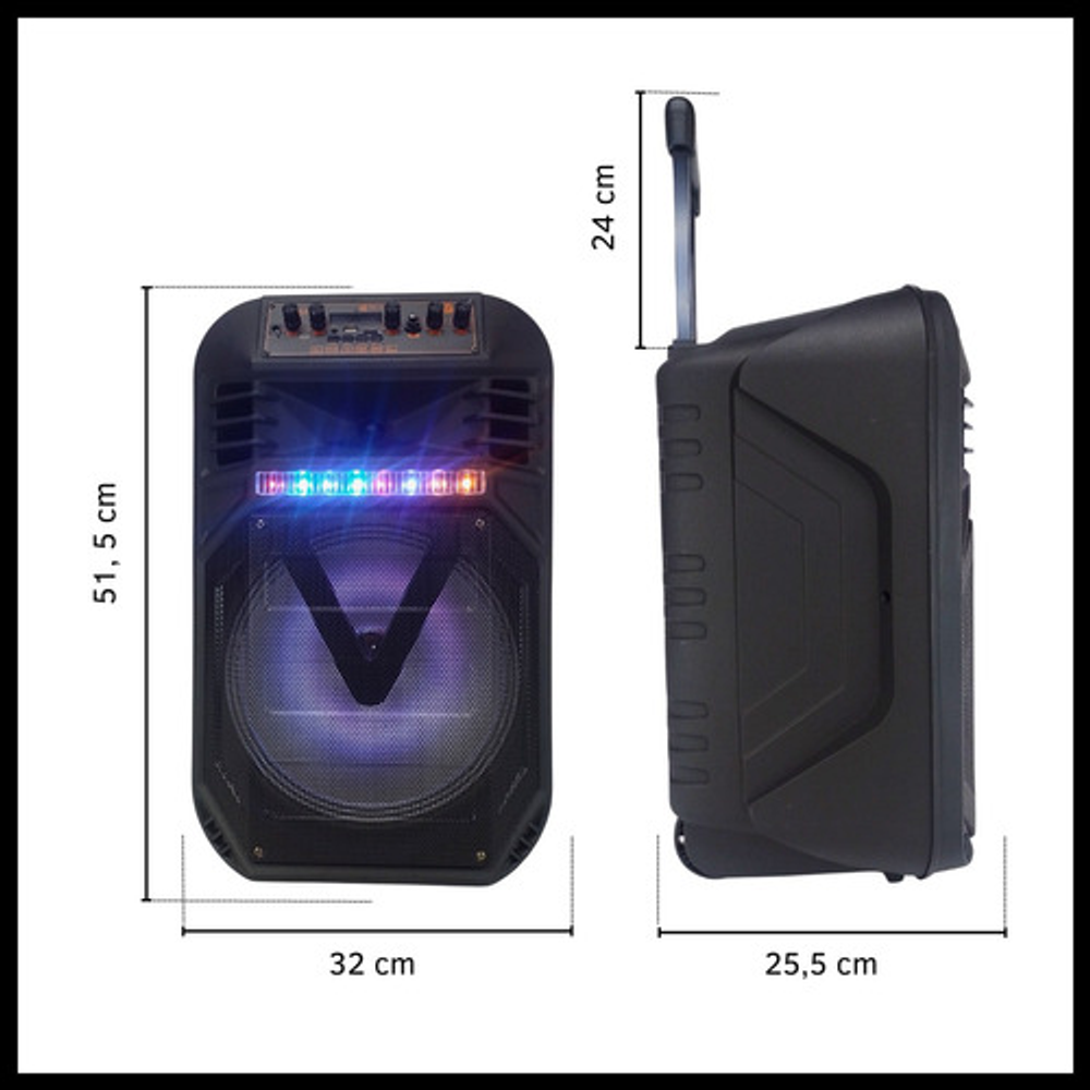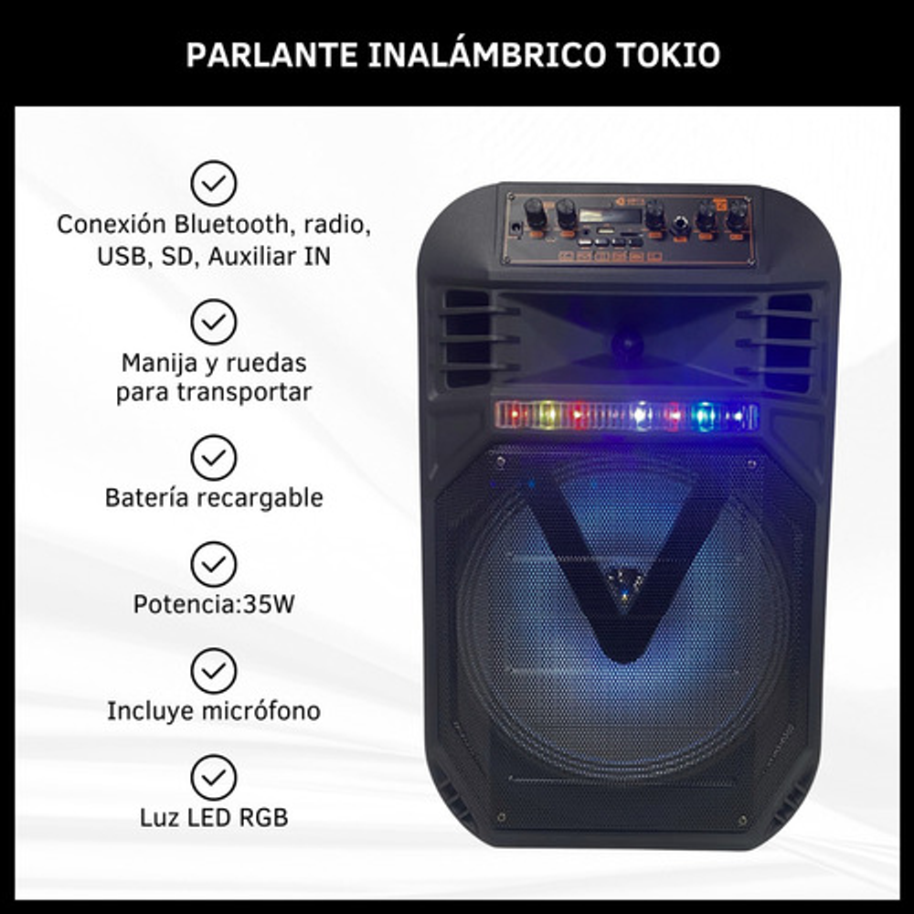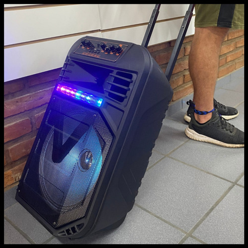 Características: • Conexión bluetooth, USB, SD y Aux IN. • Parlante con manija y ruedas para transportar. • Posee sistema TWS. • Batería recargable. • Potencia: 35W. • Incluye micrófono. • Radio FM. • Luces LED RGB.