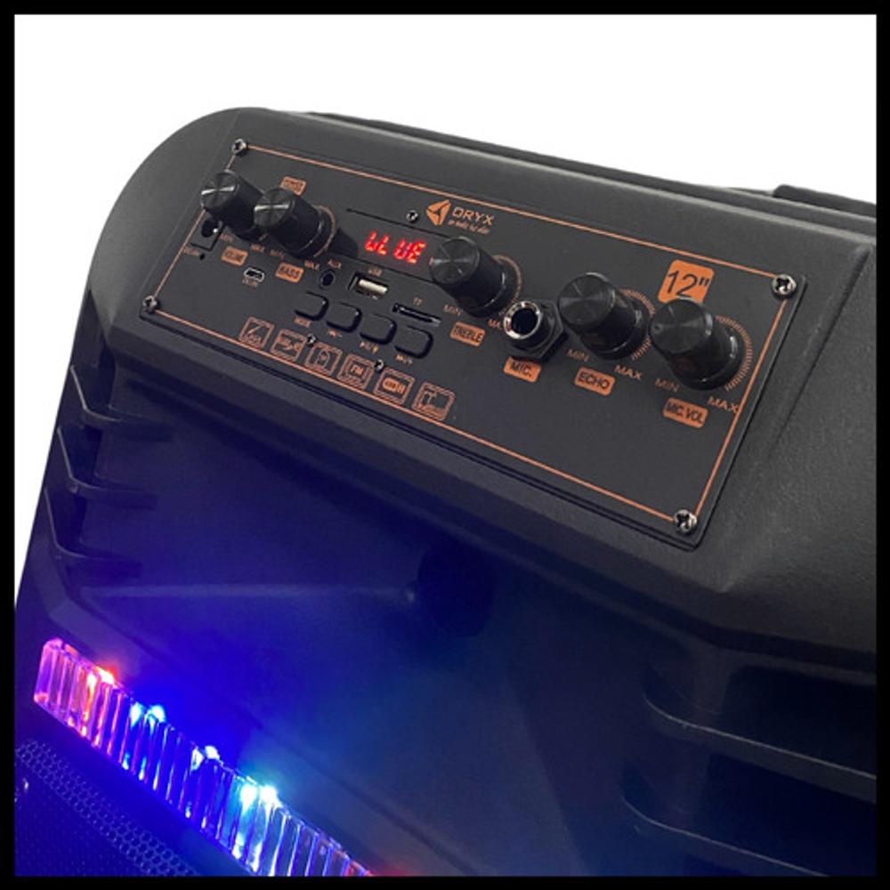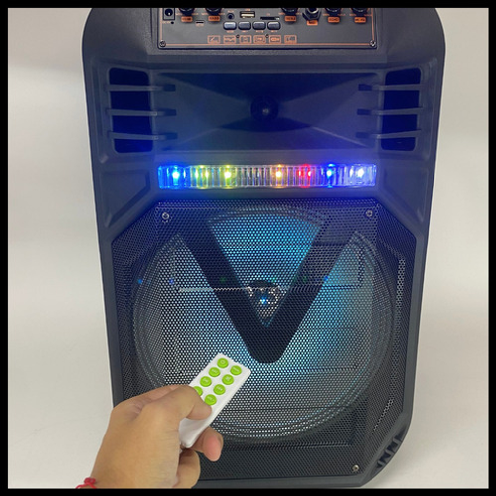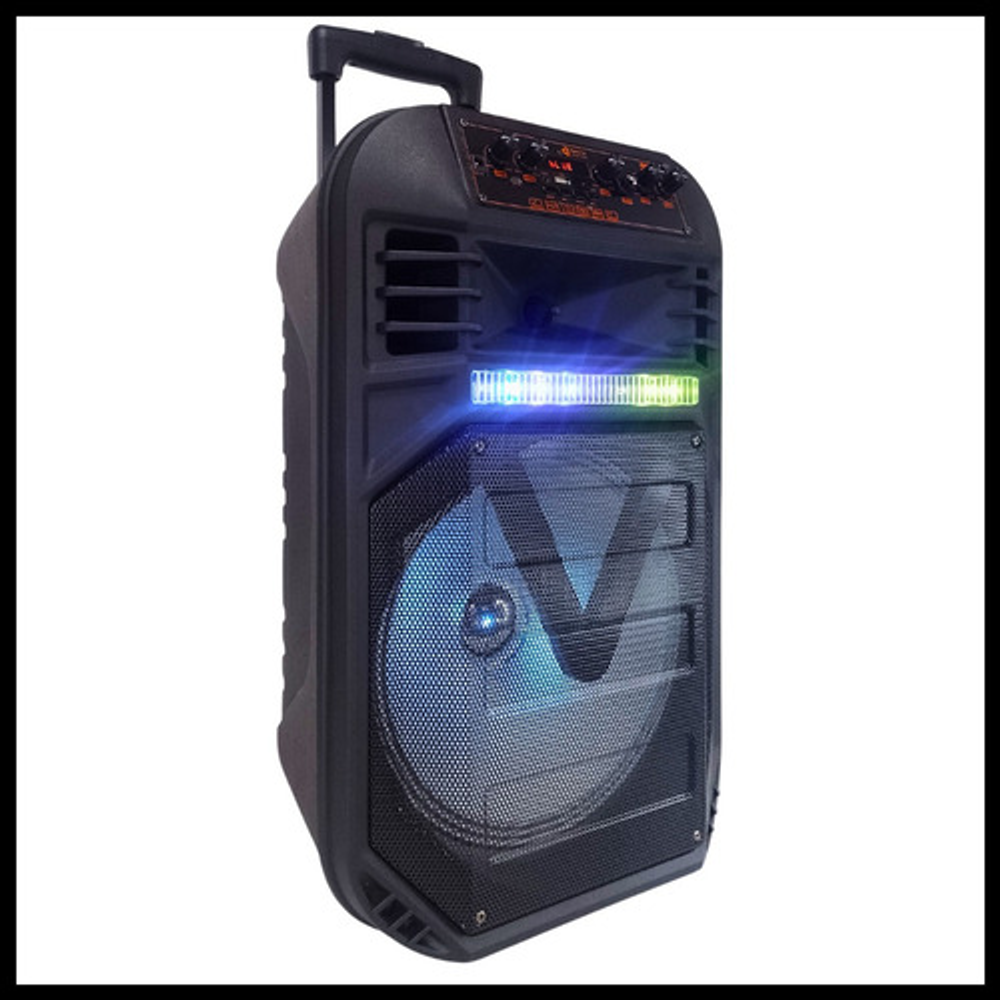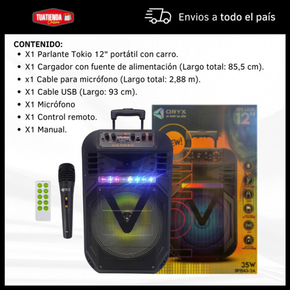 Características: • Conexión bluetooth, USB, SD y Aux IN. • Parlante con manija y ruedas para transportar. • Posee sistema TWS. • Batería recargable. • Potencia: 35W. • Incluye micrófono. • Radio FM. • Luces LED RGB.