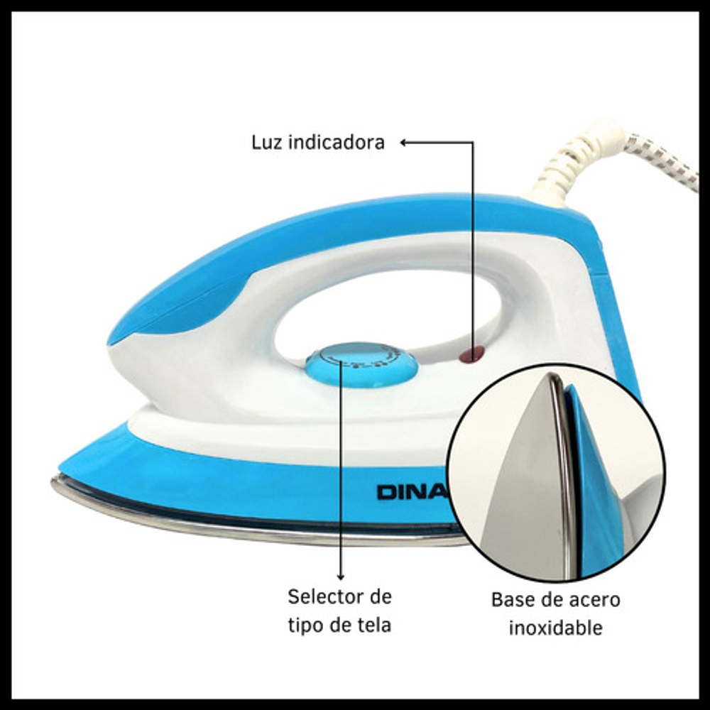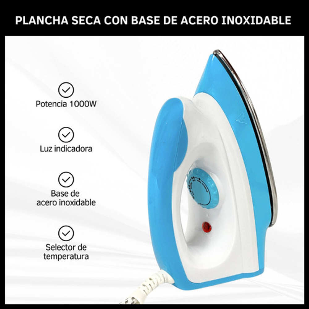 Características: • Potencia 1000W. • Base de acero inoxidable. • Selector de temperatura. • Luz indicadora. • Incluye manual de uso. • Perilla para seleccionar tipo de tela.