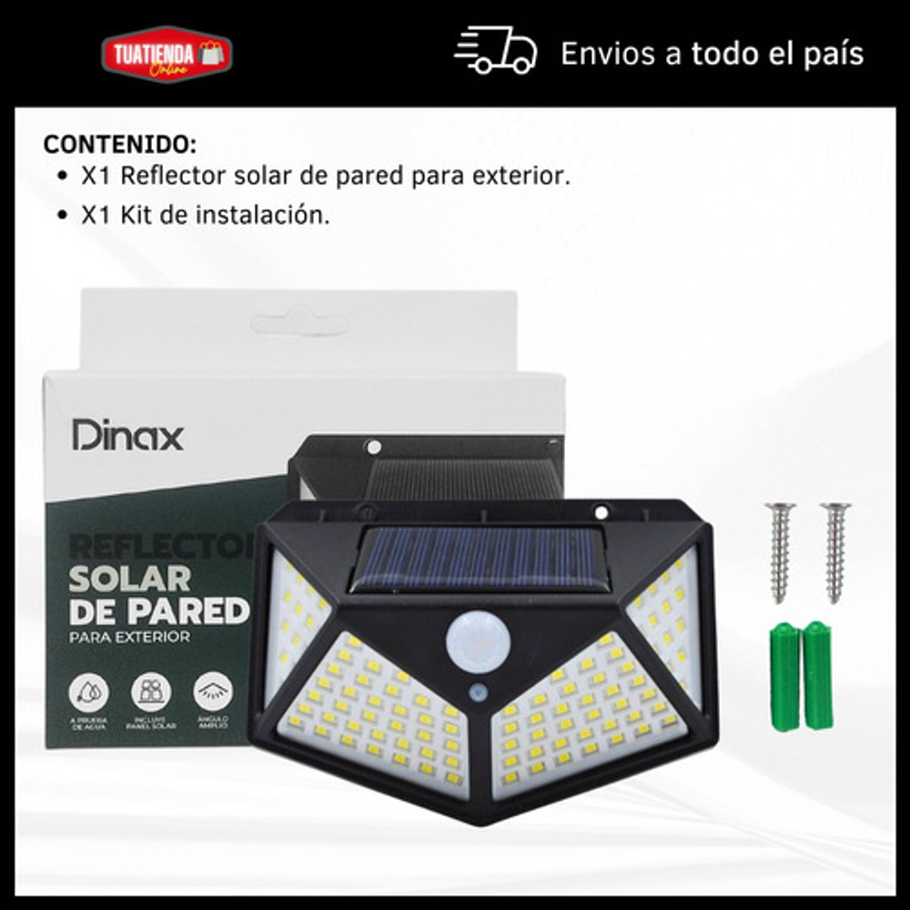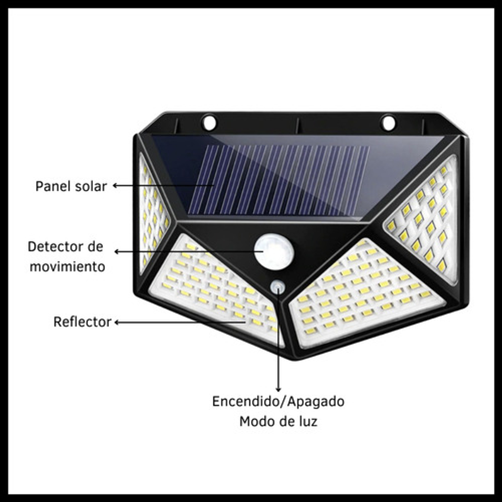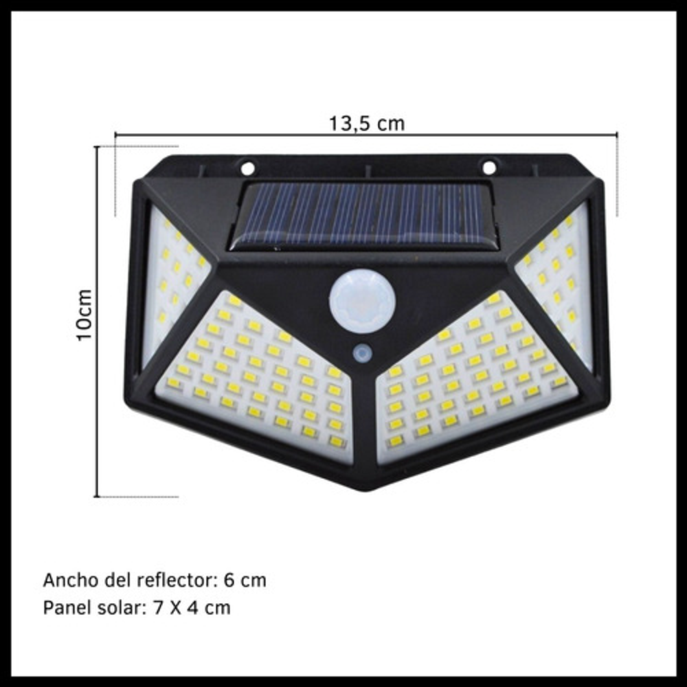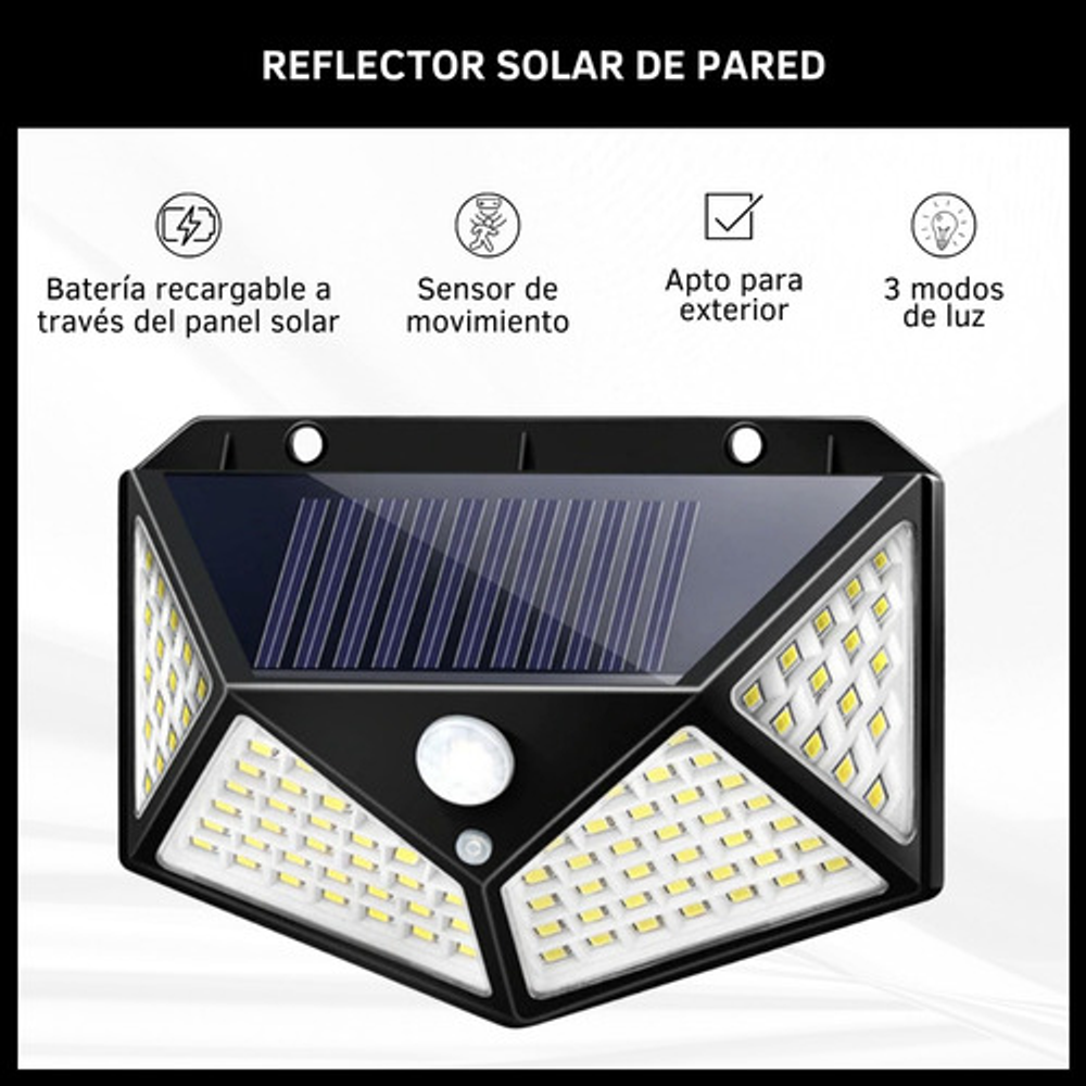 Características: • Batería recargable a través del panel solar. • Sensor de movimiento. • Apto para exterior. • A prueba de agua. • 3 modos de luz. • Ángulo amplio.