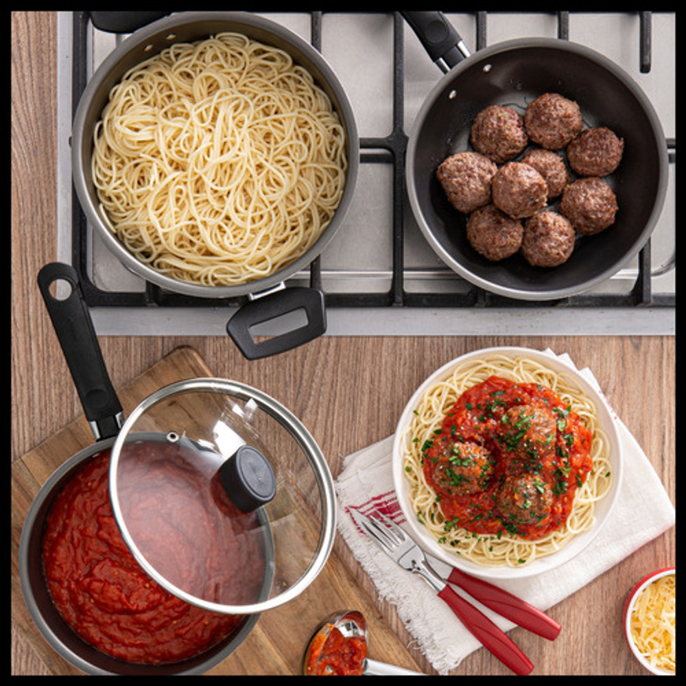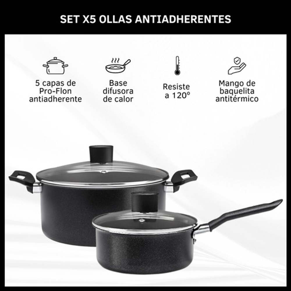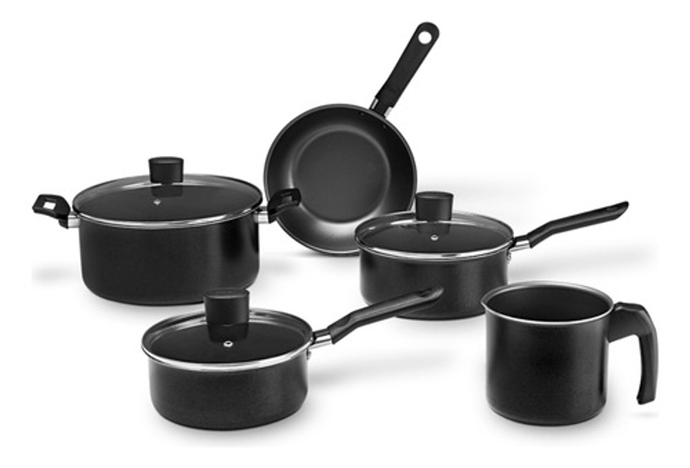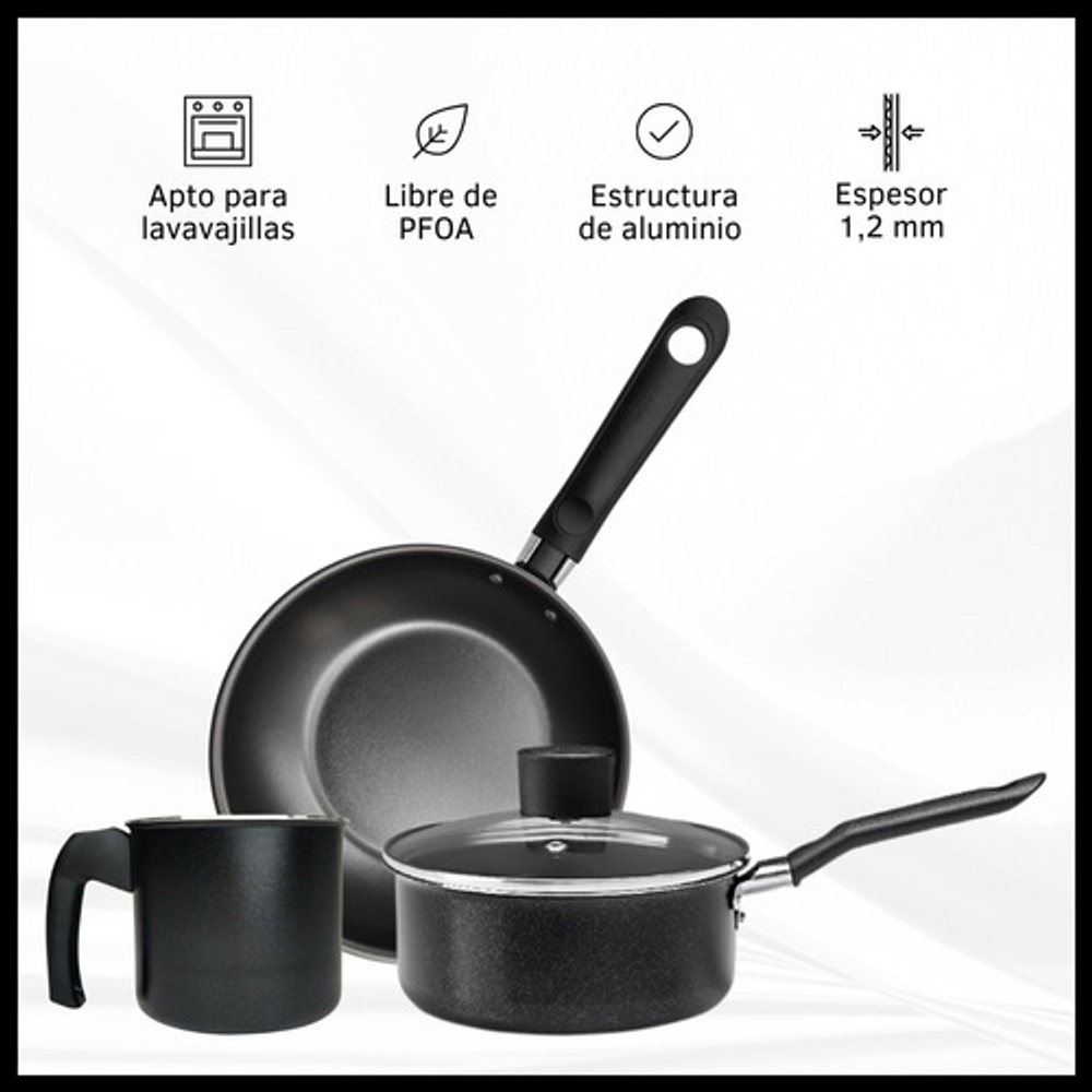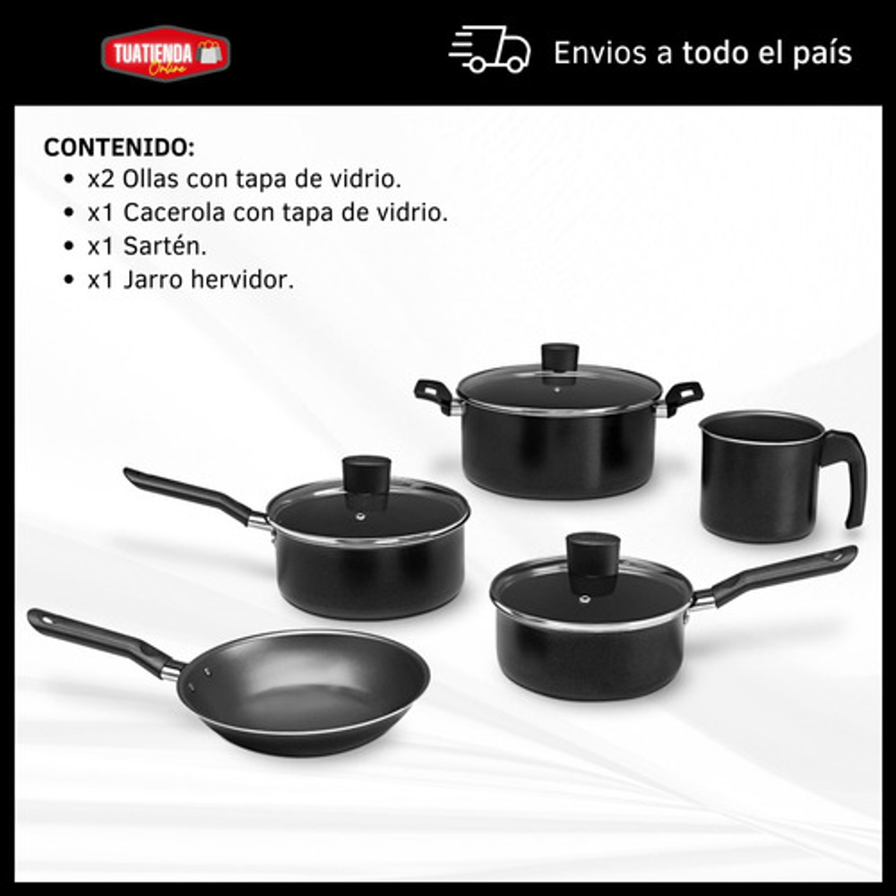 Características: • Incluye: x1 Cacerola con tapa de vidrio, x2 Ollas con tapa de vidrio, x1 Jarro hervidor y x1 Sartén. • El material exterior de todas las piezas es aluminio. • Interior con 5 capas de Pro-Flon antiadherente. • Apto para lavavajillas • Piezas libres de PFOA. • Cuentan con base difusora de calor.