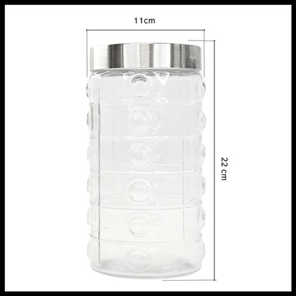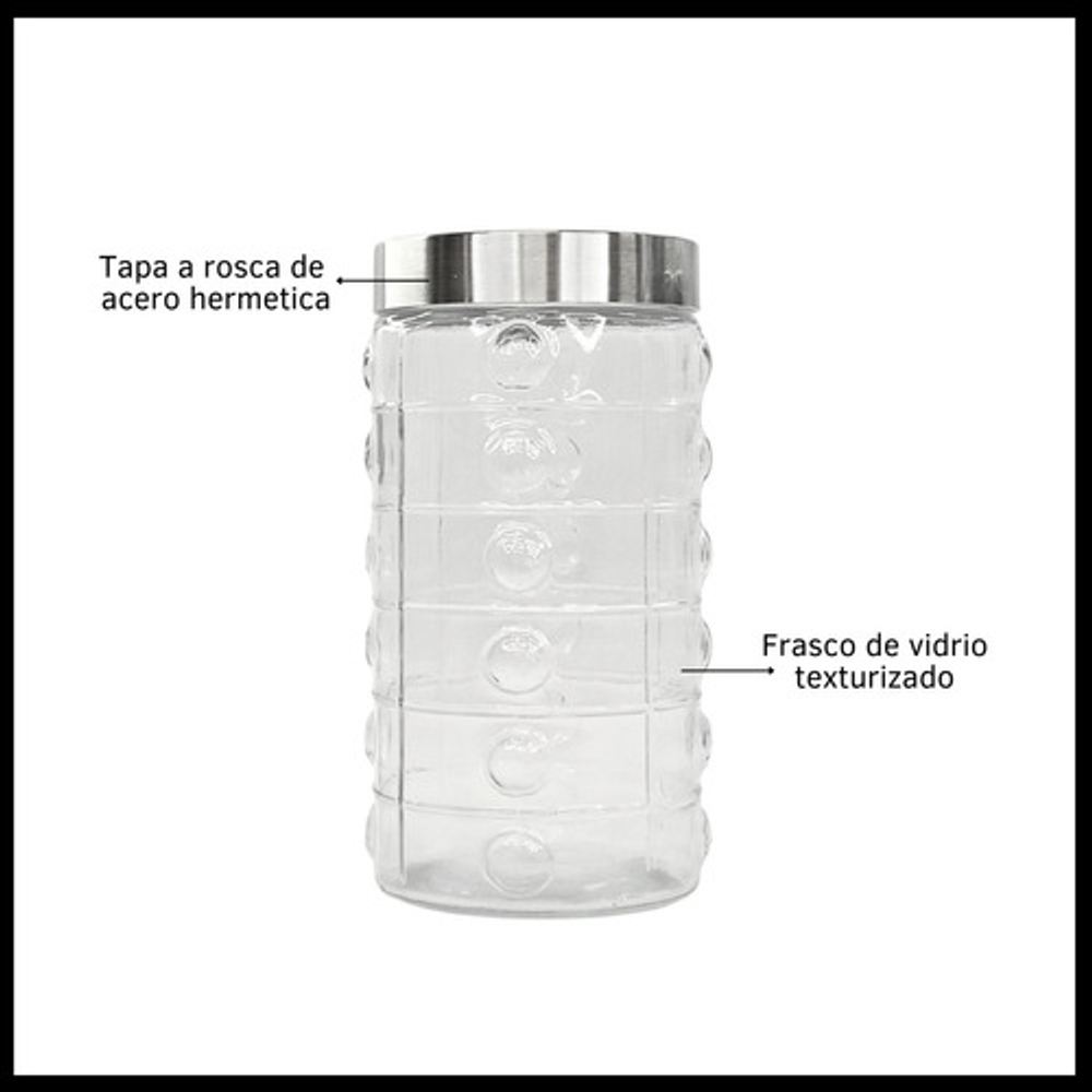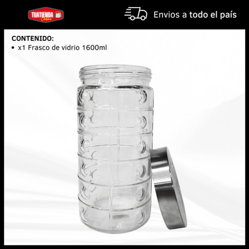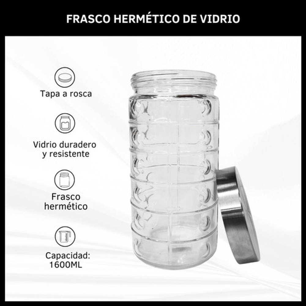 Características: • Capacidad: 1600ml. • Diseño transparente. • Tapa hermética a rosca. • Fabricado con vidrio de alta calidad. • Dimensiones: 22 cm de altura y 11 cm de ancho. • Para guardar alimentos secos como arroz, pasta, granos, cereales, y mucho más.