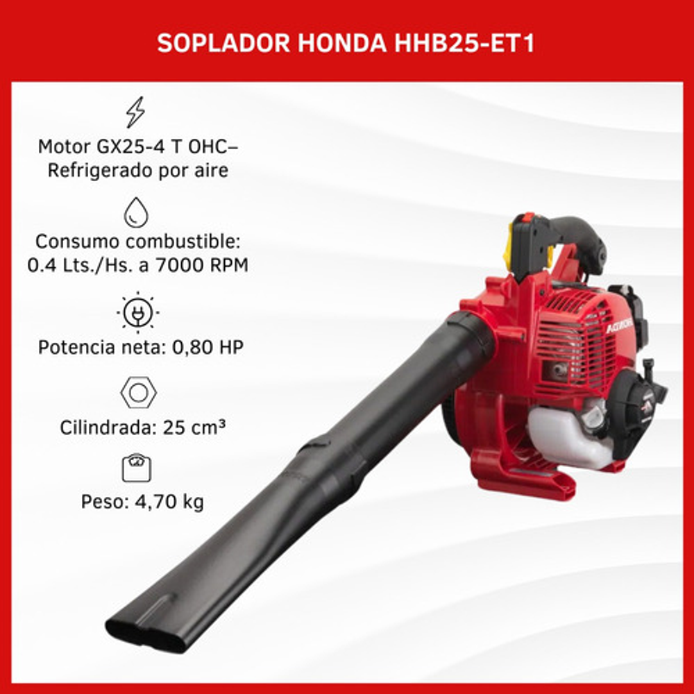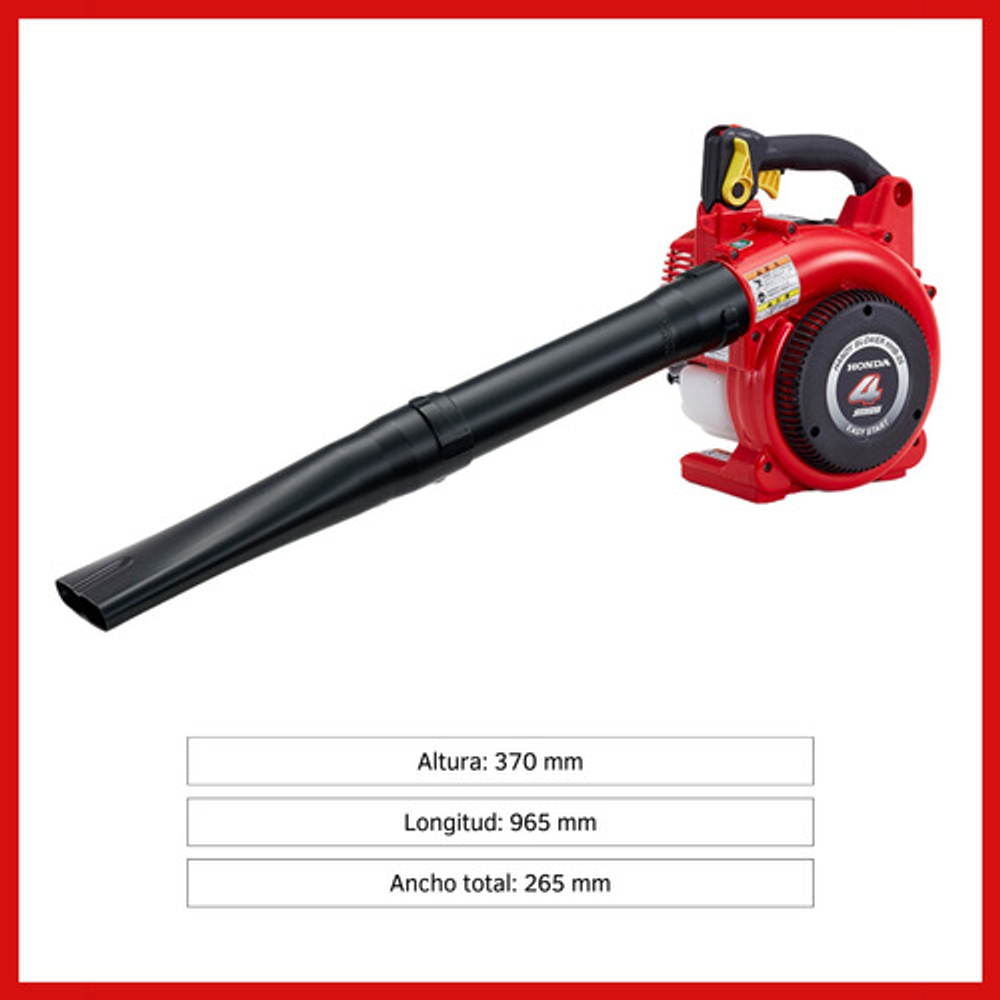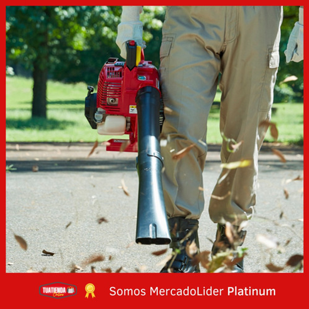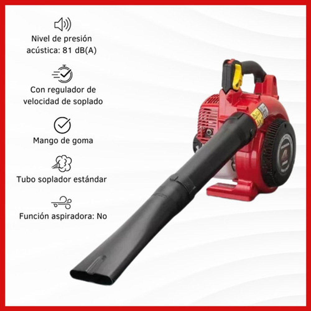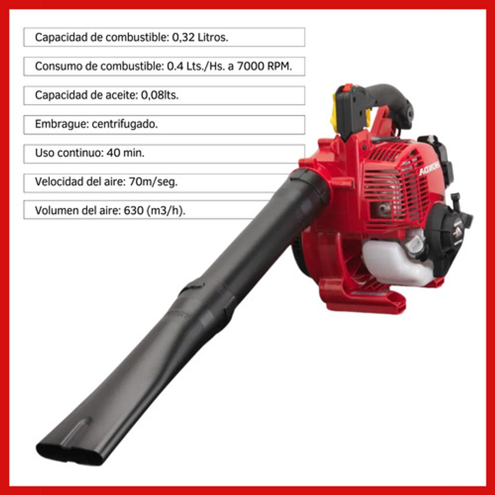 Características: -Tipo de Motor: GX25 - OHC 4 Tiempos - Refrigerado por Aire. -Cilindrada: 25 cm3. -Potencia Nominal: 0.8 HP a 7000 RPM. -RPM Máxima: 1 HP a 7000 RPM. -Sist. Arranque: Manual. -Altura: 370 mm. -Longitud: 965 mm. -Ancho Total: 265 mm. -Peso en Seco: 4.7 Kg. -Capacidad de Combustible: 0.32 Lts. -Consumo de Combustible: 0.4 Lts./Hs. a 7000 RPM. -Capacidad de Aceite: 0.08 Lts. -Tipo de Embrague : Centrífugo. -Tiempo en Operación Continua: 40 Min. -Velocidad del Aire:70 m/seg. -Volumen del Aire: 630 (m3/h). -Nivel de Presión Acústica: 81 dB(A). -Regulador de Velocidad de Soplado: Si. -Mango de Goma: Si. -Tubo Soplador: Estándar. -Función Aspiradora: No.