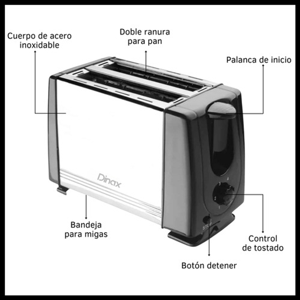 ¿Te acordás del clásico aroma a tostadas recién hechas en la casa de la abuela? ¿Qué tal un gran desayuno de pan tostado con manteca y mermelada? Con la tostadora Dinax TOS-TM900SECO1 te asegurarás un resultado parejo y crujiente. Preparar colaciones será una tarea sencilla y práctica. ¡Hacelas con tus ingredientes favoritos! Además, su diseño elegante y funcional destacará en tu cocina.