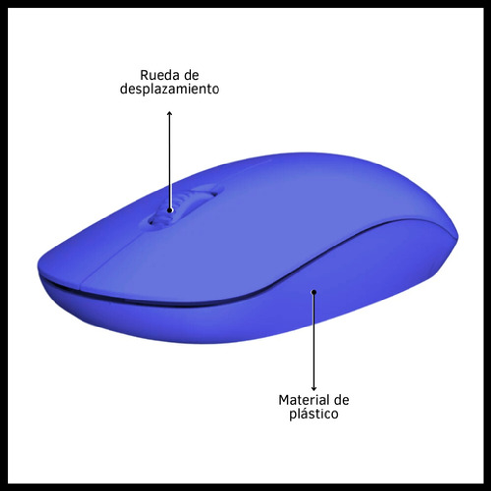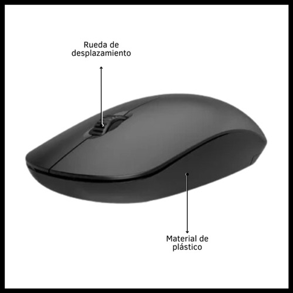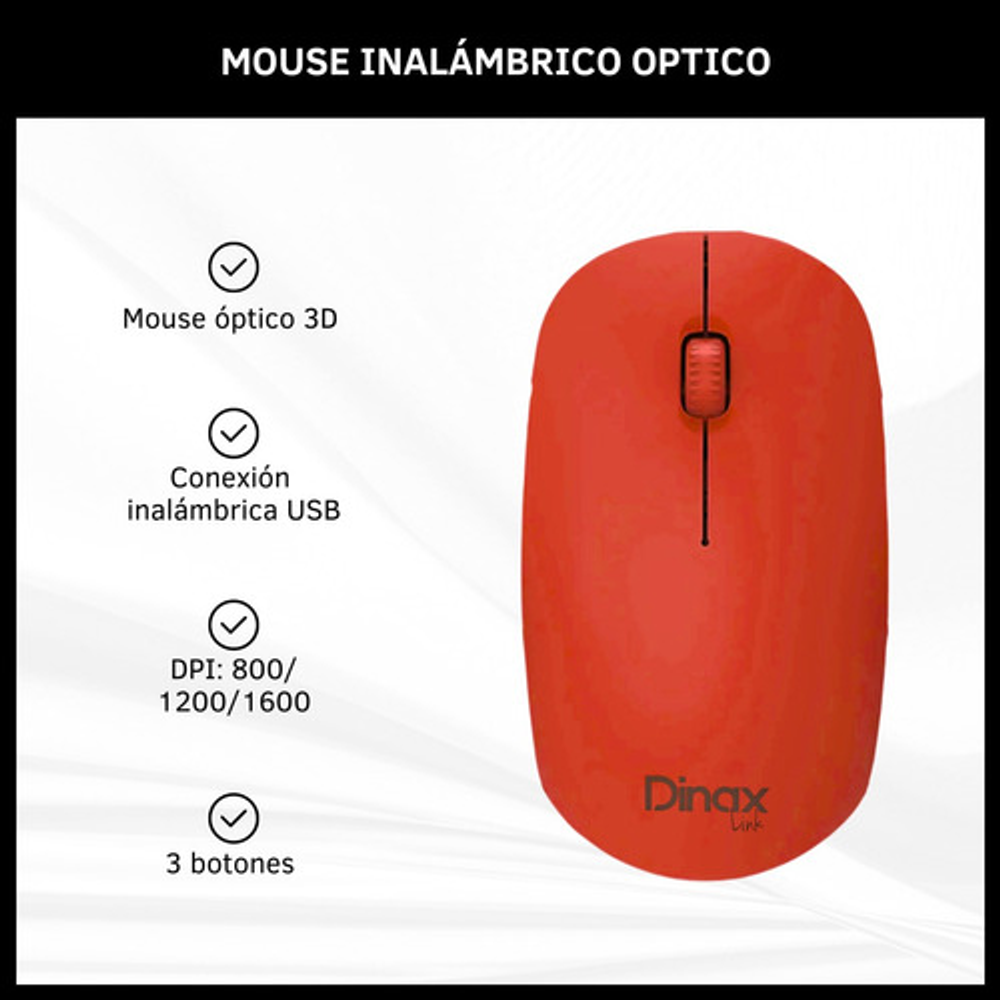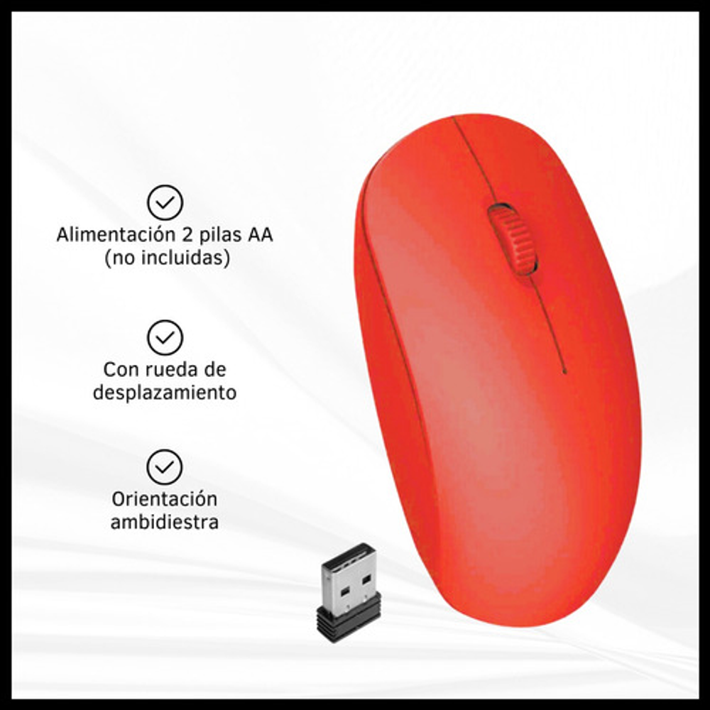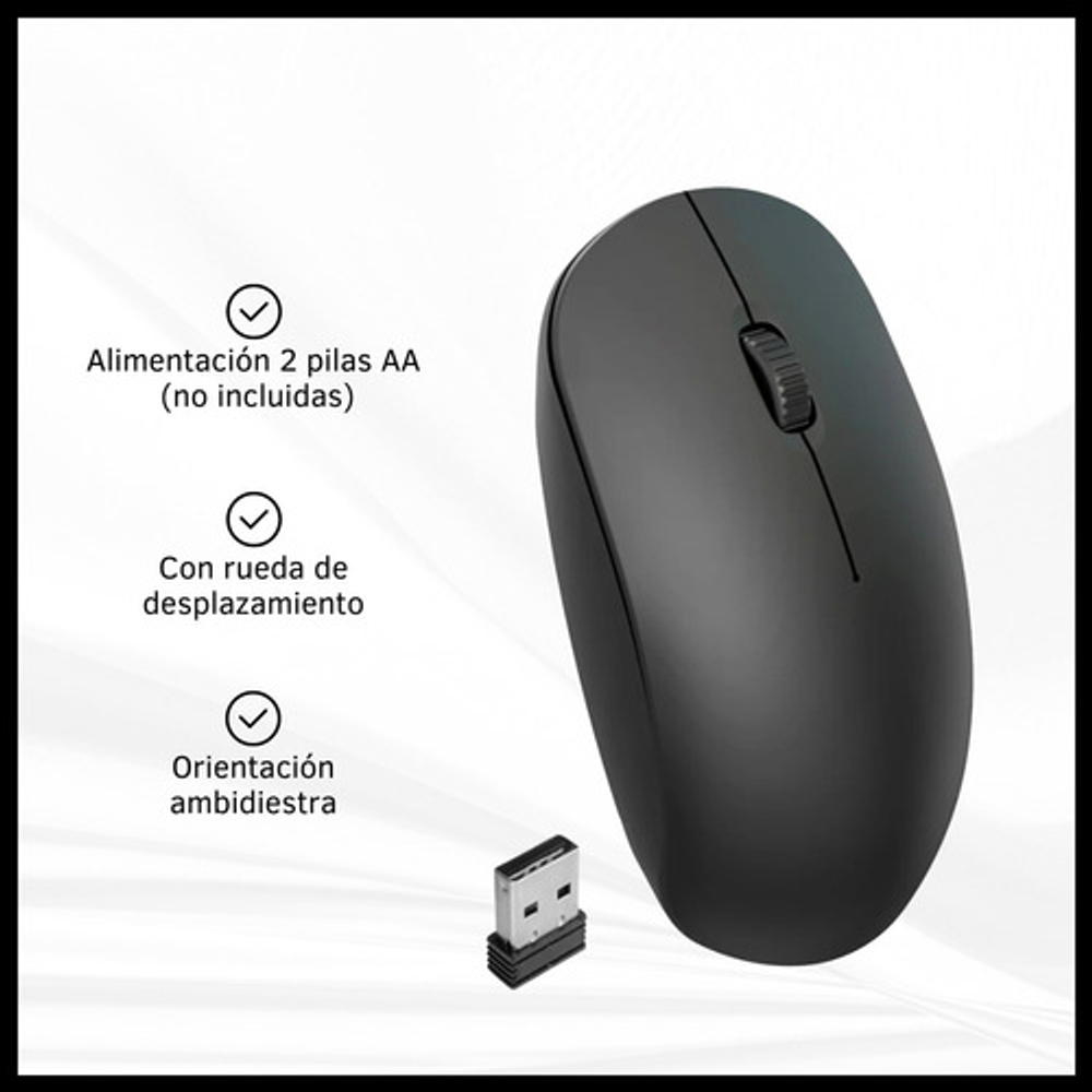 Características: -3 botones. -Liviano, cómodo y preciso. -DPI regulable 800/1200/1600 -Con rueda de desplazamiento. -Orientación de la mano: ambidiestro. -Funciona con 2 pilas AA (no incluidas). -Conexión inalámbrica con receptor USB. -Ideal para usar con tu notebook o tu PC de escritorio.