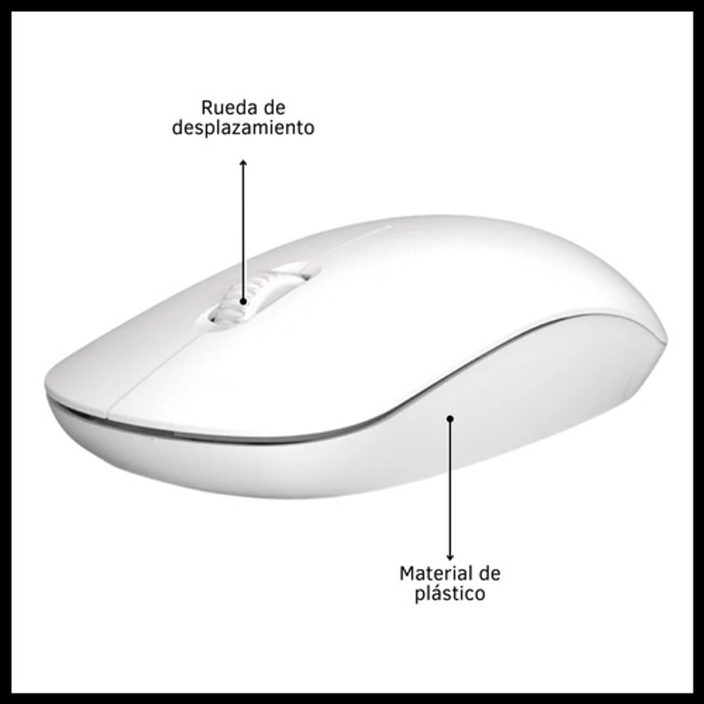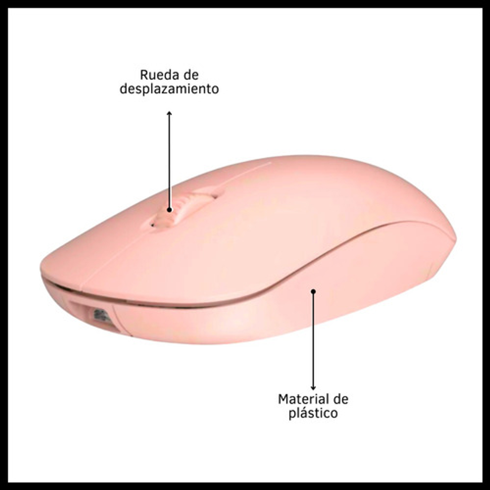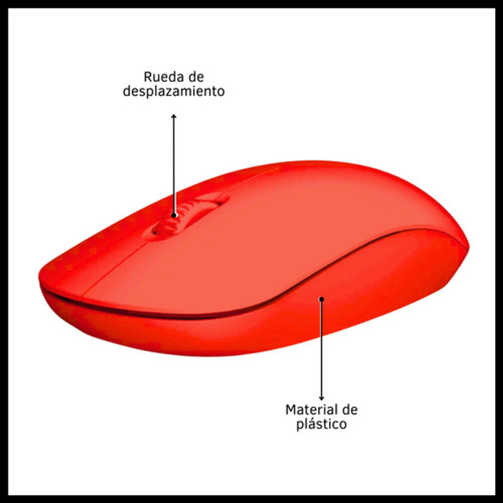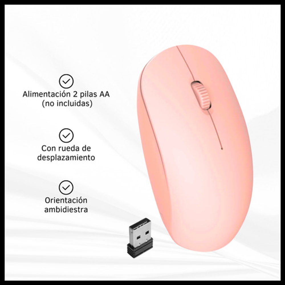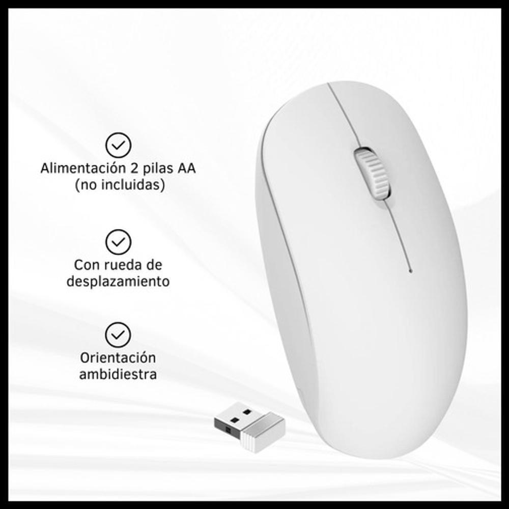 Características: -3 botones. -Liviano, cómodo y preciso. -DPI regulable 800/1200/1600 -Con rueda de desplazamiento. -Orientación de la mano: ambidiestro. -Funciona con 2 pilas AA (no incluidas). -Conexión inalámbrica con receptor USB. -Ideal para usar con tu notebook o tu PC de escritorio.