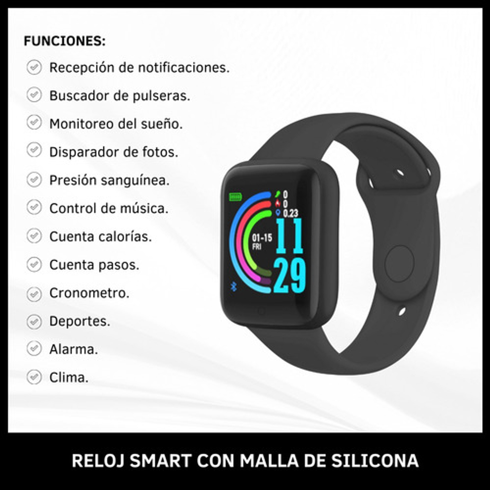 Funciones del smartwatch: Alarmas,Bluetooth,Calorías,Contadordepaso,Control de sueño,Distancia,controlcardíaco
