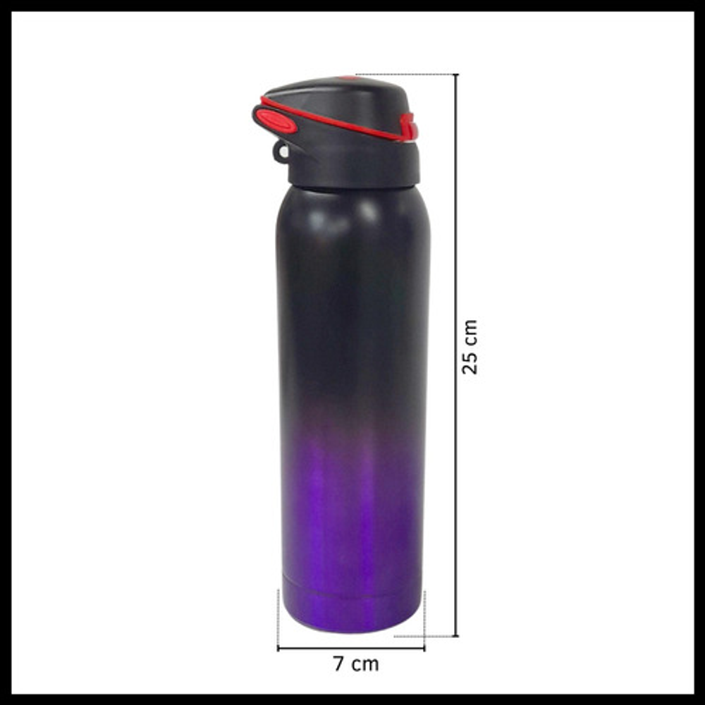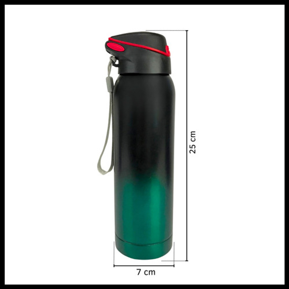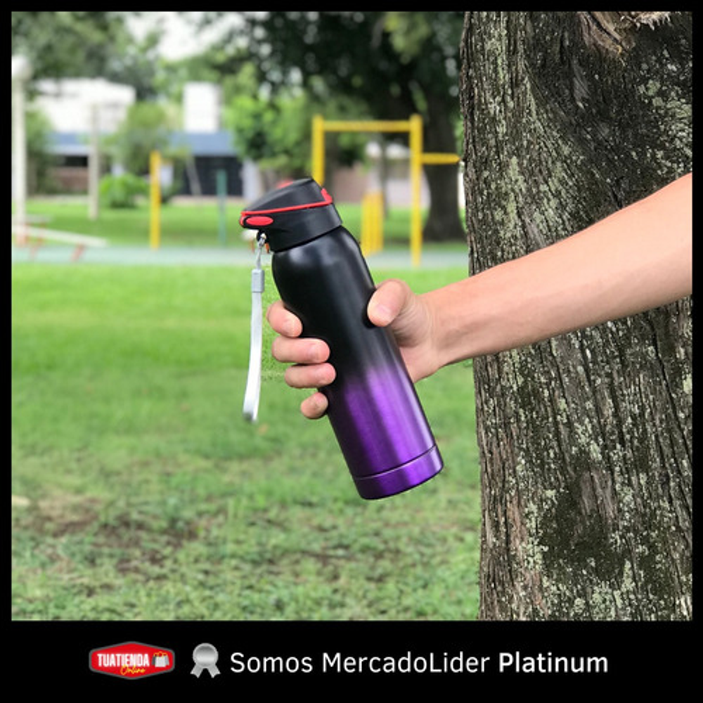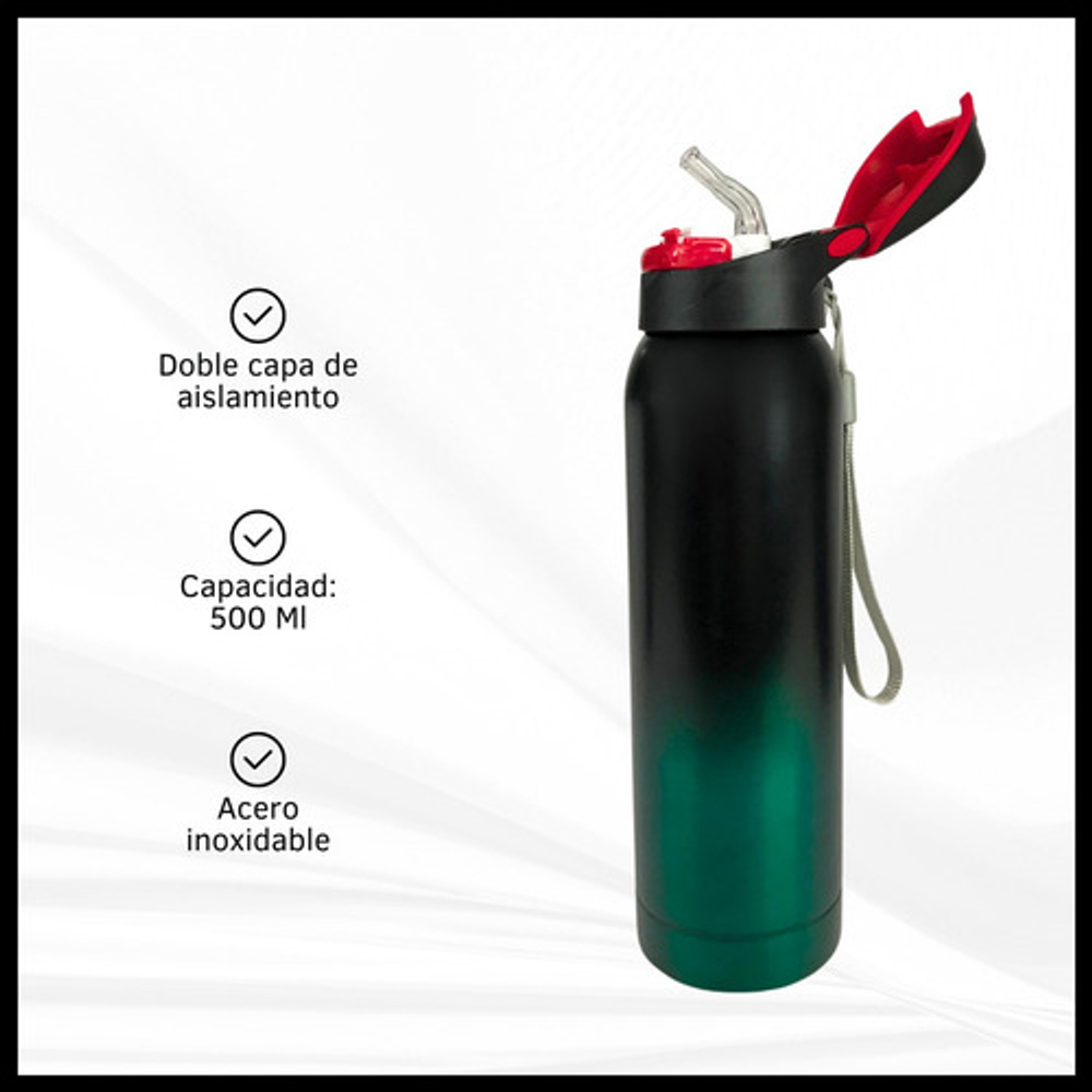 Características de la botella: • Mantiene bebidas frías. • Fabricada en acero inoxidable. • Tapa antiderrame. • Capacidad de 500ml.
