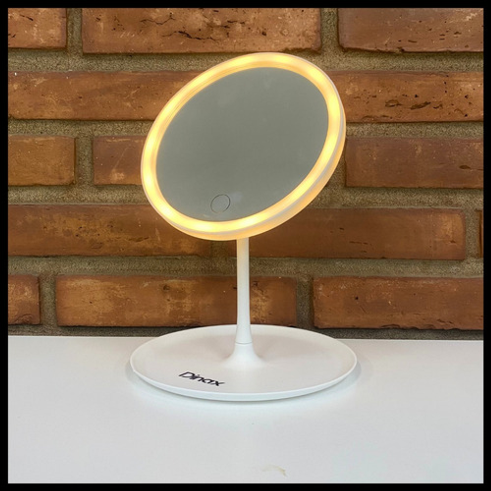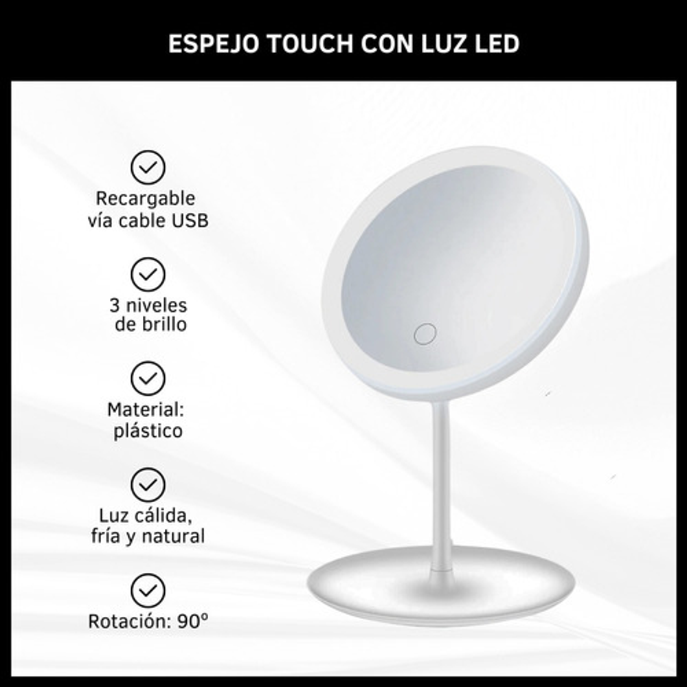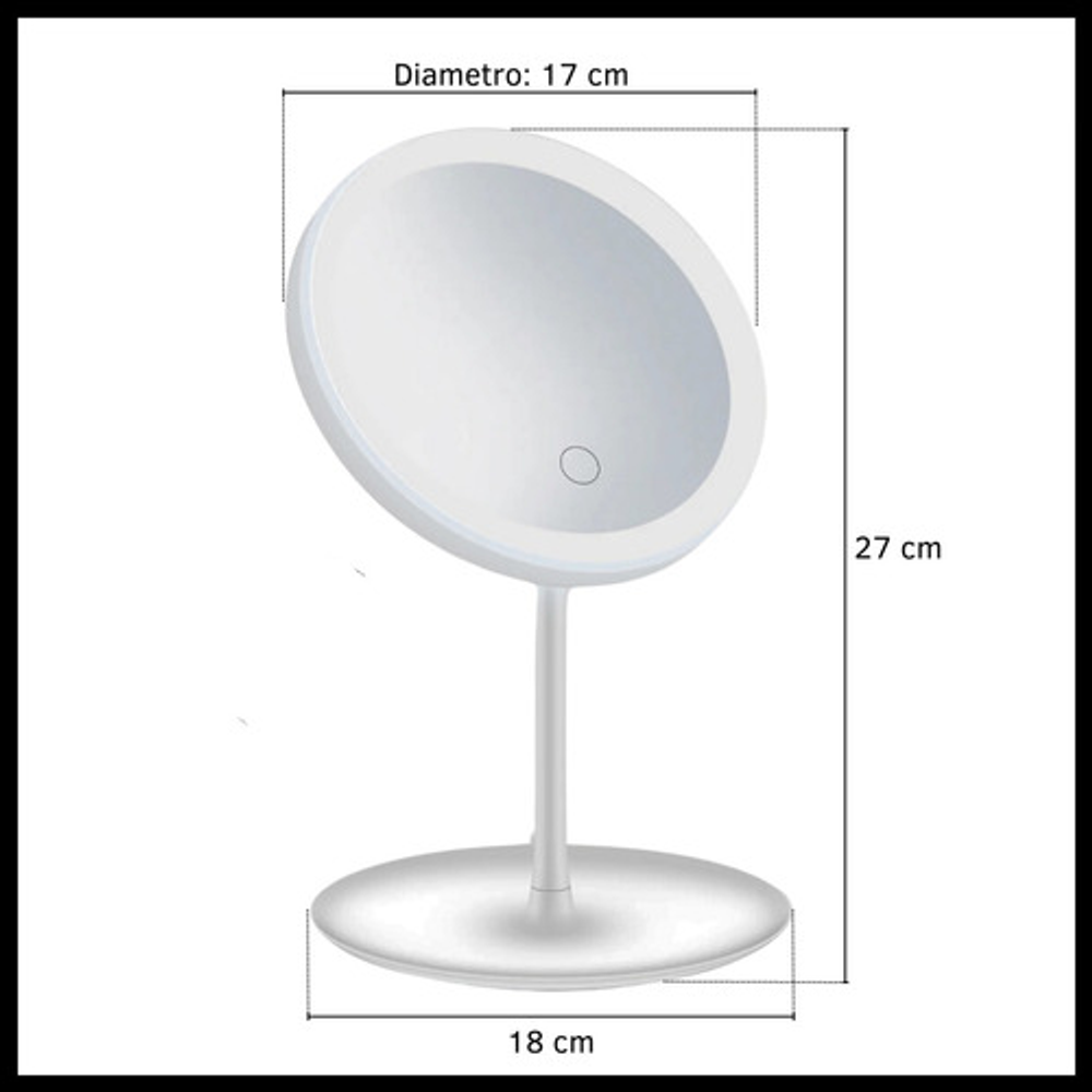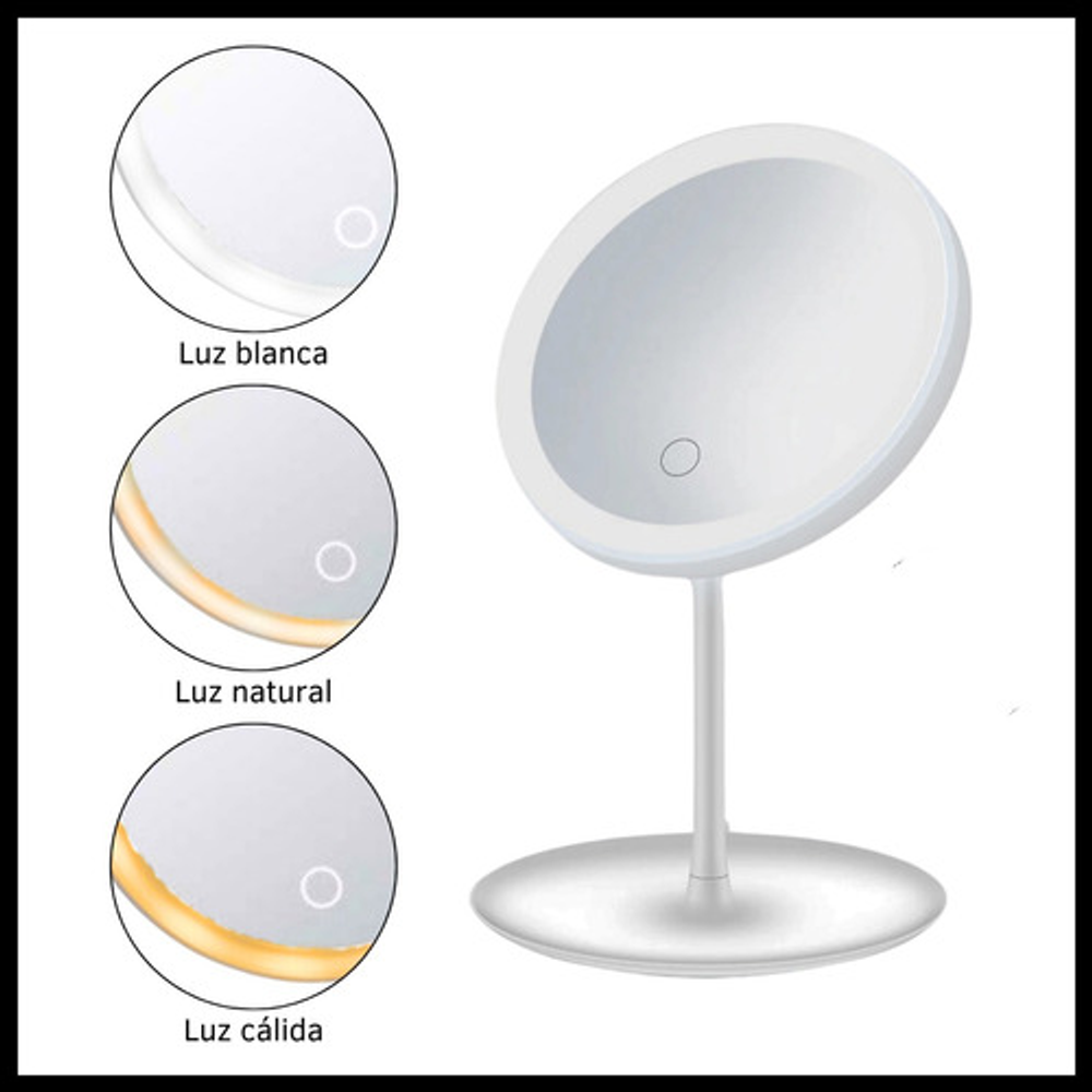 Características: • Equipado con luces LED alrededor del borde del espejo. • 3 Tonos de luz led y diferentes niveles de brillo. • Diseño compacto y portátil. • Recargable con cable USB.