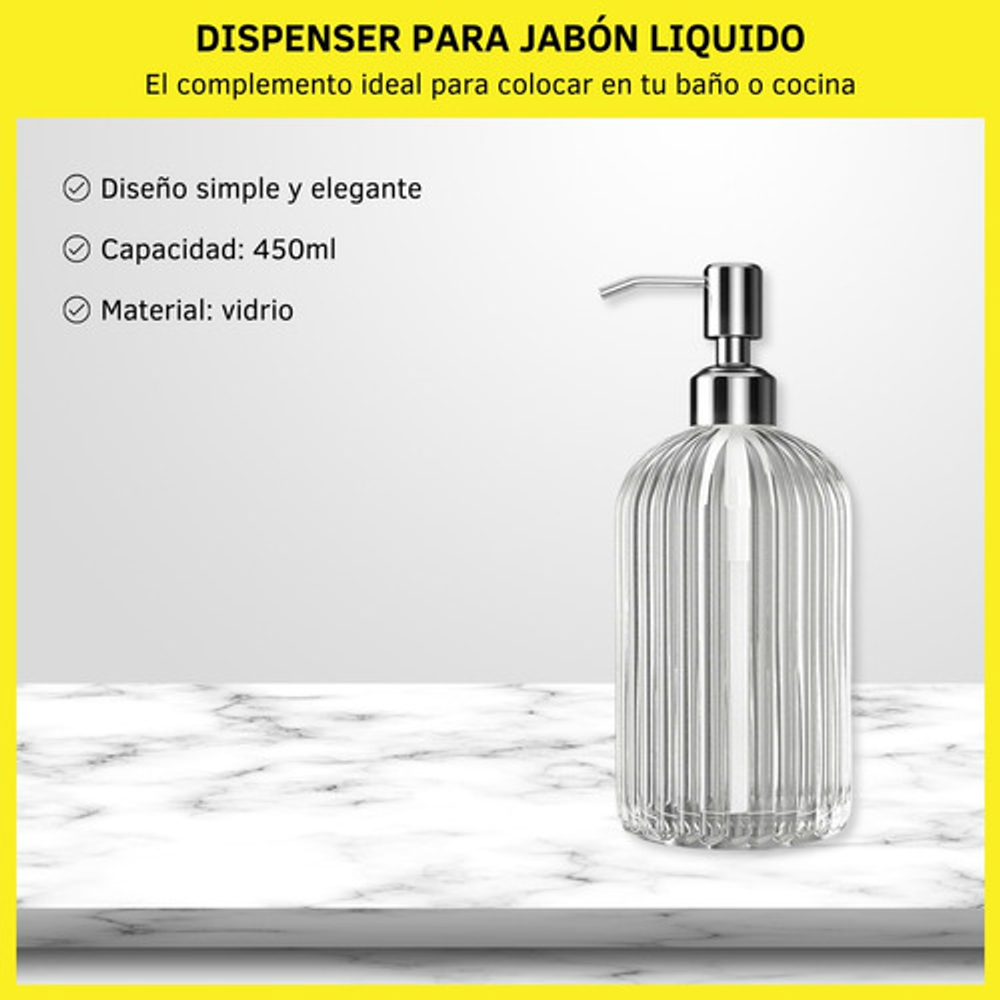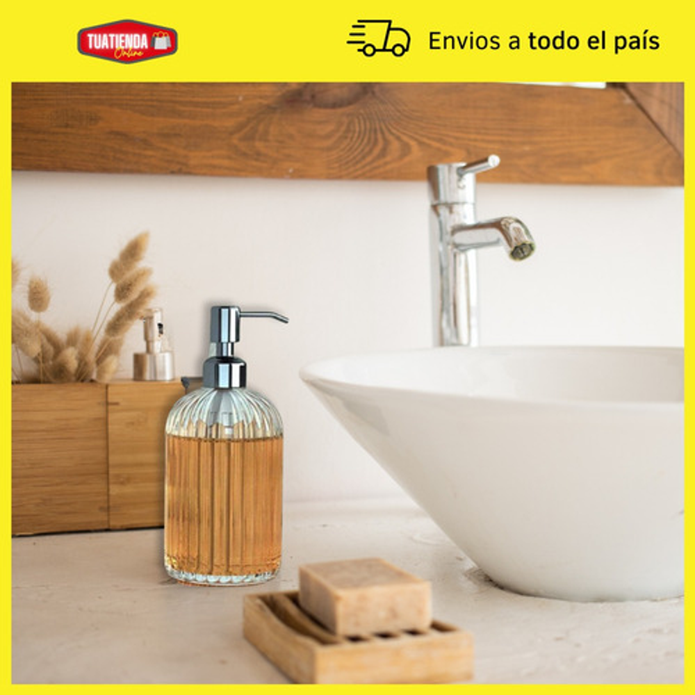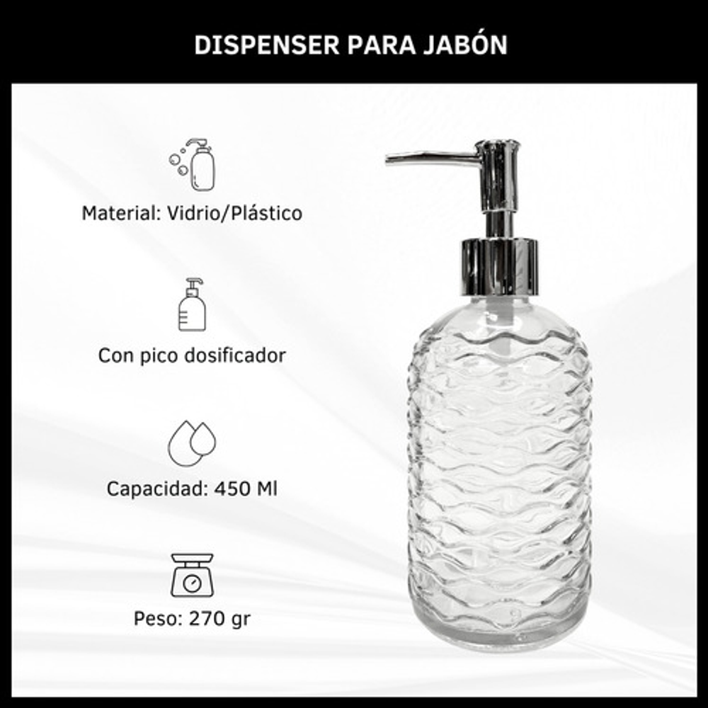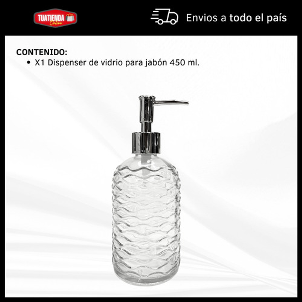 DISPENSER DE JABÓN DE 450ML https://articulo.mercadolibre.com.ar/MLA-1220872906-dispenser-dosificador-de-vidrio-para-jabon-liquido-450ml-_JM