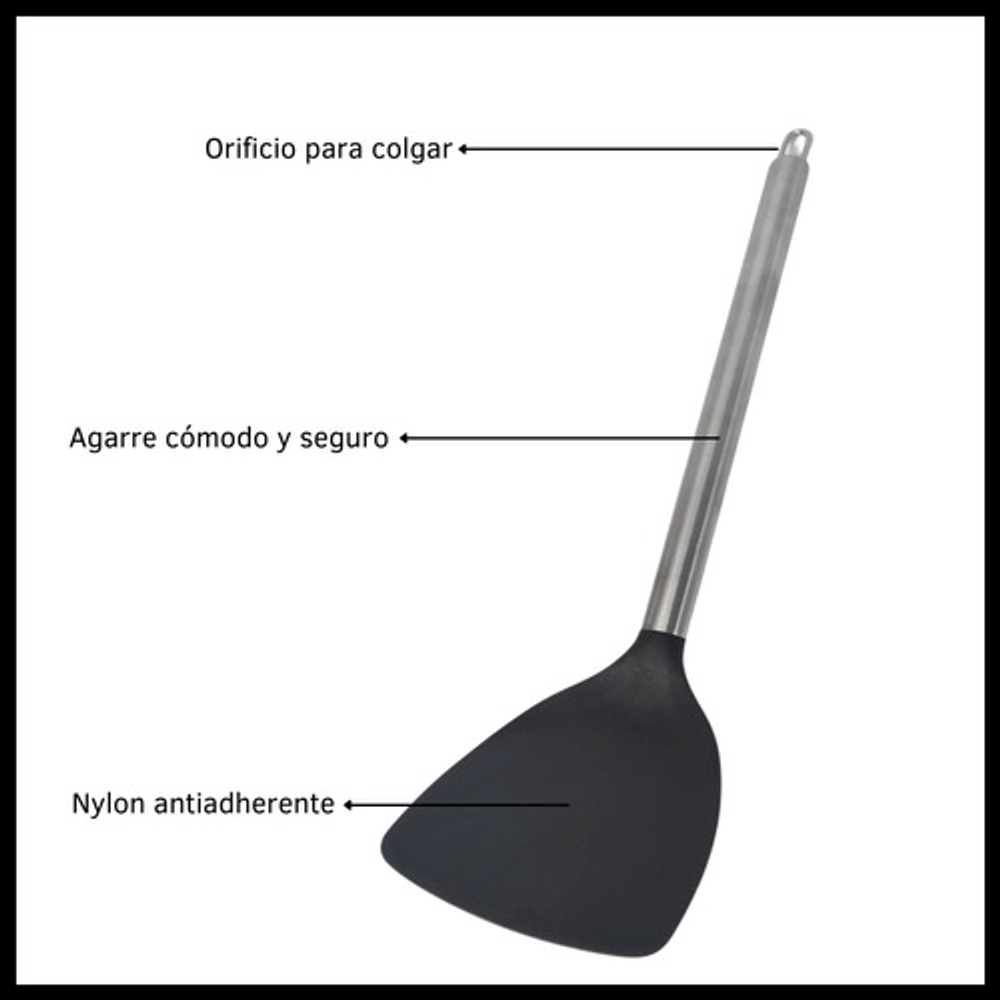 Características: • Resistente a altas temperaturas. • Espátula de nylon antiadherente. • Incluye orificio para colgar. • Mango de acero. • Multiuso.