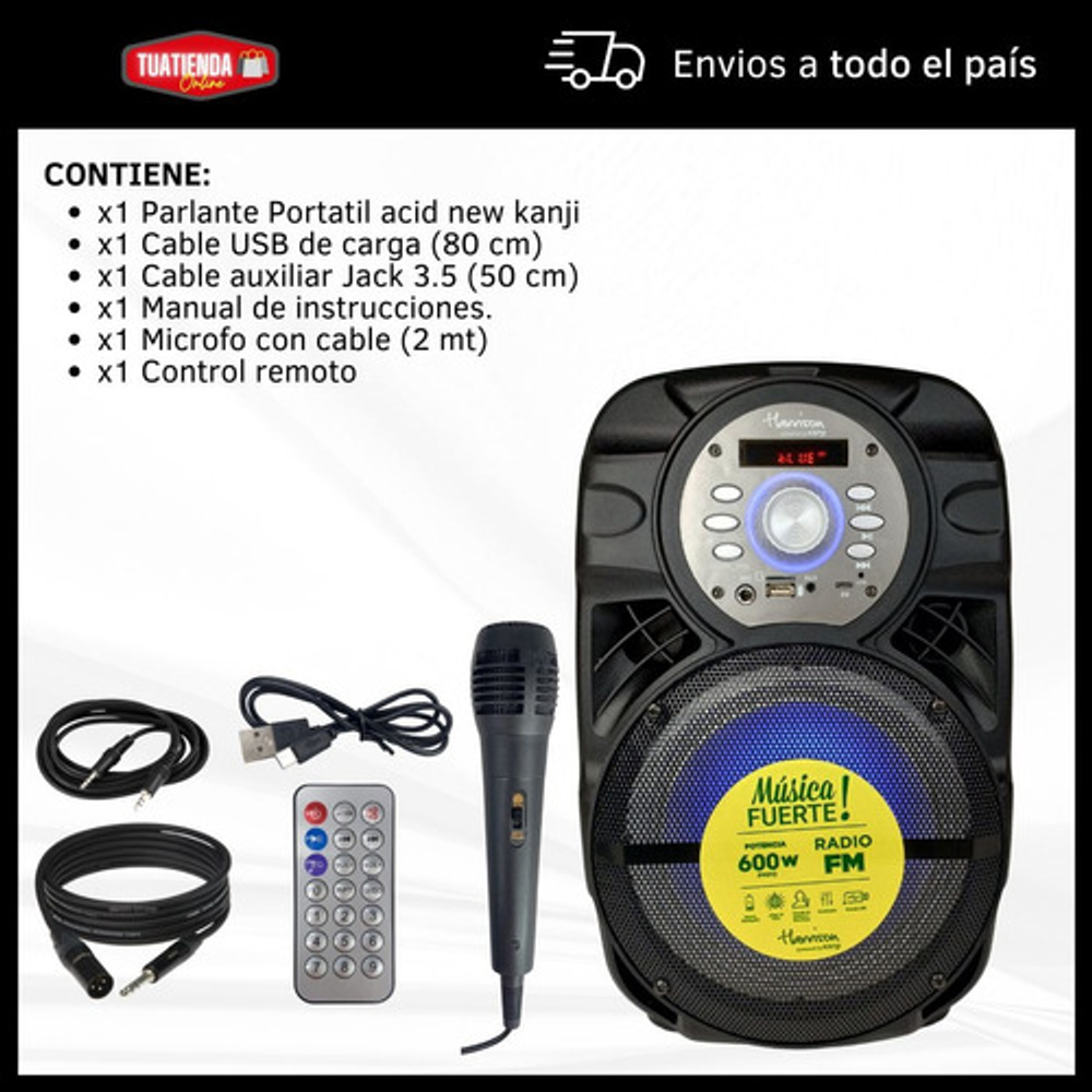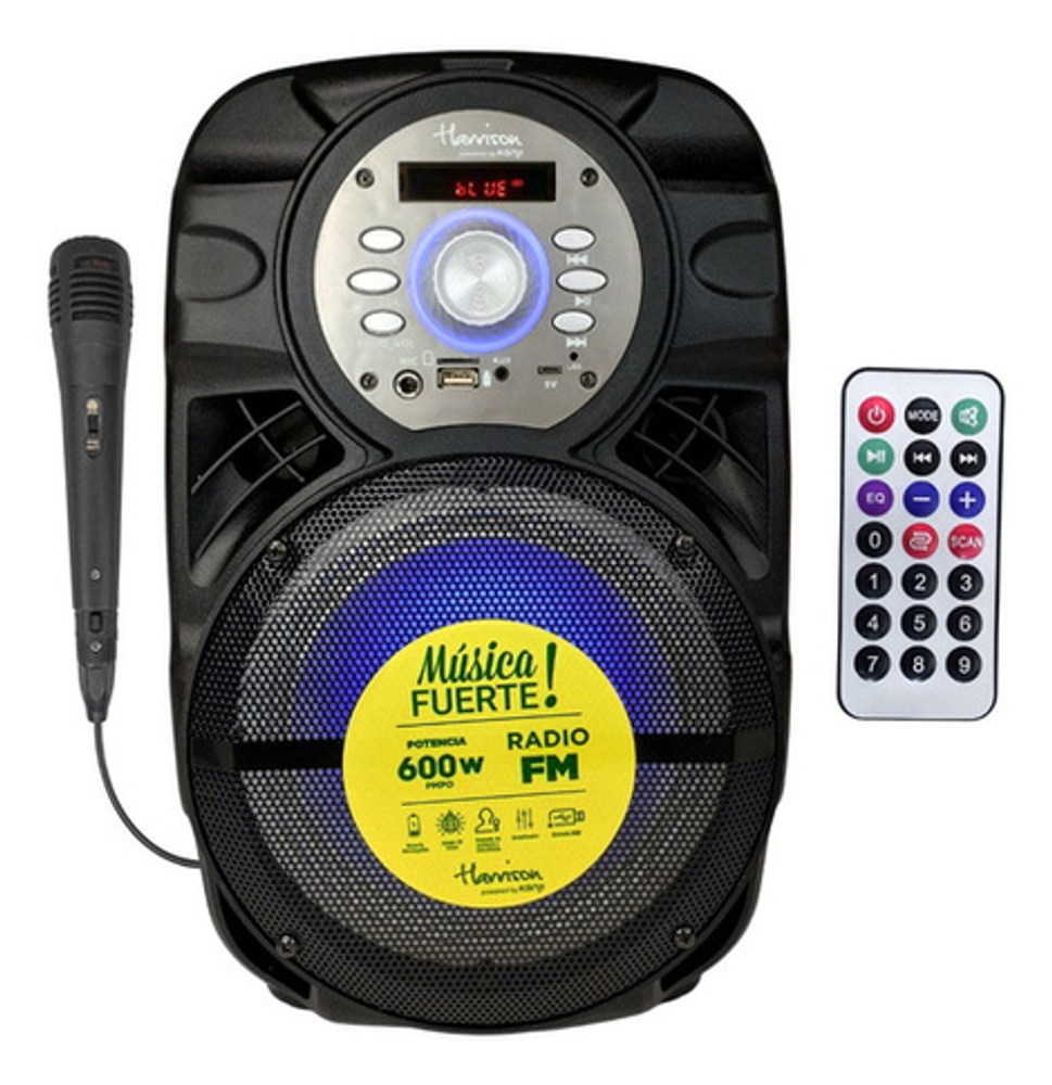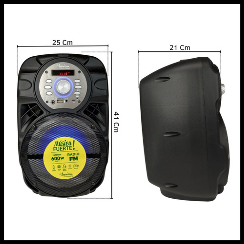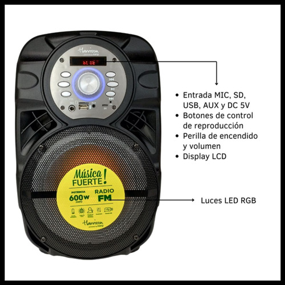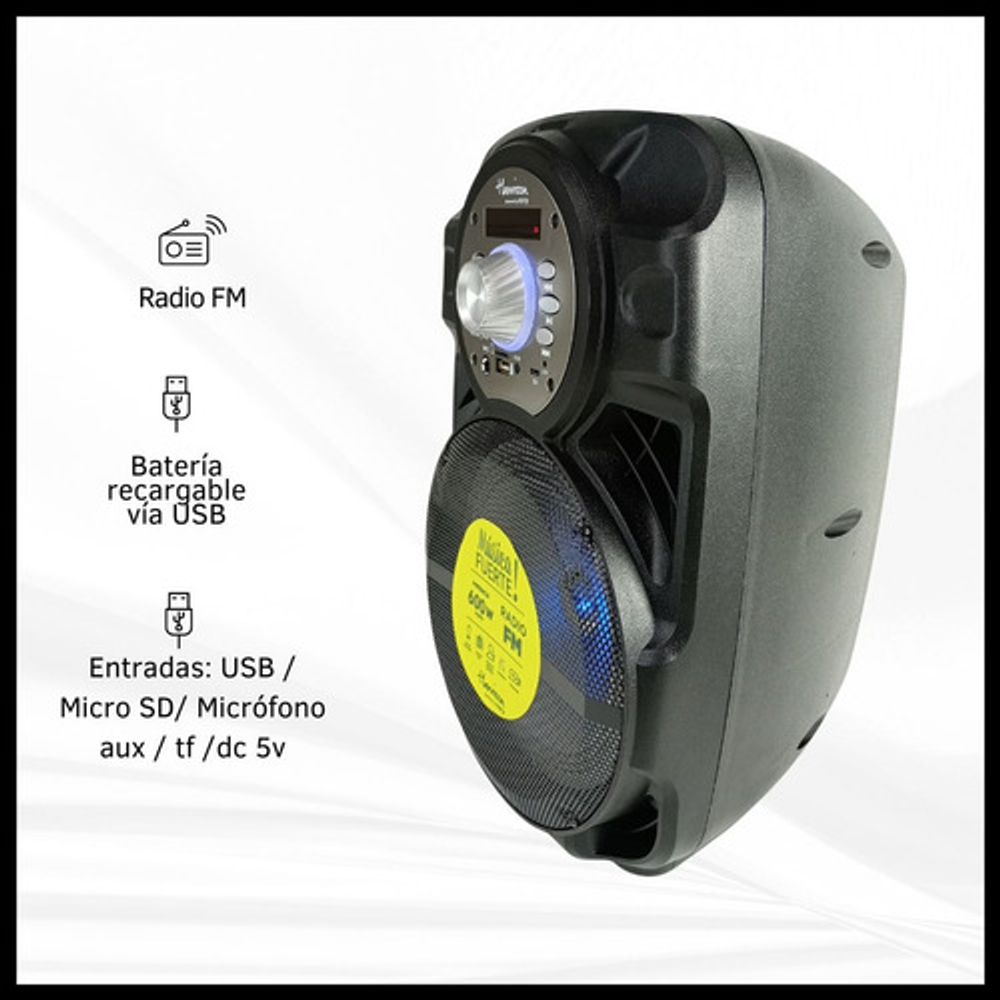 Características: -Luces LED/RGB -Conexión Bluetooth -Potencia 600W PMPO -Radio FM -Batería recargable vía USB