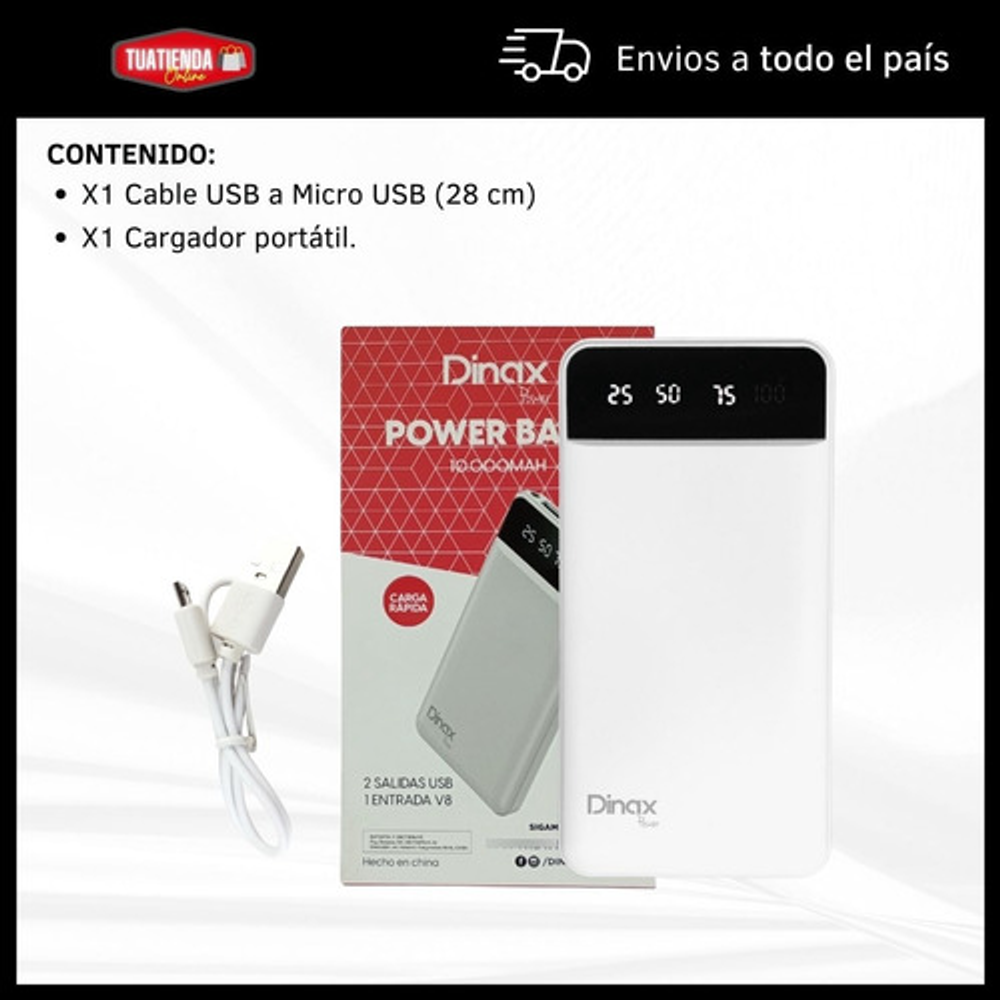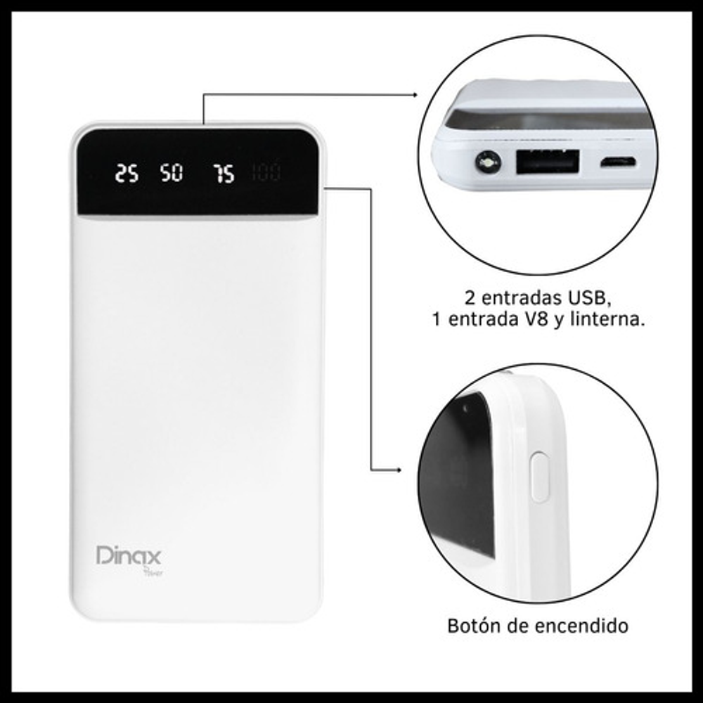 Características: • Carga rápida. • Capacidad de 10.000mah • Doble entrada USB y 1 entrada V8. • Incluye linterna. • Incluye cable de carga USB a V8. • Diseño compacto y liviano. • Compatible con una gran variedad de dispositivos.