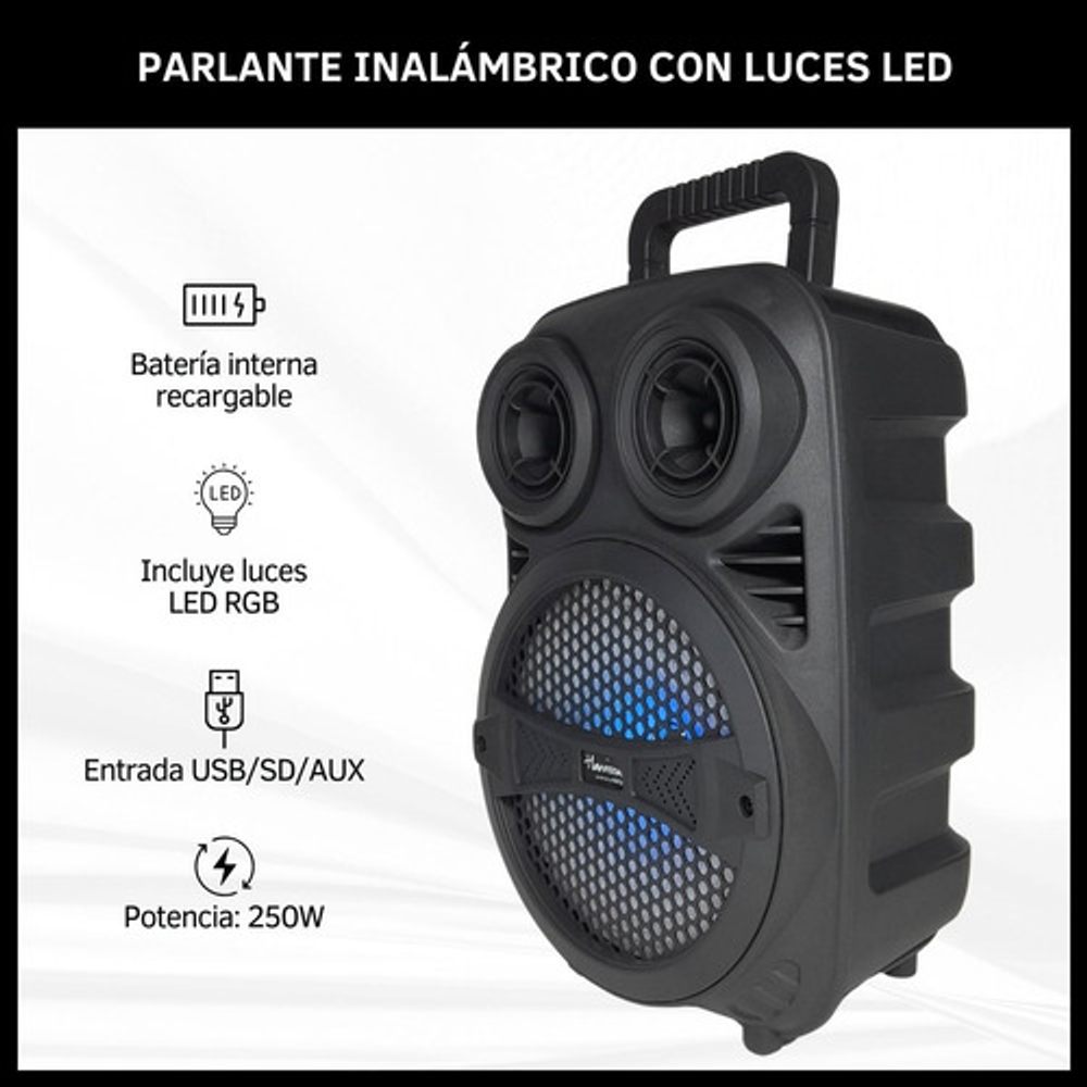PARLANTE INALÁMBRICO CON LUCES LED, MICRÓFONO Y CONTROL REMOTO: https://articulo.mercadolibre.com.ar/MLA-1363491985-parlante-inalambrico-con-luces-led-y-microfono-bt-fm-sd-usb-_JM